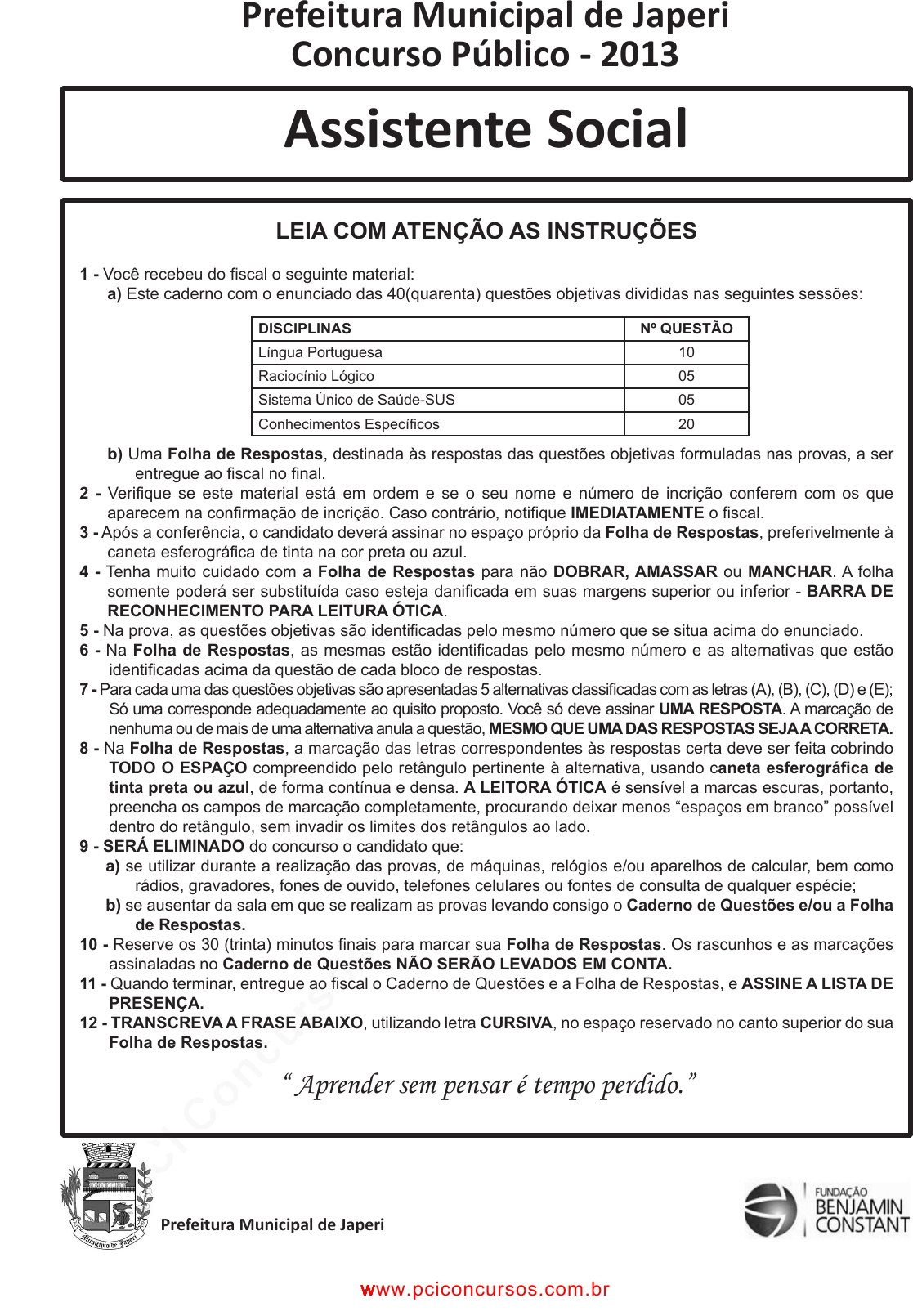 pcimarkpci MDAwMDowMDAwOjAwMDA6MDAwMDowMDAwOmZmZmY6MzZlOTpjMjU5:U2F0LCAxOCBTZXAgMjAyMSAwMzowMDozNiAtMDMwMA== LEIA COM ATENÇÃO AS INSTRUÇÕES 1 - Você recebeu do fiscal o seguinte material: a) Este caderno com o enunciado das 40(quarenta) questões objetivas divididas nas seguintes sessões: DISCIPLINAS Nº QUESTÃO Língua Portuguesa 10 Raciocínio Lógico 05 Sistema Único de Saúde-SUS 05 Conhecimentos Específicos 20 b) Uma Folha de Respostas, destinada às respostas das questões objetivas formuladas nas provas, a ser entregue ao fiscal no final. 2 - Verifique se este material está em ordem e se o seu nome e número de incrição conferem com os que aparecem na confirmação de incrição. Caso contrário, notifique IMEDIATAMENTE o fiscal. 3 - Após a conferência, o candidato deverá assinar no espaço próprio da Folha de Respostas, preferivelmente à caneta esferográfica de tinta na cor preta ou azul. 4 - Tenha muito cuidado com a Folha de Respostas para não DOBRAR, AMASSAR ou MANCHAR. A folha somente poderá ser substituída caso esteja danificada em suas margens superior ou inferior - BARRA DE RECONHECIMENTO PARA LEITURA ÓTICA. 5 - Na prova, as questões objetivas são identificadas pelo mesmo número que se situa acima do enunciado. 6 - Na Folha de Respostas, as mesmas estão identificadas pelo mesmo número e as alternativas que estão identificadas acima da questão de cada bloco de respostas. 7 - Para cada uma das questões objetivas são apresentadas 5 alternativas classificadas com as letras (A), (B), (C), (D) e (E); Só uma corresponde adequadamente ao quisito proposto. Você só deve assinar UMA RESPOSTA. A marcação de nenhuma ou de mais de uma alternativa anula a questão, MESMO QUE UMA DAS RESPOSTAS SEJA A CORRETA. 8 - Na Folha de Respostas, a marcação das letras correspondentes às respostas certa deve ser feita cobrindo TODO O ESPAÇO compreendido pelo retângulo pertinente à alternativa, usando caneta esferográfica de tinta preta ou azul, de forma contínua e densa. A LEITORA ÓTICA é sensível a marcas escuras, portanto, preencha os campos de marcação completamente, procurando deixar menos “espaços em branco” possível dentro do retângulo, sem invadir os limites dos retângulos ao lado. 9 - SERÁ ELIMINADO do concurso o candidato que: a) se utilizar durante a realização das provas, de máquinas, relógios e/ou aparelhos de calcular, bem como rádios, gravadores, fones de ouvido, telefones celulares ou fontes de consulta de qualquer espécie; b) se ausentar da sala em que se realizam as provas levando consigo o Caderno de Questões e/ou a Folha de Respostas. 10 - Reserve os 30 (trinta) minutos finais para marcar sua Folha de Respostas. Os rascunhos e as marcações assinaladas no Caderno de Questões NÃO SERÃO LEVADOS EM CONTA. 11 - Quando terminar, entregue ao fiscal o Caderno de Questões e a Folha de Respostas, e ASSINE A LISTA DE PRESENÇA. 12 - TRANSCREVA A FRASE ABAIXO, utilizando letra CURSIVA, no espaço reservado no canto superior do sua Folha de Respostas. “ Aprender sem pensar é tempo perdido.” Assistente Social Prefeitura Municipal de Japeri Concurso Público - 2013 Prefeitura Municipal de Japeri www.pciconcursos.com.br www.pciconcursos.com.br www.pciconcursos.com.br www.pciconcursos.com.br www.pciconcursos.com.br www.pciconcursos.com.br www.pciconcursos.com.br www.pciconcursos.com.br www.pciconcursos.com.br www.pciconcursos.com.br pcimarkpci MDAwMDowMDAwOjAwMDA6MDAwMDowMDAwOmZmZmY6MzZlOTpjMjU5:U2F0LCAxOCBTZXAgMjAyMSAwMzowMDozNiAtMDMwMA== www.pciconcursos.com.br www.pciconcursos.com.br www.pciconcursos.com.br www.pciconcursos.com.br www.pciconcursos.com.br www.pciconcursos.com.br www.pciconcursos.com.br www.pciconcursos.com.br www.pciconcursos.com.br www.pciconcursos.com.br pcimarkpci MDAwMDowMDAwOjAwMDA6MDAwMDowMDAwOmZmZmY6MzZlOTpjMjU5:U2F0LCAxOCBTZXAgMjAyMSAwMzowMDozNiAtMDMwMA== Pag. 3ASSISTENTE SOCIAL Prefeitura Municipal de Japeri CONCURSO PÚBLICO-2013 LINGUA PORTUGUESA Texto para as questões 1, 2, 3 e 4. Depois Depois de sonhar tantos anos, De fazer tantos planos De um futuro pra nós. Depois de tantos desenganos, Nós nos abandonamos como tantos casais Quero que você seja feliz Hei de ser feliz também Depois de varar madrugada Esperando por nada De arrastar-me no chão Em vão Tu viraste-me as costas Não me deu as respostas Que eu preciso escutar Quero que você seja melhor Hei de ser melhor também Nós dois Já tivemos momentos Mas passou nosso tempo Não podemos negar Foi bom Nós fizemos histórias Pra ficar na memória E nos acompanhar Quero que você viva sem mim Eu vou conseguir também Depois de aceitarmos os fatos Vou trocar seus retratos pelos de um outro alguém Meu bem Vamos ter liberdade Para amar à vontade Sem trair mais ninguém Quero que você seja feliz Hei de ser feliz também Depois (Arnaldo Antunes/Carlinhos Brown/Marisa Monte) (Disponível em: http://www.vagalume.com.br/marisa-monte/depois.html) QUESTÃO 1 O texto acima mostra: (A) o reencontro do casal; (B) a separação do casal; (C) a união do casal depois de altos e baixos; (D) a união do casal depois de alguns desenganos; (E) o início do relacionamento. QUESTÃO 2 A ideia de traição no relacionamento está expressa nos seguintes versos: (A) “Depois de varar madruga/Esperando por nada” (B) “Não me deu as respostas/Que eu preciso escutar” (C) “Vamos ter liberdade/Para amar a vontade/Sem trair mais ninguém” (D) “Já tivemos momentos/Mas passou nosso tempo/ Não podemos negar” (E) “Quero que você seja feliz/Hei de ser feliz também/ Depois” QUESTÃO 3 O relacionamento chegou ao fim. Essa conclusão fica clara nos versos: (A) “Depois de varar madrugada/Esperando por nada” (B) “Já tivemos momentos/Mas passou nosso tempo/Não podemos negar” (C) “De fazer tantos planos/de um futuro pra nós” (D) “De arrastar-me no chão/Em vão” (E) “Não me deu as resposta/Que eu preciso escutar” QUESTÃO 4 A s