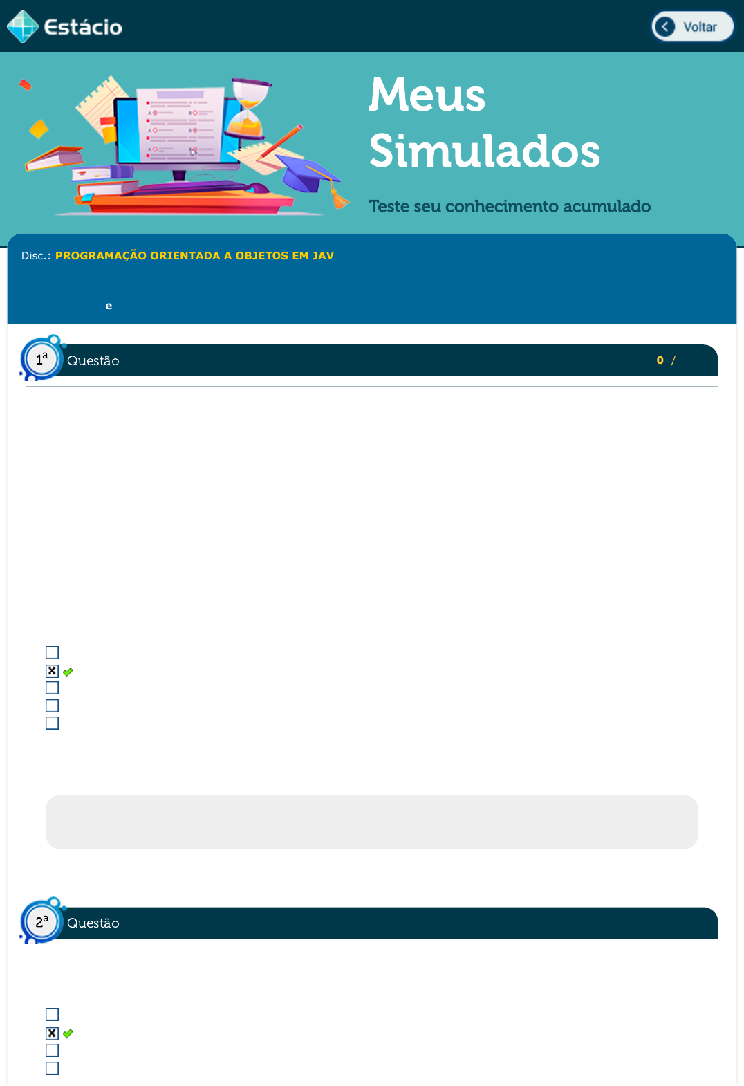 1/29/23, 4:08 PM Estácio: Alunos https://simulado.estacio.br/bdq_simulados_avaliacao_parcial_resultado.asp?cod_hist_prova=302332061&cod_prova=6011749001&f_cod_disc= 1/5 Meus Simulados Teste seu conhecimento acumulado Disc.: PROGRAMAÇÃO ORIENTADA A OBJETOS EM JAVA Aluno(a): IGOR ROBERTO DE LIMA 202208150349 Acertos: 10,0 de 10,0 29/01/2023 Acerto: 1,0 / 1,0 (FUNRIO − 2018 − Câmara de São João de Meriti/ RJ − Analista Legislativo − Analista em Tecnologia − Adaptada) No que diz respeito à criação de métodos em Java, observe o fragmento a seguir. O qualificador, também conhecido por modificador, define a visibilidade e pode ser de três tipos básicos: I. O método é visível apenas pela própria classe. É o qualificador mais restritivo. II. O método é visível pela própria classe, por suas subclasses e pelas classes do mesmo pacote. III. O método é visível por qualquer classe. É o qualificador mais aberto no sentido de que qualquer classe pode usar este método. Os tipos básicos dos modificadores descritos em I, II e III são, respectivamente: "Public", "private" e "protected". "Private", "protected" e "public". "Protected", "private" e "public". "Protected", "public" e "private". "Private", "public" e "protected". Respondido em 29/01/2023 15:17:22 Explicação: Resposta correta: "Private", "protected" e "public". Acerto: 1,0 / 1,0 (VUNESP - 2020 - FITO - Técnico em Gestão - Informática) No Java, a classe que implementa uma lista ordenada que permite a inclusão de elementos nulos (null) é: HashSet ArrayList List Collection Questão1 a Questão2 a https://simulado.estacio.br/alunos/inicio.asp javascript:voltar(); 1/29/23, 4:08 PM Estácio: Alunos https://simulado.estacio.br/bdq_simulados_avaliacao_parcial_resultado.asp?cod_hist_prova=302332061&cod_prova=6011749001&f_cod_disc= 2/5 HashMap Respondido em 29/01/2023 15:18:30 Explicação: Resposta correta: ArrayList Acerto: 1,0 / 1,0 (ACCESS/2020) No que diz respeito à criação de métodos em Java, o qualificador ou modificador define a visibilidade e pode ser de três tipos básicos: I. é visível apenas pela própria classe. É o qualificador mais restritivo. II. é visível pela própria classe, por suas subclasses e pelas classes do mesmo pacote. III. é visível por qualquer classe, sendo o qualificador mais aberto no sentido de que qualquer classe pode usar esse método. Os métodos definidos em I, II e III são respectivamente denominados Protected, private e public. Private, protected e public. Protected, public e private. Private, public e protected. Public, protected e private. Respondido em 29/01/2023 15:20:49 Explicação: Private é o mais restritivo dos qualificadores, sendo visível apenas pela própria classe. Protected é visível pela própria classe, por suas subclasses e pelas classes do mesmo pacote. Public é o qualificador mais permissivo, sendo visível por qualquer classe. Acerto: 1,0 / 1,0 Ano: 2009 Banca: INSTITUTO CIDADES Órgão: UNIFESP Prova: INSTITUTO CIDADES - 2009 - UNIFESP - Analista de Tecnologia da Informação (ADAPTADA) Acerca do método equals, analise as seguintes afirmativas: I. O equals recebe um Object como argumento e verifica se ele mesmo é igual ao Object recebido para retornar um boolean exclusivamente false. II. Um exemplo do uso do equals é para datas. Se usarmos criar duas datas, isto é, dois objetos diferentes, contendo 18/08/2009, ao comparar com o ==, receberá false, pois são referências para objetos diferentes. III. Quando comparamos duas variáveis referência no Java, o == verifica se as duas variáveis se referem ao mesmo objeto. Podemos afirmar corretamente que: As afirmativas I e II estão corretas. Apenas a afirmativa III está correta. Apenas a afirmativa I está correta. As afirmativas II e III estão corretas. Apenas a afirmativa II está correta. Respondido em 29/01/2023 15:21:24 Questão3 a Questão4 a 1/29/23, 4:08 PM Estácio: Alunos https://simulado.estacio.br/bdq_simulados_avaliacao_parcial_resultado.asp?cod_hist_prova=302332061&cod_prova=6011749001&f_cod_disc= 3/5 Explicação: A resposta certa é: As afirmativas II e III estão corretas. Acerto: 1,0 / 1,0 (UNIRIO -Técnico de Tecnologia da Informação -2019) Em Java, a palavra-chave throws é usada para: Especificar os tipos de exceções que um dado método pode causar. Especificar os métodos que trataram uma dada exceção. Causar uma exceção e fornecer seus argumentos. Causar a exceção que está sendo tratada. Especificar um código a ser executado, após qualquer tratamento de exceção no bloco. Respondido em 29/01/2023 15:23:01 Explicação: A resposta certa é:Especificar os tipos de exceções que um dado método pode causar. Acerto: 1,0 / 1,0 (CESPE/CEBRASPE - TRE-MA - Técnico Judiciário - Programação de Sistemas) Um objeto de exceção possui, na linguagem Java, o método: Getchvar( ). getMessage( ). Getfor( ). Getprior( ). Getsign( ). Respondido em 29/01/2023 15:24:21 Explicação: A resposta certa é:getMessage( ). Acerto: 1,0 / 1,0 (AOCP - BRDE - Analista de Sistemas - 2012) Sobre Prioridade e Agendamento de Thread na linguagem de programação Java, analise as afirmações e assinale a(s) correta(s). I. Por padrão, toda thread recebe uma DEFAULT_PRIORITY (uma constante de 5). II. Toda thread do Java tem uma prioridade de thread que auxilia na ordenação em que estão agendadas. III. O agendamento de thread consegue garantir que, em diferentes sistemas operacionais, cada processo gastará a mesma fatia de tempo. IV. Em Java, cada nova thread herda a prioridade da thread que a cria. Apenas II, III e IV Apenas I, III e IV Questão5 a Questão6 a Questão7 a 1/29/23, 4:08 PM Estácio: Alunos https://simulado.estacio.br/bdq_simulados_avaliacao_parcial_resultado.asp?cod_hist_prova=302332061&cod_prova=6011749001&f_cod_disc= 4/5 Apenas II e IV Apenas I I, II, III e IV Respondido em 29/01/2023 15:24:51 Explicação: A resposta certa é : Apenas II e IV Acerto: 1,0