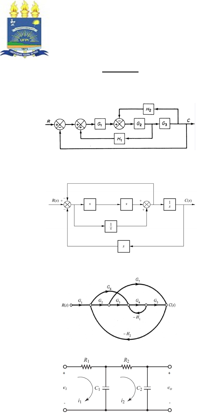 UNIVERSIDADE FEDERAL DO PIAUÍ CENTRO DE TECNOLOGIA CURSO DE ENGENHARIA ELÉTRICA DISCIPLINA: SISTEMAS DE CONTROLE Exercícios Questão 01: Encontre a função de transferência C(s)/R(s) do sistema abaixo, realizando a redução do diagrama de blocos. Questão 02: Encontre a função de transferência C(s)/R(s) do sistema abaixo, realizando a redução do diagrama de blocos. Questão 03: Encontre a função de transferência C(s)/R(s) do sistema abaixo, realizando a redução do diagrama de fluxo de sinal. Questão 04: Determine, para o circuito abaixo, a função de transferência G(s) = Eo(s)/Ei(s). Questão 05: Encontre o modelo por variaveis de estado do sistema abaixo, considerando como entrada a força u, e como saídas, os deslocamentos d1 e d2. Questão 06: A partir do sistema abaixo, obtenha a representação no Espaço de Estados, considerando a entrada como sendo u(t) e a saída x(t). Considere: K = 4 e m = 1. Em seguida, mostre como converter, de forma detalhada, o modelo obtido para representação em Função de Transferência. Questão 07: Para cada uma das funções de transferência a seguir, classifique os sistemas com relação ao seu amortecimento, considerando a entrada como sendo um degrau unitário. Dado que essas funções estão em malha fechada, mostre as suas representações em malha aberta. Questão 08: Dado o diagrama de blocos abaixo, encontre a expressão matemática para C(s), em relação as entradas R(s) e PT(s). Em seguida, encontre o erro em regime permanente da saída do sistema considerando como entradas PT(s) = 2,5/s e R(s) = 0. Questão 09: Dada um sistema cuja função de transferência em malha aberta é descrita abaixo, determine: a) O ganho DC da função de transferência em malha fechada; b) Qual o tipo da função de transferência em malha aberta, com relação ao número de integradores? c) Dado que seja aplicado um degrau unitário como sinal de referencia, calcule, detalhadamente, o erro em regime permanente; d) O valor de regime permanente da saída do sistema, em malha fechada, quando a entrada for um degrau de amplitude igual a dois (r(t) = 2); Questão 10: Para um sistema que apresenta como resposta o gráfico abaixo, determine: a) a função de transferência em malha fechada, considerando uma entrada degrau com amplitude igual a 4 (r(t) = 4); b) o tempo de assentamento; c) a classificação da função de transferência com relação ao seu amortecimento; d) a função de transferência em malha aberta. Questão 11: Dada um sistema cuja função de transferência em malha aberta é descrita abaixo, determine: a) O ganho DC da função de transferência em malha fechada; b) O valor de regime permanente da saída do sistema, em malha fechada, quando a entrada for um degrau de amplitude igual a dois (r(t) = 2); c) O calculo detalhado do valor do erro em regime permanente quando o sistema for submetido à entrada do tipo degrau unitário (r(t) = 1) e rampa (r(t) = t); d) Qual o tipo de amortecimento do sistema, a partir do coeficiente de amortecimento. 2510 25 )( )( 2 ++ = SSSU SY Questão 12: Um servomecanismo, composto por um motor de corrente contínua com realimentação tacométrica da velocidade w(t), está representado no diagrama abaixo. Aplicando-se um degrau unitário na entrada, a posição angular θ(t) apresenta uma resposta com overshoot de 20% e tempo de subida de 0,3 seg. Calcule o tempo de pico, o tempo de assentamento, os ganhos km e k. Questão 13: Supondo que ao aplicar-se um degrau com amplitude de 8,9 na entrada de um sistema, o mesmo apresenta como saída a curva abaixo, e que sua função de transferência em malha fechada seja G(s), determine o valor de k, b e m, o overshoot, o tempo de pico e o tempo de assentamento (critério de 2%).