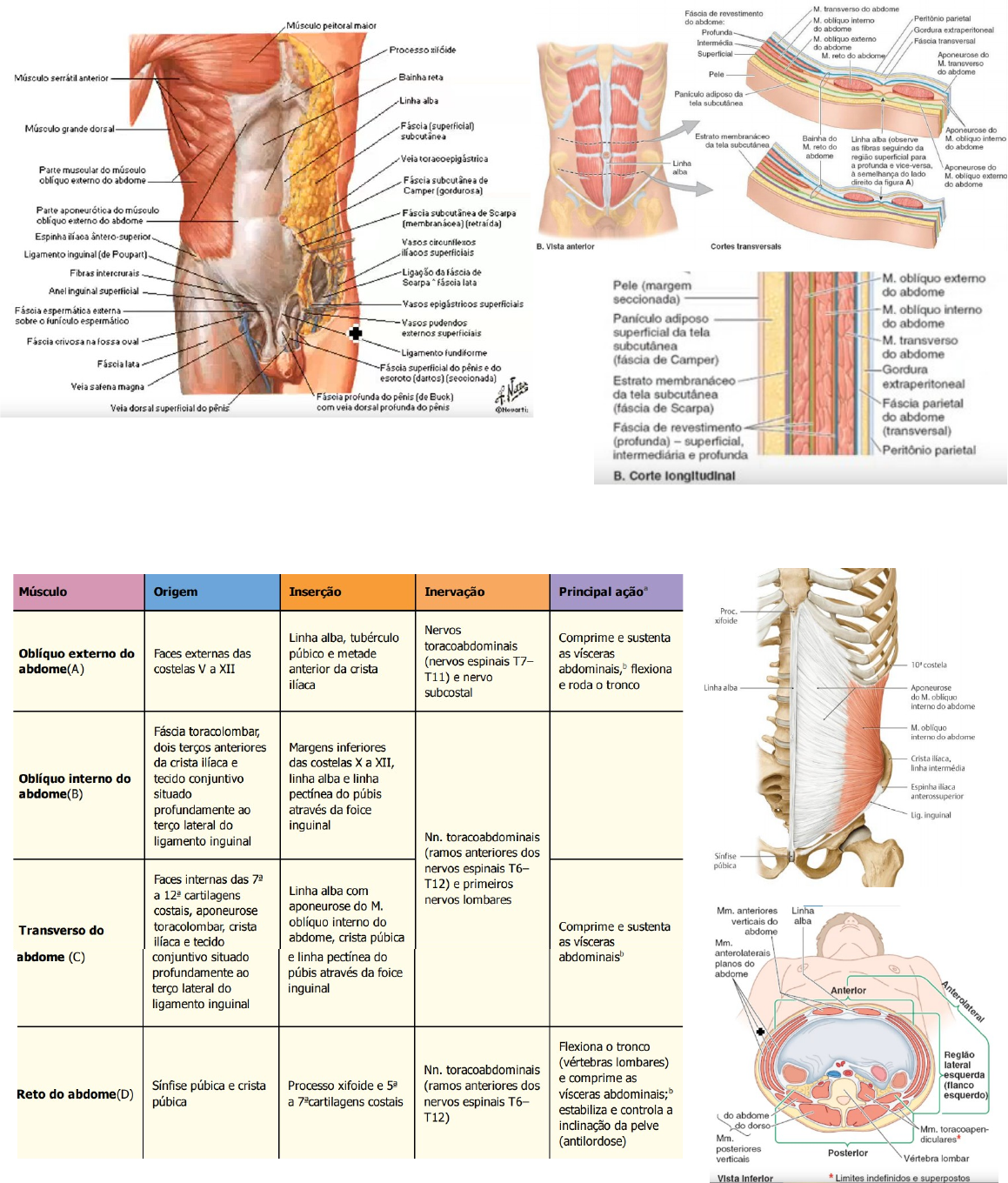 Maria Eduarda Pontes Nozaki - TVII Espaço Inguinal · Fáscias e Planos Teciduais do Baixo Abdome: Camper Scarpa Aponeurose do oblíquo interno, externo e transverso (unidas) Fáscia Endoabdominal Peritônio · Músculos Parede do Abdome - 3 músculos planos são: oblíquo externo do abdome, oblíquo interno do abdome e transverso do abdome. - 2 músculos verticais são: reto do abdome e piramidal (contidos na bainha do músculo reto do abdome) · Nervos · Ilio-Hipogástrico: origina-se a partir do ramo ventral de L1 · Inervação Motora: pequena contribuição motora aos músculos transverso do abdome e oblíquo interno, incluindo o tendão conjunto. · Inervação Sensitiva: fornece fibras sensitivas aos músculos transverso do abdome, oblíquo interno e oblíquo externo e inerva a pele posterolateral da região glútea e suprapúbica. · Ilioinguinal (**): origina-se do ramo ventral de L1 · Inervação Motora: fornece fibras nervosas motoras para os músculos transverso do abdome e oblíquo interno · Inervação Sensitiva: fornece fibras sensitivas para os músculos transverso do abdome e oblíquo interno. Ele inerva a pele proximal e medial da coxa e a pele sobre a raiz do pênis e a parte superior da bolsa escrotal em homens, ou a pele que cobre o monte pubiano e os adjacentes grandes lábios da vulva em mulheres. · Genitofemoral (**): origina-se a partir dos ramos ventrais de L1 e L2 · Inervação Motora: inerva o músculo cremaster através do ramo genital. · Inervação Sensitiva: inerva a pele da bolsa escrotal em homens ou o monte do púbis e os grandes lábios da vulva em mulheres através do ramo genital, e a pele anteromedial da coxa através do ramo femoral. *Obs: 1) São nervos do plexo lombar 2) Podem ser comprimidos por hérnias femorais causando alteração de sensibilidade (parestesia, hiperparestesia) · Pregas Umbilicais · Prega Umbilical Mediana: estende-se do ápice da bexiga até o umbigo e cobre o ligamento umbilical mediano (remanescente do úraco - unia o ápice da bexiga ao umbigo) · Pregas Umbilicais Mediais (2): laterais à prega umbilical mediana e cobrem os ligamentos umbilicais mediais (oclusão das artérias umbilicais) · Pregas Umbilicais Laterais (2): situadas lateralmente às pregas umbilicais mediais e cobrem os vasos epigástricos inferiores · Fossas Inguinais (**): depressões laterais às pregas umbilicais são as fossas peritoneais cada uma é um local de possível hérnia · Fossas Supravesicais: entre as pregas umbilicais mediana e mediais. Formadas quando o peritônio se reflete da parede anterior do abdome sobre a bexiga urinária · Fossas Inguinais Mediais: entre as pregas umbilicais mediais e laterais (triângulo de Hesselbach) locais de hérnias inguinais diretas · Fossas Inguinais Laterais: laterais às pregas umbilicais laterais locais de hérnia inguinal indireta (dentro do canal inguinal) · Espaço Subinguinal · Formação: abaixo do ligamento inguinal · Constituintes: óstio miopectíneo + músculo psoas maior + musculo ilíaco · Óstio Miopectíneo · Constituintes: bainha femoral (artéria e veia femoral) + canal femoral (vasos linfáticos e linfonodos) - Importância clínica (**): maior parte das hérnias femorais passam pelo canal femoral *Obs: nervo femoral esta junto com os músculos psoas maior e ilíaco · Canal Inguinal · Contem (**): ducto deferente, artéria testicular, plexo pampiniforme e ramo genital do nervo genitofemoral (funículo espermático) podem ser comprimidos por uma hérnia inguinal indireta *Obs: 1) Hérnia consegue passar mais facilmente pela abertura do canal inguinal masculino porque ela é maior, uma vez que o testículo passou por ela durante a descida até a bolsa escrotal (feminino possui apenas o ligamento redondo e ramos nervosos, sendo muito menor) 2) Acima do ligamento inguinal: canal inguinal (funículo espermático) 3) Abaixo do ligamento inguinal: espaço subinguinal · Limites · Parede Anterior: formada pela aponeurose do músculo oblíquo externo do abdome · Parede Posterior: formada pela fáscia transversal · Teto: formado lateralmente pela fáscia transversal, centralmente pelos arcos musculo - aponeuróticos dos músculos oblíquo interno e transverso do abdome, e medialmente pelo pilar medial da aponeurose do músculo oblíquo externo do abdome · Assoalho: formado lateralmente pelo trato iliopúbico, centralmente pelo sulco formado pelo ligamento inguinal invaginado, e medialmente pelo ligamento lacunar · Anel Profundo · Formação: é a entrada do canal inguinal. Está localizado superiormente à região intermediária do ligamento inguinal e lateralmente à artéria epigástrica inferior · Constituintes: ducto deferente extraperitoneal e os vasos testiculares nos homens ou ligamento redondo do útero nas mulheres · Anel Superficial (externo) · Formação: é a saída pela qual o funículo espermático em homens, ou o ligamento redondo em mulheres, emerge do canal inguinal. A base se localiza ao longo da crista do púbis e suas faces são os pilares da abertura na aponeurose. O pilar lateral é o mais forte e é reforçado por fibras do ligamento inguinal inseridas no tubérculo púbico. O pilar medial é delgado · Constituintes: aponeurose do obliquo externo do abdome + ligamento lacunar · Trígono Femoral: espaço intermuscular deprimido, na face anteromedial da coxa proximal, imediatamente distal ao ligamento inguinal · Limites · Lateral: musculo sartório · Medial: musculo adutor longo. · Assoalho: músculos ilíaco e psoas maior (lateralmente) + músculos pectíneo e adutor longo (medialmente) · Teto: fáscia lata sobrejacente. · Constituintes: nervo femoral e seus ramos, bainha femoral, artéria femoral e seus ramos, veia femoral e suas tributárias · Hiato Safeno: abertura na fáscia profunda (fáscia lata), inferolateral à extremidade medial do ligamento inguinal, que permite a passagem da veia safena magna e de outros vasos menores - import