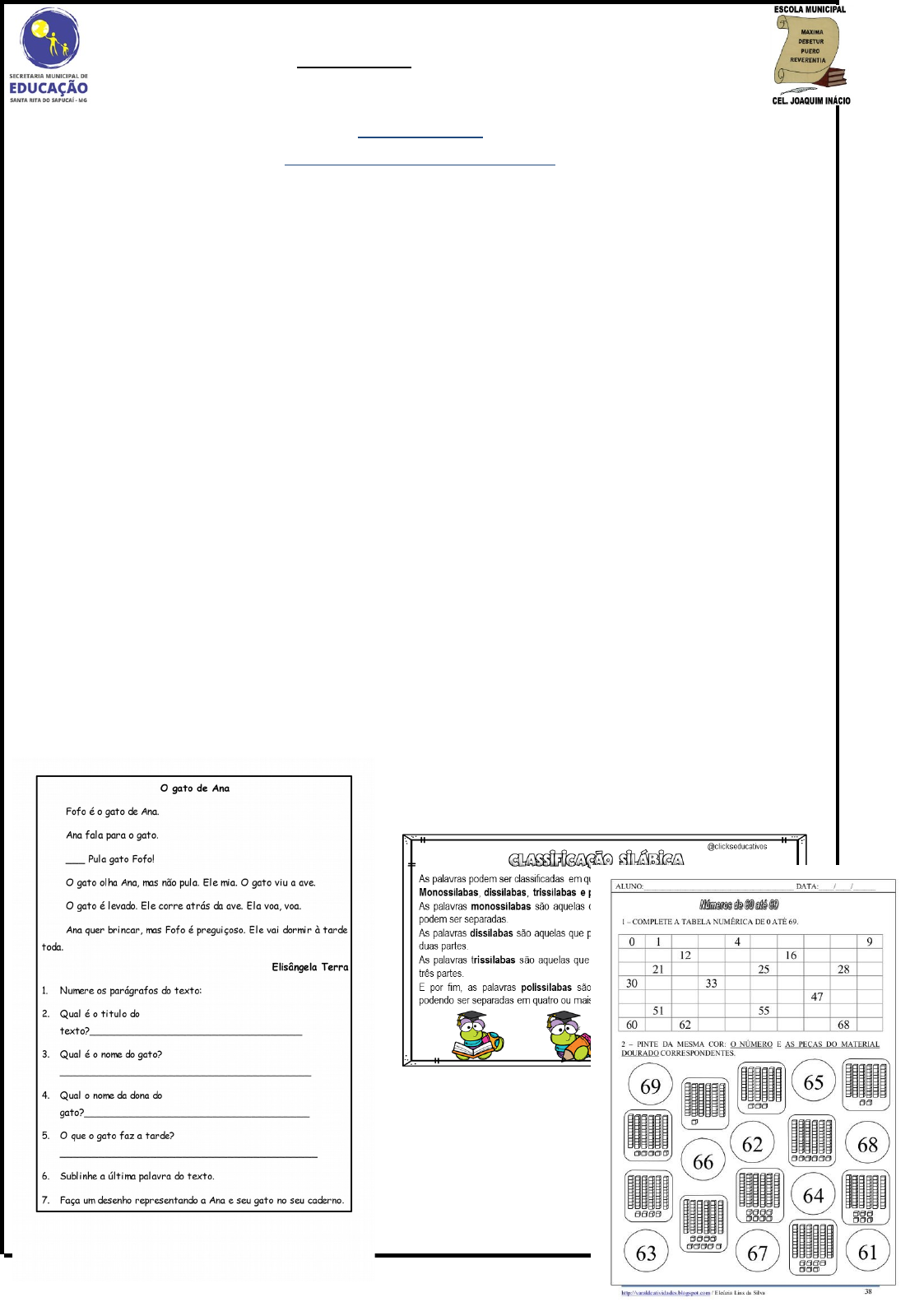 E.M. Cel. Joaquim Inácio - 3º ano/2023 Professora: Keyla Ramos Lopes Plano de aula Segunda-feira: 27/02/2023 1. Atividades de rotina: · Oração, calendário, chamada; · Leitura de livros da caixa (no início/final da aula – 10min). · Alunos faltosos: _________________________________________________ ________________________________________________________________ 2. Disciplina: Português · Conteúdo: Família silábica da letra G/Classificação de sílabas · Eixo: Análise linguística e semiótica · Habilidades: · AC -(EF03LP02) Ler e escrever corretamente palavras com sílabas CV, V, CVC, CCV, VC, VV, CVV, identificando que existem vogais em todas as sílabas. · EF - (EF03LP05) Identificar o número de sílabas de palavras, classificando-a sem monossílabas, dissílabas, trissílabas e polissílabas. · Desenvolvimento: a) Pedir que façam uma leitura silenciosa. (3 vezes). b) Leitura feita pelo professor e depois pelo aluno. c) Pintar as sílabas ga, go, gu, gão das palavras do texto. d) Fazer a interpretação oral e escrita do texto. e) Apresentar aos alunos a classificação silábica. · Atividades: 3. Disciplina: Matemática · Conteúdo: Números de 0 a 60 · Eixo: Números e álgebras · Habilidades: · (EF03MA01) Ler, escrever e comparar números naturais de até a ordem de até unidade de milhar, estabelecendo relações entre os registros numéricos e em língua materna. · (EF03MA02) Identificar características do sistema de numeração decimal, utilizando a composição e a decomposição de número natural de até quatro ordens. · Desenvolvimento: 1. Explicar conteúdo em estudo. 1. Entregar folha impressa. 1. Fazer a correção coletiva no quadro. 4. Disciplina: Tarefa de Matemática Plano de aula Terça-feira: 28/02/2023 1. Atividades de rotina: · Oração, calendário, chamada; · Passar folhinha do dia no quadro; · Leitura de livros da caixa (no início/final da aula – 10min). · Alunos faltosos: _________________________________________________ ________________________________________________________________ 2. Disciplina: Português · Conteúdo: Cruzadinha - letra G · Eixo: Análise linguística e semiótica · Habilidades: · AC -(EF03LP02) Ler e escrever corretamente palavras com sílabas CV, V, CVC, CCV, VC, VV, CVV, identificando que existem vogais em todas as sílabas. · Desenvolvimento: Aplicar atividade proposta anexa ao plano. · Atividades: 3. Disciplina: Ciências · Conteúdos: O sol · Habilidades: · EF03CI07AX) Identificar características da Terra (como seu formato esférico, a presença de água, solo etc.), com base na observação, manipulação e comparação de diferentes formas de representação do planeta (mapas, globos, fotografias etc.). · Desenvolvimento: · Passar o vídeo sobre o tema. · Explicar e aplicar atividade proposta anexa ao plano. 4. Disciplina: Matemática · Conteúdo: Probleminhas/Sistema de Numeração decimal · Eixo: Números e álgebras · Habilidades: · (EF03MA06): Resolver e elaborar problemas de adição e subtração com os significados de juntar, acrescentar, separar, retirar, comparar (quanto amais, quanto a menos, qual a diferença) e completar quantidades (quanto falta para), utilizando diferentes estratégias de cálculo exato ou aproximado, incluindo cálculo mental, como suporte de imagens, material manipulável e/ou digital. · Desenvolvimento: Explicar conteúdo em estudo. 1. Entregar folha impressa. 1. Fazer a correção coletiva no quadro. 5. Disciplina: Tarefa Plano de aula Quarta-feira: 01/03/2023 0. Atividades de rotina: · Oração, chamada; calendário; · Passar folhinha do dia no quadro; · Leitura de livros da caixa (no início/final da aula – 10min). · Alunos faltosos: _________________________________________________ ________________________________________________________________ 0. Disciplina: Português · Conteúdo: Família silábica da letra L · Eixo: Análise linguística e semiótica · Habilidades: · AC -(EF03LP02) Ler e escrever corretamente palavras com sílabas CV, V, CVC, CCV, VC, VV, CVV, identificando que existem vogais em todas as sílabas. · Desenvolvimento: a) Pedir que façam uma leitura silenciosa. (3 vezes). b) Leitura feita pelo professor e depois pelo aluno. c) Pintar as sílabas la, le, li, lo, lu nas palavras da ficha e do texto. d) Fazer a interpretação oral do texto. · Atividades: 0. Disciplina: Matemática · Conteúdo: Ordem crescente e decrescente · Eixo: Números e Álgebras · Habilidades: · HF (EF03MA02) Identificar características do sistema de numeração decimal, utilizando a composição e a decomposição de número natural de até quatro ordens. · Desenvolvimento: a) Entregar folha xerocada aos alunos. b) Explicar como fazer a atividade proposta. c) Uso de materiais concretos. 0. Disciplina: Geografia · Conteúdos: Noções topológicas: O corpo como ponto de referência e pontos cardeais · Eixo: O sujeito e seu lugar no mundo · Habilidades: · (EF03GE01) Identificar e comparar aspectos culturais os grupos sociais de seus lugares de vivência, seja na cidade, seja no mundo. · Desenvolvimento: Fazer a leitura com a turma e explicar atividade proposta anexa ao plano. 0. Disciplina: Tarefa de Português · Recortar 5 palavras com ga, go, gu; 5 palavras com la, le, li, lo, lu; colar no caderno e copiar as palavras com letra cursiva. Plano de aula Quinta-feira: 02/03/2023 1. Atividades de rotina: · Oração, chamada, calendário; · Passar folhinha do dia no quadro; · Leitura de livros da caixa (no início/final da aula – 10min). · Alunos faltosos: _________________________________________________ ________________________________________________________________ 2. Disciplina: Português · Conteúdo: Sinais de Pontuação · Eixo: Leitura/Escuta/(Compartilhada e autônoma) · Habilidades: · (EF15LP01) Identificar a função social de textos que circulam em campo da vida social dos quais participa cotidianamente (a
