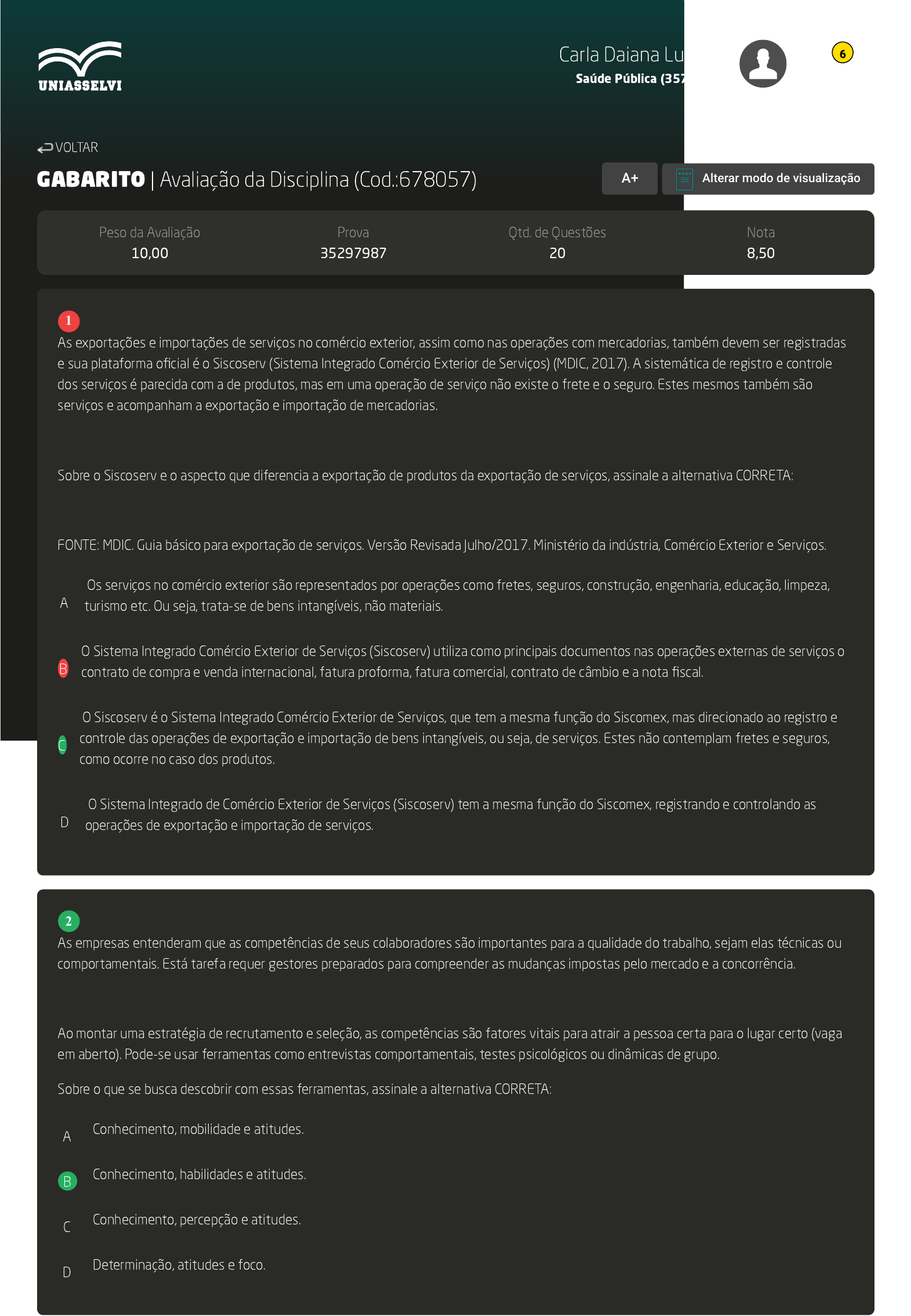 GABARITO | Avaliação da Disciplina (Cod.:678057) Peso da Avaliação 10,00 Prova 35297987 Qtd. de Questões 20 Nota 8,50 As exportações e importações de serviços no comércio exterior, assim como nas operações com mercadorias, também devem ser registradas e sua plataforma oficial é o Siscoserv (Sistema Integrado Comércio Exterior de Serviços) (MDIC, 2017). A sistemática de registro e controle dos serviços é parecida com a de produtos, mas em uma operação de serviço não existe o frete e o seguro. Estes mesmos também são serviços e acompanham a exportação e importação de mercadorias. Sobre o Siscoserv e o aspecto que diferencia a exportação de produtos da exportação de serviços, assinale a alternativa CORRETA: FONTE: MDIC. Guia básico para exportação de serviços. Versão Revisada Julho/2017. Ministério da indústria, Comércio Exterior e Serviços. A Os serviços no comércio exterior são representados por operações como fretes, seguros, construção, engenharia, educação, limpeza, turismo etc. Ou seja, trata-se de bens intangíveis, não materiais. B O Sistema Integrado Comércio Exterior de Serviços (Siscoserv) utiliza como principais documentos nas operações externas de serviços o contrato de compra e venda internacional, fatura proforma, fatura comercial, contrato de câmbio e a nota fiscal. C O Siscoserv é o Sistema Integrado Comércio Exterior de Serviços, que tem a mesma função do Siscomex, mas direcionado ao registro e controle das operações de exportação e importação de bens intangíveis, ou seja, de serviços. Estes não contemplam fretes e seguros, como ocorre no caso dos produtos. D O Sistema Integrado de Comércio Exterior de Serviços (Siscoserv) tem a mesma função do Siscomex, registrando e controlando as operações de exportação e importação de serviços. As empresas entenderam que as competências de seus colaboradores são importantes para a qualidade do trabalho, sejam elas técnicas ou comportamentais. Está tarefa requer gestores preparados para compreender as mudanças impostas pelo mercado e a concorrência. Ao montar uma estratégia de recrutamento e seleção, as competências são fatores vitais para atrair a pessoa certa para o lugar certo (vaga em aberto). Pode-se usar ferramentas como entrevistas comportamentais, testes psicológicos ou dinâmicas de grupo. Sobre o que se busca descobrir com essas ferramentas, assinale a alternativa CORRETA: A Conhecimento, mobilidade e atitudes. B Conhecimento, habilidades e atitudes. C Conhecimento, percepção e atitudes. D Determinação, atitudes e foco. VOLTAR A+ Alterar modo de visualização 1 2 Carla Daiana Ludwig Saúde Pública (3575705) 6 Os desafios que envolvem a gestão de pessoas são imensos, pois cada ser humano é único em seus anseios e objetivos. Cabe ao gestor de pessoas compreender as particularidades de cada um para ter uma gestão equilibrada. Devido a esse grau de complexidade dos anseios humanos, as empresas cada vez mais adotam modelos heterógenos de gestão de pessoas no que tange a benefícios, carreira, motivação, a fim de reter os melhores talentos. Gerir pessoas em uma organização envolve entender a cultura e histórico de cada empresa, gestão voltada para o alcance dos objetivos organizacionais e individuais de seus empregados, considerando o comportamento das pessoas e do ambiente em que trabalham. Pode fazer a diferença compreender aspectos como: missão, visão e valores de uma organização e como isso pode impactar a gestão de pessoas. Com base em pontos que devem ser levantados, analise as afirmativas a seguir: I- Identificar o cargo e exigências do cargo. II- Identificar com o gestor informações e necessidades do cargo a ser preenchido (perfil do candidato, salário, benefícios, horário de trabalho, regime de contratação). III- Identificar se o gestor quer utilizar recrutamento interno ou externo. IV- Identificar a verba e o tempo disponível para contratar este profissional. Assinale a alternativa CORRETA: A Somente a afirmativa I está correta. B Somente a afirmativa II está correta. C Somente a afirmativa IV está correta. D As afirmativas I, II, III e IV estão corretas. A gestão de pessoas se torna cada vez mais relevante para as empresas, pois são as pessoas que impactam nos resultados e trazem resultados. Para tal tarefa, o gestor de pessoas deve conhecer e implantar ações que envolvam o desenvolvimento desses recursos humanos. Com base no objetivo do novo papel da Gestão de Pessoas nas empresas, analise as afirmativas a seguir: I- Criar e operar sistemas que permitam que as oportunidades de emprego e desenvolvimento de carreira estejam disponíveis a todos. II- Dar suporte às demais unidades da empresa no recrutamento e desenvolvimento de pessoas. III- Buscar sempre a diversidade, com o objetivo principal de aumentar o capital intelectual, de modo a garantir a capacidade de atualização e inovação da empresa. 3 4 Carla Daiana Ludwig Saúde Pública (3575705) 6 IV- Ter o treinamento como ferramental de retenção do capital humano e desenvolver novas competências para a atual era empresarial. Assinale a alternativa CORRETA: A Somente a afirmativa III está correta. B Somente a afirmativa I está correta. C As afirmativas I, II, III e IV estão corretas. D Somente a afirmativa II está correta. Ser líder exige conhecimento, habilidade e atitudes que inspiram as pessoas para atingir os objetivos da organização. Acerca das competências essenciais de um líder, associe os itens que seguem: I – Visão II – Motivação III – Comunicação ( ) Fazer-se claro para ter certeza de que os liderados possuem as informações necessárias para realização do trabalho. ( ) Inspirar e estimular os liderados para que realizem o trabalho necessário. ( ) Direcionar os liderados e traduzir as estratégias da organização em objetivos claros. Assinale a alternativa que apresenta a sequência correta 