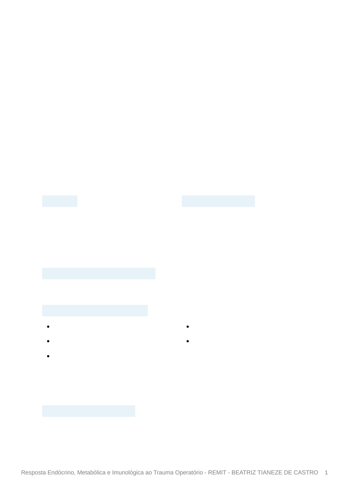 Resposta Endócrino, Metabólica e Imunológica ao Trauma Operatório - REMIT - BEATRIZ TIANEZE DE CASTRO 1 Resposta Endócrino, Metabólica e Imunológica ao Trauma Operatório - REMIT - BEATRIZ TIANEZE DE CASTRO INTRODUÇÃO REMIT Reação adaptativa do hospedeiro na tentativa de manter a homeostase HOMEOSTASE Conjunto de situações adotadas pelo organismo, visando a manutenção do equilíbrio e constância do seu meio interno, bem como a relação com o meio ambiente OBJETIVO PRINCIPAL Restauração do tecido lesado, ou seja, manter a homeostasia corpórea OUTROS OBJETIVOS Restaurar a estabilidade cardiovascular Criar fontes alternativas de energia Corrigir os distúrbios hidroeletrolíticos Preservar substratos calóricos Preservar órgãos nobres com redistribuição do fluxo sanguíneo REMIT A NÍVEL CIRÚRGICO LESÃO TECIDUAL PORÇÃO AFERENTE PORÇÃO EFERENTE Resposta Endócrino, Metabólica e Imunológica ao Trauma Operatório - REMIT - BEATRIZ TIANEZE DE CASTRO 2 Lesão tecidual > nociceptores > envio do estímulo ao SNC > hipotálamo Hipotálamo > estímulo à liberação de hormônios contrarreguladores VIA EFERENTE EIXO AUTONÔMICO-ADRENAL Fase de choque Mantém o fluxo sanguíneo adequado ao local lesado, ou seja, todo paciente submetido à cirurgia terá sangramentos que serão contidos pelo eixo EIXO HIPOTÁLAMO-HIPOFISÁRIO Fase de fluxo Alterações metabólicas para maior fornecimento energético, ou seja, todo o metabolismo mudará para se voltar a área lesada e oferecer substratos para que ocorra a cicatrização adequada Substratos objetivam fornecer glicose (glicogenólise e gliconeogênese) GLICOGENÓLISE Glicogênio > quebra > glicose GLICONEOGÊNESE Proteólise = quebra de proteínas Resposta Endócrino, Metabólica e Imunológica ao Trauma Operatório - REMIT - BEATRIZ TIANEZE DE CASTRO 3 Primeiro processo metabólico que irá ocorrer nas primeiras 12 horas pós trauma Demanda aumento de glicemia para fornecer glicose Ocorre principalmente no fígado Lipólise = quebra de lipídeos > glicerol e ácidos graxos A glicogenólise, proteólise e lipólise são processos catabólicos, por isso a primeira etapa do REMIT é uma resposta catabólica ao trauma, à lesão FASE CATABÓLICA OBJETIVO Fornecer o máximo de glicose e AA possível para o tecido lesado TEMPO Cerca de 2 a 3 dias pós trauma, sendo o terceiro dia o pico da resposta metabólica SUPRARRENAL Produção de catecolaminas (NA e adrenalina) através da resposta hipotalâmica Liberação de Glucagon > glicogenólise e gliconeogênese hepática > lipólise > cetogênese hepática Pacientes pós cirúrgicos, principalmente de grandes cirurgias, apresentam alta susceptibilidade de desenvolver TVP Paciente irá se apresentar com taquicardia, hipertensão, taquipneia, atonia intestinal, oligúria e estado de hipercoagulabilidade Resposta Endócrino, Metabólica e Imunológica ao Trauma Operatório - REMIT - BEATRIZ TIANEZE DE CASTRO 4 Aumento da FC, PA, ventilação, relaxamento da musculatura lisa, contração esfincteriana e atividade plaquetária HIPÓFISE Cortisol Objetiva promover catabolismo proteico e lipídico Aumento da resistência insulínica Efeitos: redução da massa magra (consumindo proteínas), estado de hiperglicemia, formação de corpos cetônicos (acumulo de ácidos graxos, que culminam na entrada em outra via oxidativa, formando os corpos cetônicos), balanço nitrogenado negativo (proteólise aumentada, com um aumento da liberação de grupo amina na urina – urina concentrada), proteínas de fase aguda – TNF, Inter leucina 01 e 06. Glicogênese hepática A insulina objetiva colocar glicose para dentro da célula, e a REMIT objetiva o oposto. Por isso, devemos diminuir a secreção insulínica Fica em atividade por 5 a 7 dias ACTH Atua em função do cortisol e ativa o sistema renina-angiotensina- aldosterona Aldosterona: promove reabsorção de sódio e água, às custas de potássio e hidrogênio Resposta Endócrino, Metabólica e Imunológica ao Trauma Operatório - REMIT - BEATRIZ TIANEZE DE CASTRO 5 Retenção hídrica = paciente + propenso à formação de edemas, EAP, congestão Hipocalemia irrelevante até perdurar o quadro Estado de hipernatremia Estado de alcalose pelas perdas de íons H+ no rim ADH (neurohipófise) Pico de atividade de 3 a 5 dias Reduz a filtração glomerular > oligúria GH Propicia gliconeogênese e glicogenólise Efeitos: hiperglicemia, retenção hídrica e concentração de urina Pico durante a cirurgia Atua na lipólise e na hiperglicemia Normalização em 7 dias Efeitos: hiperglicemia e formação de corpos cetônicos CONSEQUÊNCIAS DA FASE CATABÓLICA 1. Hiperglicemia a. Provocada para fornecer + glicose para tecidos lesados 2. Proteínas de Fase Aguda (TNF ALFA, IL1 e IL6) a. Utilizadas na resposta inflamatória b. Repercutem gerando uma redução de massa muscular Resposta Endócrino, Metabólica e Imunológica ao Trauma Operatório - REMIT - BEATRIZ TIANEZE DE CASTRO 6 c. Atraso na circulação por desencadear resposta inflamatória aguda na região d. Aumento de proteínas i. PCR (parâmetro inflamatório inespecífico) ii. Fibrinogênio iii. Macroglobulina 3. Estado de cetose e hipocalemia 4. Retenção hídrica FASE ANABÓLICA OBJETIVO PRINCIPAL Recuperar todo tecido desgastado para realizar reparo naquela região, ou seja, restituição dos tecidos lesados OBJETIVOS GERAIS Redução de corticoides Retorno da diurese e do apetite RECUPERAÇÃO DE RESERVAS Ganho de massa muscular perdida Normalização das reservas de glicogênio (glicogênese) RETORNO DA HOMEOSTASE Equilíbrio hemodinâmico Temperatura normal Queda de marcadores inflamatórios FASE DO ANABOLISMO PROTEICO (3-12 semanas) Paciente ganha força muscular devido a síntese proteica exagerada FASE ANABÓLICA TARDIA (meses a anos) Paciente ganha peso e gordura corporal devido ao maior anabolismo lipídico FATORES ASSOCIADOS JEJUM OU ALTERAÇÕES DO RITMO ALIMENTAR HIPOGLICEMIA Ger