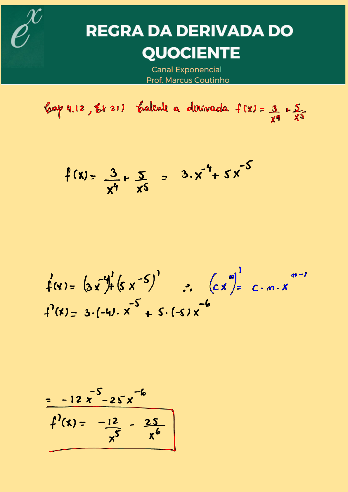 Inicialmente r�screva as frações, passando a variável x para o numerad�, usando expoentes negativos. Sabendo que a derivada da soma é igual a soma das derivadas, aplique em cada um dos termos a regra da derivada do produto de uma constante p� uma função, combinada com a regra da derivada da potência. Realize as multiplicações indicadas e em seguida r�screva a expressão passando as variáveis para o denominad�, encontrando a derivada solicitada. Inicialmente r�screva as frações, passando a variável x para o numerad�, usando expoentes negativos. Sabendo que a derivada da soma é igual a soma das derivadas, aplique em cada um dos termos a regra da derivada do produto de uma constante p� uma função, combinada com a regra da derivada da potência. Realize as multiplicações indicadas e em seguida r�screva a expressão passando as variáveis para o denominad�, encontrando a derivada solicitada.