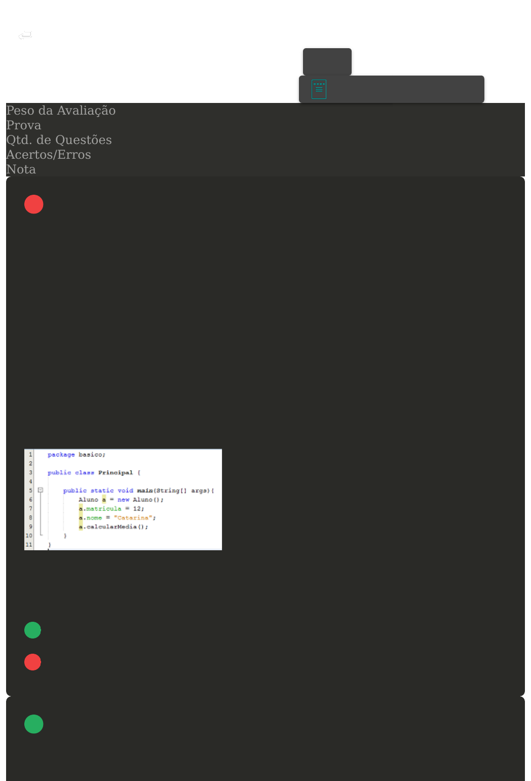 Prova Impressa GABARITO | Avaliação I - Individual (Cod.:768340) Peso da Avaliação 1,50 Prova 56812418 Qtd. de Questões 10 Acertos/Erros 8/2 Nota 8,00 A estrutura de uma classe na linguagem de programação Java comporta um nome, um conjunto de atributos, também conhecidos como o estado desta classe e um conjunto de métodos, também conhecidos como o comportamento desta classe. Considerando a estrutura da Classe Principal demonstrada na figura a seguir, classifique V para as sentenças verdadeiras e F para as falsas: ( ) A linha 1 define, através da palavra reservada "package", o que é conhecido como o ponto de entrada da aplicação. ( ) Já que o método "Aluno()" não possui parâmetros as linhas 7 a 9 geram erros de compilação. ( ) O método chamado main é quem torna uma classe executável, sendo que a sua existência em uma classe é opcional. ( ) Pode-se afirmar que o tipo de dados do atributo "nome", existente na classe aluno é do tipo alfanumérico. Assinale a alternativa que apresenta a sequência CORRETA: A F - V - V - V. B V - F - F - V. C F - F - V - V. D V - F - V - F. Programação orientada a objetos é um paradigma de programação baseado no conceito de "objetos", que podem conter dados na forma de campos, VOLTAR A+ Alterar modo de visualização 1 2 Avaliação I - Individual https://ava2.uniasselvi.com.br/subject/grades-and-test... 1 of 7 14/11/2022 00:06 também conhecidos como atributos, e códigos, na forma de procedimentos, também conhecidos como métodos. Para demonstrarmos os conceitos e as técnicas envolvidas na programação orientada a objetos, é necessário que se utilize uma linguagem de programação adequada. Existem diversas linguagens de programação no mercado. Sobre o nome dessas linguagens de programação orientadas a objetos, analise as sentenças a seguir: I – Python II – C# III – C++ IV – SmalTalk V – C Assinale a alternativa CORRETA: A Somente a sentença IV está correta. B Somente a sentença I está correta. C Somente a sentença III está correta. D As sentenças I, II, III e IV estão corretas. A cidade de São Paulo, que possuía uma população de 10.000.000 de habitantes, teve um aumento de mais 2.000.000 de novos habitantes. Na associação dessa afirmação aos conceitos da modelagem orientada a objetos, é correto afirmar que São Paulo, população e aumento, referem-se, respectivamente, a quê? A Classe, objeto, instância de classe. B Classe, objeto, atributo. 3 Avaliação I - Individual https://ava2.uniasselvi.com.br/subject/grades-and-test... 2 of 7 14/11/2022 00:06 C Objeto, atributo, implementação por um método do objeto. D Objeto, instância, operação. Paradigma de programação (estilo) é um meio de se classificar as linguagens de programação baseado em suas funcionalidades. As linguagens podem ser classificadas em vários paradigmas. Um paradigma de programação fornece e determina a visão que o programador possui sobre a estruturação e execução do programa. Sobre os principais paradigmas de programação existentes, analise as sentenças a seguir: I – Paradigma Estruturado. II – Paradigma Orientada a Objetos. III – Paradigma Alternativo. IV – Paradigma Escalar. V – Paradigma Multifuncional. Assinale a alternativa CORRETA: A As sentenças I e III estão corretas. B As sentenças I e II estão corretas. C As sentenças I e IV estão corretas. D As sentenças II e V estão corretas. 4 Avaliação I - Individual https://ava2.uniasselvi.com.br/subject/grades-and-test... 3 of 7 14/11/2022 00:06 O editor do Eclipse apresenta inúmeras características para auxiliar a escrita do código-fonte, entre as quais podemos citar: Diferenciação; Ajuda de contexto; Compilação; Sugestão de correção; Documentação on-line; Intelisense. Sobre a a definição para a “Intelisense”, assinale a alternativa CORRETA: A Ao colocar o mouse sobre determinada Classe ou método, automaticamente a documentação da linguagem aparece na tela, facilitando em muito o trabalho do desenvolvedor. B Ao encontrar um erro de compilação no código, o Eclipse inicialmente marca o erro sublinhando-o em vermelho. Neste caso, o Eclipse está nos dizendo que a variável nome não existe na classe e sugere que a criemos. Ao selecionar qualquer uma das opções, o Eclipse já procede com a correção, executando a ação escolhida. Apesar de esta ser uma funcionalidade extremamente poderosa, devemos utilizá-la com cuidado, pois uma ação errada pode levar a diversos erros de difícil correção posterior. C Ao digitar parte de um comando, o Eclipse mostra diversas opções para automaticamente completar o que está faltando, sugerindo inclusive nomes para variáveis com base em parâmetros definidos há métodos. D Serve para descobrirmos quais métodos e atributos de um objeto estão disponíveis para utilização. A proteção de atributos e operações das classes faz com que estas se comuniquem com o meio externo por meio de suas interfaces. Que conceito é esse? A Herança. B Agregação. 5 6 Avaliação I - Individual https://ava2.uniasselvi.com.br/subject/grades-and-test... 4 of 7 14/11/2022 00:06 C Encapsulamento. D Polimorfismo. Nas linguagens compiladas, o compilador constrói um (ou mais) arquivo binário, onde transforma código fonte para código nativo da plataforma para a qual se está compilando. Sobras as vantagens de se utilizar um compilador, analise as sentenças a seguir: I – Permite estruturas de programação mais complexas. II – Gera arquivo executável, gerando maior autonomia e segurança. III – Mais desempenho. IV – Consome menos memória. V – Tradução em uma única etapa. Assinale a alternativa CORRETA: A As sentenças II e V estão corretas. B As sentenças I, III e V estão corretas. C As sentenças I e IV estão corretas. D As sentenças I, II e III estão corretas. Classe representa um conjunto de objetos com características afins. Sobre o exposto, assinale a al