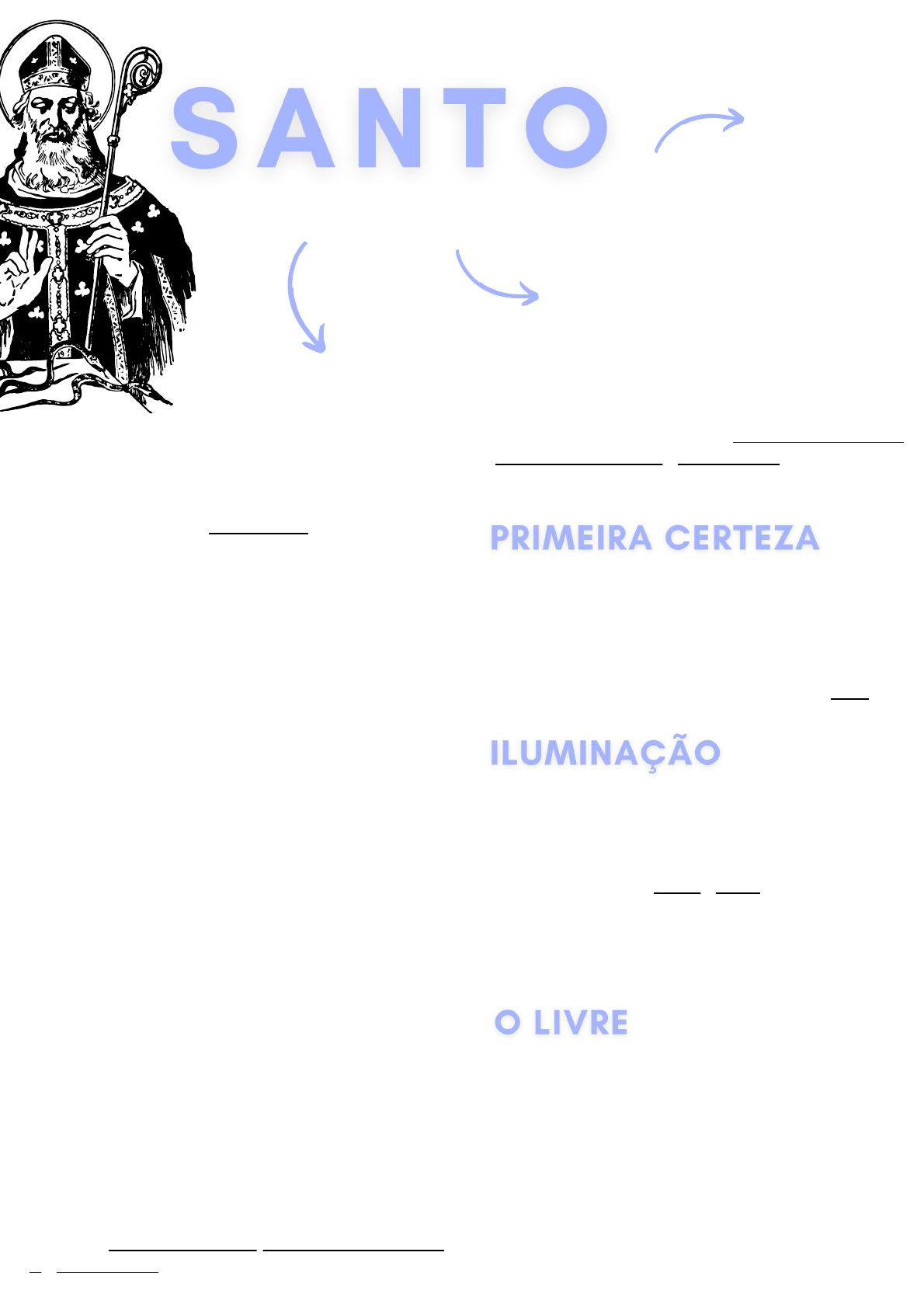 agostinho Não ficou conhecido pelos milagres, mas sim pelo seu pensamento. Conhecido entre os protestantes, que estudaram Agostinho na Idade Média, é santo na igreja anglicana. Um dos principais pensadores do cristianismo. Santo Agostinho costuma ser referido como o “último dos antigos” e o “primeiro dos modernos”. Nascido em Tagaste, dia 13 de novembro de 354. Descendente de berberes por parte de pai e mãe, estudou retórica, música, física, matemática e filosofia. Dedicou-se ao estudo das Escrituras, mas logo ficou desiludido diante do estilo simples da Bíblia. Em Roma, abriu sua própria escola, até ser nomeado ‘Professor de Retórica Imperial’ para o tribunal provincial em Milão, em 384. Durante doze anos foi seguidor de Mani, segundo ele, o bem e o mal tinham princípios opostos e eternos, presentes em todas as coisas. O homem não era culpado por seus pecados, pois já trazia o mal dentro de si, se afastou do maniqueísmo por vontade própria. Em 386, o bispo do Império estava na busca da colocação oficial como professor, mas não teve resposta. Após, ele iniciou assistindo os sermões de Ambrósio, assim se tornando seu maior influenciador na sua conversão ao cristianismo. Em 387, Agostinho e Adeodato são batizados e no ano seguinte, focaram na vida monástica. Após vender as terras de seu pai, ficou com uma pequena parte, assim, fundando o primeiro mosteiro agostiniano. Em 396 o bispo auxiliar, se tornou um dos pilares da teologia católica. Em 430, faleceu e deixou 113 obras escritas, entre tratados filosóficos, teológicos. A partir de uma análise existencial, iniciou seu projeto filosófico a partir da certeza de que era uma alma pensante. Primeiro, ele chega a ter certeza de que existe mas pela sua história de vida, sabe que não se criou e que não se sustenta na existência. e as confissões divinq A doutrina da iluminação divina está entre as principais ideias de Santo Agostinho. Ela também é responsável por unir fé e razão. Sobre a razão, se percebeu mais inteligente por viver uma vida virtuosa, como se a imundície em que se encontrava bloqueasse sua razão de alguma forma, cegando-o para a verdade. arbítrio Não é concedido para que se escolha o mal (demônios), mas sim uma condição para escolher o bem (santos anjos). St. Agostinho explica que a função do livre arbítrio é garantir que nenhuma criatura racional seja obrigada a amar a Deus. Não existe amor sem liberdade e, por isso, se o livre arbítrio for mal utilizado, afasta-se do amor. @anaareisdorfer do mal Deus não é autor do mal e que o mal é uma ausência de Deus. A única forma do mal se fazer presente é mediante a ausência do bem, que teve seu início quando anjos livres escolheram não obedecer a Deus e dele se afastaram. St. Agostinho explica que todo o mal que Deus permite não supera o bem que Ele consegue mesmo com permissão. em santo Uma vez convertido, foi batizado. Posteriormente, tornou-se sacerdote, bispo e santo. Depois da castidade, sua inteligência foi iluminada. Em outras palavras, disse que ficou mais inteligente depois que abandonou seu desregramento da carne. Por essa razão, as principais ideias de Santo Agostinho estão relacionadas com sua vida religiosa. e obras O dia de Santo Agostinho é 28 de agosto; É atribuído a Santo Agostinho a autoria da primeira autobiografia escrita, intitulada “Confessiones”; Segundo ele, a interpretação da Bíblia deveria ser feita de acordo com os conhecimentos de cada época; Santo Agostinho é considerado o Santo protetor dos teólogos, impressores e cervejeiros. A educação clássica foi a base de diversos pensadores, entre eles Santo Agostinho. St. Agostinho explica que todo o mal que Deus permite não supera o bem que Ele consegue mesmo com permissão. Confissões Os pensadores A cidade de Deus De Magistro atividades @anaareisdorfer