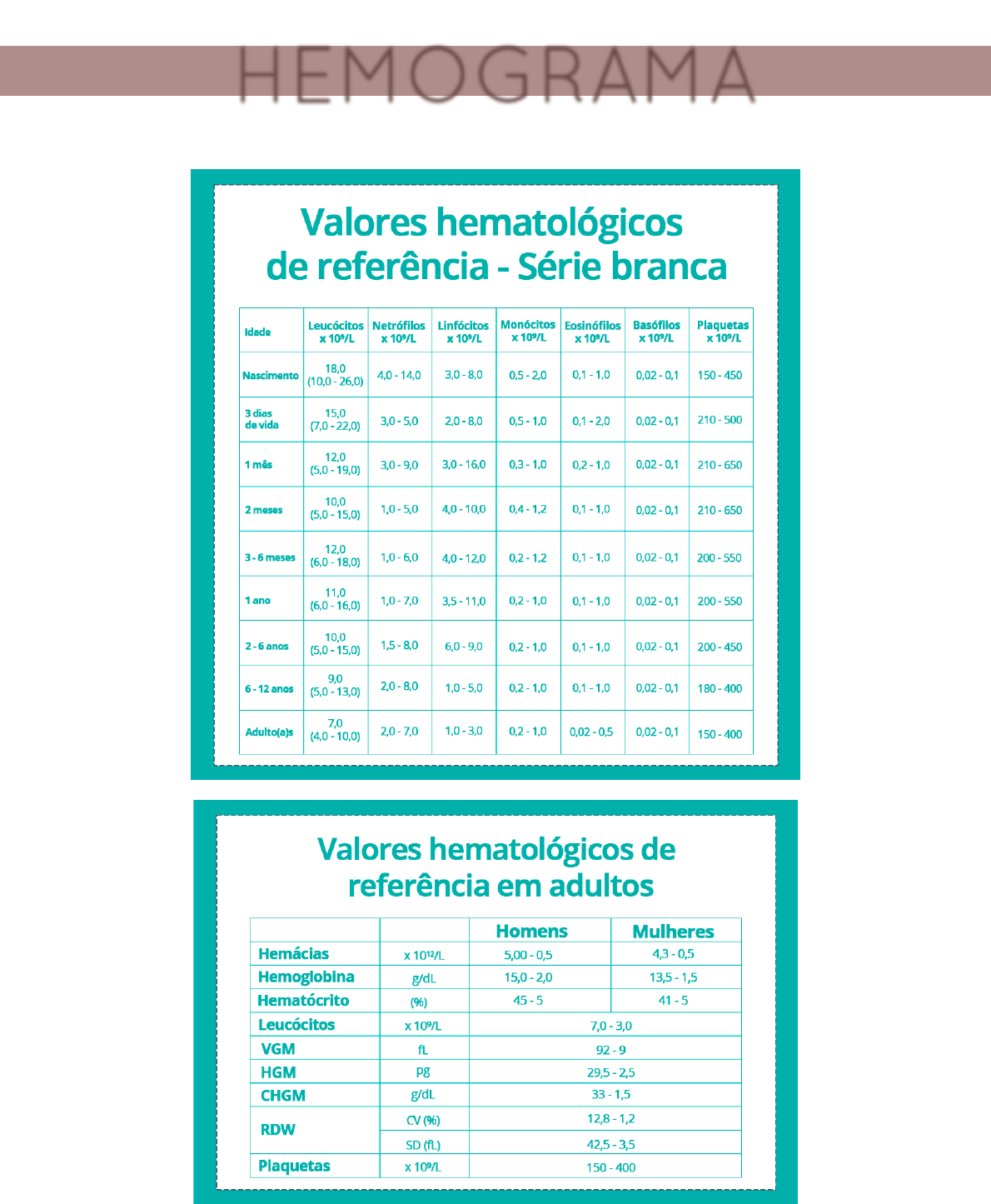 Anna Raphaella – Medicina UFG 68 HEMOGRAMA Introdução: Anna Raphaella – Medicina UFG 68 Série vermelha: Contagem de hemácias > Varia de acordo com sexo e etnia > Vida média: 120 dias Hemoglobina (Hb) > Alteram a contagem de Hb: • Lipidemia • Leucocitose • Hiperbilirrubinemia Hematócrito (Ht) > Estima a viscosidade sanguínea > Aumento → desidratação, dengue, choque > Diminuição → anemias, sangramento, cirrose > 1 g/dL de Hb = 3% de Ht Volume corpuscular médio (VCM) > Média dos tamanhos das hemácias > Normal = 80 – 100 fL > Menor = microcitose • Anemia ferropriva • Anemia de doença crônica • Anemia sideroblástica • Talassemia minor • Hemoglobinopatias • Esferocitose • Síndromes mieloproliferativas > Maior = macrocitose • Anemias megaloblásticas • Anemias não megaloblásticas: por alcoolismo, hepatopatias, hipotireoidismo, anemia do mieloma múltiplo etc Hemoglobina corpuscular média (HCM) > O quanto de hemoglobina tem nas hemácias > Normal: 28 – 32 fL > Menor = hipocrômica • Anemias ferroprivas • Talassemias • Gravidez • Hemorragia • Câncer > Maior = hipercrômica • Anemias hemolíticas, esferocíticas, congênitas e imunes • DPOC • Desidratação Concentração de hemoglobina corpuscular média (CHCM) > Depende do tamanho e da quantidade total de hemoglobina nas hemácias > Aumento: esferocitose, coma hiperosmolar > Diminuição: anemia ferropriva RDW (índice de anisocitose) > Amplitude da distribuição de tamanho das hemácias > Normal = 11,5 – 14,5% > Anisocitose = hemácias muito discrepantes > Importância: diferencia os tipos de anemias > ↑RDW • Anemia por desnutrição Reticulócitos > A última etapa da maturação dos eritrócitos > Ainda apresentam RNA ribossomal (corado) Alterações de hemácias Poiquilocitose: alteração do formato das hemácias Anisocitose: variação de tamanho das hemácias Policromasia: variação de cor das hemácias → indicam reticulocitose Série branca: > Leucograma = análise dos glóbulos brancos > Aumento = leucocitose • Infecções bacterianas • Leucemias > Diminuição = leucopenia • Leucemias, dengue, imunossupressão Neutrófilos > Combate a pequenas inflamações e infecções por bactérias ou fungos Anna Raphaella – Medicina UFG 68 > Aumento = neutrofilia • Infecção bacteriana • Câncer • Trauma • Diabetes > Baixo = neutropenia • Falta de vitamina B12 • Anemia falciforme • Púrpura trombocitopênica Bastões = neutrófilos imaturos > Desvio à esquerda: aumento do número de bastões acima de 5/mm³ ou presença de formas imaturas (mielócitos, metamielócitos) Linfócitos > Principal linha de defesa contra tumores e infecções por vírus > Reconhecem os organismos estranhos e iniciam o processo de ativação do sistema imune > Alto = linfocitose • Infecções > Baixo = linfopenia • Problemas na medula óssea (leucemias) • Imunossupressão Eosinófilos > Combate às infecções parasitárias e reações alérgicas > Alto = eosinofilia • Alergia • Parasitose • Linfoma de Hodgkin > Baixo = eosinopenia • Uso de betabloqueadores ou corticoides • Infecção bacteriana ou viral Basófilos > Combate bactérias e reações alérgicas > Leva à liberação de histamina > Alto = basofilia • Após esplenectomia • Leucemia mieloide crônica • Linfoma de Hodgkin > Baixo = basopenia • Hipertireoidismo • Infecções agudas • Choque anafilático Monócitos > Principal defesa para parasitas > Alto = monositose • Leucemia monocítica • Infecções (crônicas) > Baixo = monocitopenia • Anemia aplásica Plaquetas: > Vida média: 10 dias > Alto = trombocitose • Trombocitose reativa: infecções, neoplasias, anemias, esplenectomia • Trombocitose clonal: policitemia vera, mielofibrose idiopática > Baixo = trombocitopenia • Hiperesplenismo • Infecções • Transfusão maciça