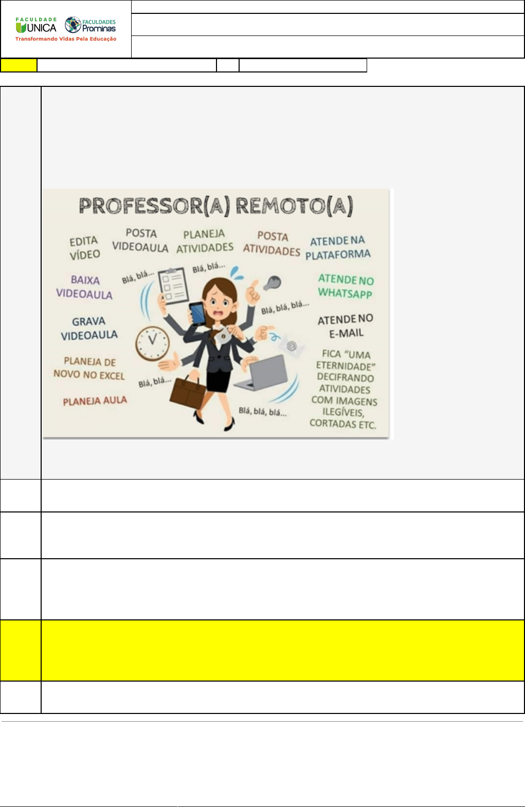 07/12/2022 21:25:33 1/5 REVISÃO DE SIMULADO Nome: HANNY VALÉRIA CLEMENTINO ALVES Disciplina: História da Educação Respostas corretas são marcadas em amarelo X Respostas marcardas por você. Questão 001 Conforme abordado na Unidade 6, a pandemia do Covid-19 alterou a rotina do cidadão mundial. Empresas, comércios e instituições escolares tiveram que estudar, em tempo record o replanejamento de seu funcionamento. Sabemos que a escola tem um caráter peculiar cuja dinâmica afeta a vida de crianças, adolescentes e jovens. Para que este público não sofresse a ruptura em seu percurso educacional, secretarias de educação demandaram esforços para a garantia da continuidade das atividades, ainda que de forma remota. FONTE: http://www.andes.sindoif.org.br/2020/04/02/ifrs-lanca-regulamento-sobre-trabalho-remoto/ Observe atentamente a imagem, acima, e responda a questão que julgar a mais correta para o contexto apresentado. A) O professor nada sofreu com a pandemia do coronavírus, uma vez que sempre contou com a tecnologia como recursos didáticos para o planejamento de suas aulas. X B) Com o processo de Ensino e de Aprendizagem acontecendo de forma remota, o professor está mais atento à participação dos alunos que interagem bem, uma vez que são nativos digitais e possuem habilidades e acesso às tecnologias. C) O ensino remoto chegou para ficar, foi muito bem assimilado por todas as redes de ensino público, uma vez que as escolas sempre receberam os recursos materiais necessários à nova realidade, o que foi essencial para o atendimento aos professores e às famílias mais carentes. D) O Ensino Remoto tem ressignificado as práticas pedagógicas, impactando não só as crianças, adolescentes e jovens, mas sobretudo o professor que vê-se duramente afetado com o excesso de trabalho para além da carga horária contratada para a realização de seu ofício. E) Com o Ensino Remoto os professores estão com o tempo favorável à pesquisa e formação continuada autônoma, o que tornarão suas aulas mais ricas e interessantes. 07/12/2022 21:25:33 2/5 Questão 002 A pandemia do Coronavírus pegou todo mundo de surpresa, obrigando as escolas a se adequarem a uma nova modalidade de educação: o Ensino Remoto. Tal iniciativa foi uma emergência para tentar manter as crianças, os adolescentes e os jovens ligados às escolas, buscando alternativas para que o ano letivo acontecesse sem interrupção. No entanto, sabemos que, embora muitos profissionais da educação já estejam considerando tal iniciativa como Ensino Híbrido, as realidades são bem diferentes, sendo que o Ensino Remoto pode ser o marco para que o Ensino Híbrido seja implantado definitivamente nas instituições educacionais de ensino formal. Com base no que você aprendeu na Unidade 6 e estudos complementares, assinale a alternativa correta com relação ao Ensino Híbrido, tendência da educação pós- pandemia. X A) O Ensino Híbrido faz parte das metodologias ativas que requerem a formação continuada dos professores para lidarem com as tecnologias digitais a fim de proporcionarem alternativas de aprendizagem, a partir das quais acontecerão aulas síncronas e assíncronas. B) Todas as instituições escolares deverão adotar o Ensino Híbrido ainda no ano de 2021. C) Segue a mesma metodologia e legislação do Ensino a Distância – EaD. D) É o Ensino Remoto que foi implantado no ano de 2020, nova modalidade de ensino, onde o estudante está vinculado a uma escola, conta com todo o acompanhamento da equipe pedagógica e docente, mas permanece estudando somente em casa. E) Consiste somente em planejar aulas on line para que o aluno assista em casa e faça as atividades enviadas pelo professor. 07/12/2022 21:25:33 3/5 Questão 003 Nos cursos presenciais da educação profissional tecnológica e mesmo no ensino superior, muitas instituições fazem uso de um ambiente virtual de ensino e aprendizagem para auxiliar na mediação docente. Nesse momento temos vinculado à educação presencial, ferramentas e potencialidades do ensino a distância. As ferramentas de comunicação, disponibilizadas no referido ambiente virtual podem ser classificadas de duas formas (síncronas e assíncronas Coluna A), e possuem vários exemplos (Coluna B). Coluna A I) Síncronas. II) Asssíncronas. Coluna B ( ) E-mail. ( ) Fórum. ( ) Chat. ( ) Lista de discussão. ( ) Webconferência. ( ) Blog. Assinale a alternativa que contém a sequência CORRETA de associação, de cima para baixo. A) II, II, I, II, I, II. X B) II, I, I, II, I, I. C) I, II, II, II, I, II. D) II, I, II, I, II, II. E) I, I, II, I, II, I. Questão 004 A educação a distância está entre as modalidades de atuação com maior índice de crescimento nos últimos anos. Com o surgimento das novas tecnologias de informação e comunicação, essa modalidade de ensino/aprendizagem sofreu modificações que ampliaram suas vantagens e reduziram suas desvantagens. Entre as possíveis desvantagens apontadas pelos especialistas está A) a baixa sociabilização. B) a dificuldade de estudo em grupo. C) a alta relação custo-benefício. X D) a ausência de comunicação direta. E) o aumento considerável da audiência de um curso ou palestra. 07/12/2022 21:25:33 4/5 Questão 005 Analise a imagem abaixo: “Ao contrário dos professores que acreditam que os pais é que devem ir à escola mostrando-se interessados pelo desenvolvimento de seus filhos e pela relação entre família e escola, Tancredi e Reali (2001), Reali e Tancredi (2002), Caetano (2004) acreditam que a construção da parceria entre escola e família é função inicial dos professores, pois eles são elementos-chave no processo de aprendizagem. Dada a formação profissional específica que têm, as tentativas de aproximação e de melhoria das relações estabelecidas com as famílias devem partir, preferencialmente, da escola, pois ´transferir essa função à família somente reforça sentimentos de 