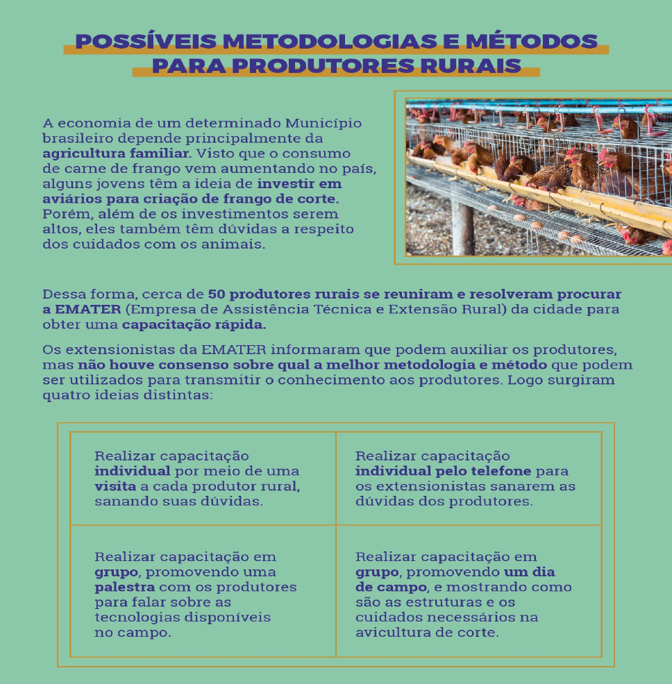 Desafio A assistência técnica e a extensão rural (ATER) são serviços fundamentais que buscam promover o desenvolvimento rural sustentável por meio da transferência de conhecimentos e tecnologias gerados pela pesquisa. Apesar de serem diferentes, ambos os serviços buscam aumento da produção, geração de renda e melhoria da qualidade de vida no meio rural. A extensão rural é um processo educacional de difusão de conhecimento e tecnologia. O técnico intencionista também pode ser chamado de agente de desenvolvimento, pois ele ajuda a promover mudanças e transformações no campo. Também as ações do técnico intencionista devem estar caracterizadas no princípio "aprender a fazer na prática". Acerca disso, acompanhe o seguinte caso: Você coordena a equipe de extensionistas e precisa decidir qual é a metodologia e o método mais indicados para o caso. Neste Desafio, exponha a sua decisão sobre a ideia decidida e justifique a sua escolha para a equipe. Padrão de resposta esperado A metodologia e o método mais indicados são a realização de uma capacitação em grupo, promovendo um dia de campo e mostrando como são as estruturas e os cuidados necessários na avicultura de corte. Como os jovens buscam uma capacitação rápida e têm as mesmas dúvidas, não faz sentido realizar capacitação individual. Dessa maneira, o dia de campo é o método mais indicado, pois, nesse caso, todos os jovens produtores terão feito a mesma capacitação, aprendendo tanto a teoria como a prática. As dúvidas poderão ser respondidas de forma coletiva, o que leva menos tempo e facilita o entendimento dos produtores. A visita individual não é indicada nesse caso, pois são cerca de 50 jovens, o que necessitaria de um grande número de extensionistas. Também demandaria muito tempo se os extensionistas passassem as mesmas informações de modo individual. Os mesmos problemas ocorrerão com o contato por telefone. A palestra também não é indicada para esse caso, pois os jovens têm dúvidas em relação às questões práticas do funcionamento dos aviários. QUESTÃO 1 Correto Atingiu 2,0 de 2,0 Marcar questão Texto da questão Centenas de propriedades rurais de um determinado Município brasileiro estão sendo atacadas por pragas, causando grandes prejuízos econômicos. A EMATER da cidade já tem a solução para o problema. Dessa forma, qual a melhor metodologia e o melhor método? Escolha uma opção: a. Metodologia em grupo, por meio da qual os extensionistas devem realizar um curso. b. Metodologia individual, por meio da qual os extensionistas devem entrar em contato por telefone. c. Metodologia em grupo, por meio da qual os extensionistas devem organizar um dia de campo. d. Metodologia em grupo, por meio da qual os extensionistas devem apresentar uma palestra com a solução. e. Metodologia individual, por meio da qual os extensionistas devem realizar uma visita às propriedades. Feedback Sua resposta está correta. A resposta correta é: Metodologia em grupo, por meio da qual os extensionistas devem apresentar uma palestra com a solução. QUESTÃO 2 Correto Atingiu 2,0 de 2,0 Marcar questão Texto da questão A extensão rural deve buscar atender o maior número possível de pessoas. Claro que, às vezes, surgem particularidades em determinada propriedade agrícola ou cultura, sendo importante que o extensionista foque sua atenção nessa propriedade. Entre as alternativas a seguir, em qual delas se encaixa o uso de uma metodologia individual? Escolha uma opção: a. Surgimento de equipamentos e maquinários agrícolas mais modernos. b. Informações sobre seguro agrícola (PRONAF) após um longo período de estiagem. c. Pragas em culturas agrícolas em determinada região. d. Mortandade repentina de animais em determinada propriedade rural. e. Informações sobre os riscos que os defensivos agrícolas podem causar à saúde. Feedback Sua resposta está correta. A resposta correta é: Mortandade repentina de animais em determinada propriedade rural. QUESTÃO 3 Correto Atingiu 2,0 de 2,0 Marcar questão Texto da questão A extensão rural é fundamental para o sucesso do agronegócio, pois transfere conhecimento por meio de um processo educativo. A extensão rural também exerce papel fundamental no processo de inovação no setor agropecuário brasileiro. Dessa forma, há diferentes tipos de métodos utilizados pela extensão rural. Sobre esses métodos, é correto afirmar: Escolha uma opção: a. Na mesa-redonda, um pequeno número de pessoas discute informalmente um assunto, definindo uma tarefa a ser cumprida, e os resultados são passados para um grupo maior. b. O método de propriedade demonstrativa é sempre realizado em grupo, buscando incentivar os produtores a permanecerem no campo, pois atualmente é grande o número de jovens deixando a zona rural. c. O grupo de trabalho consiste em dividir dois a dois os participantes de um grupo grande para discutirem determinado problema e, em seguida, apresentarem as informações ao grupo maior. d. Curso, um dos métodos grupais, é pouco utilizado, pois normalmente demora semanas ou meses e, dessa forma, dificilmente os produtores acabam tendo interesse. e. Dia de campo é um método em grupo, sendo amplamente utilizado, principalmente para demonstrar inovações tecnológicas, novas técnicas de cultivo ou criação de animais, dentre outros. Feedback Sua resposta está correta. A resposta correta é: Dia de campo é um método em grupo, sendo amplamente utilizado, principalmente para demonstrar inovações tecnológicas, novas técnicas de cultivo ou criação de animais, dentre outros. QUESTÃO 4 Correto Atingiu 2,0 de 2,0 Marcar questão Texto da questão As pessoas têm variadas formas de aprendizagem, logo é importante que a extensão rural aborde diferentes métodos para transmitir o conhecimento. Além disso, é importante haver um planejamento, visando a organizar e entender as reais dúvidas e os anseios dos p