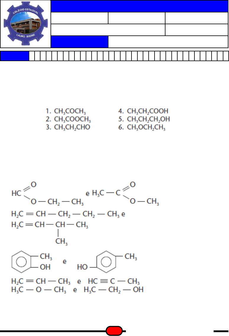 https://saladeestudo.net1 Escola Estadual Lauro Sodré Turno: manhã Turma: ________ Prof.Macedo Área de Ciências da Natureza CasPE: Química EXERCÍCIOS 1 ISOMERIA Nome: 01. (Fesp-PE)(Nível 1) A propanona e o isopropenol são casos típicos de isomeria: (A) de cadeia (C) de tautomeria (E) de metameria (B) de posição (D) estereoisomeria 02. (PUC-MG)(Nível 1) Analise os compostos a seguir. São isômeros os pares: (A) 1 e 5; 2 e 4 (C) 1 e 3; 2 e 4 (E) 2 e 4; 3 e 6 (B) 2 e 4; 3 e 5 (D) 3 e 6; 1 e 5 (A) (B) (D) (C) (E) 03. (Mackenzie-SP)(Nível 1) Dentre os compostos formulados, os que apresentam isomeria de função são: 04. (Mackenzie-SP)(Nível 2) O número máximo de isômeros de fórmula molecular C5H12 é: (A) 6 (B) 4 (C) 2 (D) 5 (E) 3 PROF. MACEDO https://saladeestudo.net 2 05. (UEMG)(Nível 1) Observa-se isomeria funcional em compostos de mesma fórmula molecular e funções químicas distintas, portanto propriedades físicas e químicas próprias. Escolha o par de compostos em que não se observa isomeria de função ou funcional: (A) álcool benzílico e metóxi-benzeno (B) 1-hidróxi-2-metil benzeno e álcool benzílico (C) ácido butanóico e etanoato de etila (D) butanona e butanal (E) anidrido etanóico e ácido butanodióico 06. (Mackenzie-SP)(Nível 1) Qual é a alternativa que apresenta um par de isômeros planos? (A) metóxi-metano e etano (B) pentanal e 2-metil-1-butanol (C) 3-metil-pentano e 2,3-dimetil-butano (D) 1,2-di-hidróxi-propano e ácido propanóico (E) trimetilamina e etildimetilamina 07. (Mackenzie-SP)(Nível 1) As substâncias a seguir formuladas são todas isômeros planos do ácido butanóico exceto. (A) (B) (D) (C) (E) 08. (Uerj)(Nível 2) Na tentativa de conter o tráfico de drogas, a Polícia Federal passou a controlar a aquisição de solventes com elevado grau de pureza, como o éter (etóxi-etano) e a acetona (propanona). Hoje, mesmo as universidades só adquirem esses produtos com a devida autorização daquele órgão. Identifique a alternativa que apresenta, respectivamente, isômeros funcionais dessas substâncias? (A) butanal e propanal. (C) 1-butanol e propanal. (B) butanal e 1-propanol. (D) 1-butanol e 1-propanol. PROF. MACEDO https://saladeestudo.net3 09. (UEPA)(Nível 1) O gosto do taperebá, que o autor relata na canção, se deve a vários compostos; entre eles encontramos a luteína, a β-cryptoxantina, o α-caroteno e o β-caroteno, que são apresentadas pelas figuras abaixo. Em relação aos compostos presentes no taperebá, é correto afirmar que: (A) luteína e α-caroteno são isômeros de compensação. (B) β-caroteno e β-criptoxantina são isômeros de função. (C) α-caroteno e β-caroteno são isômeros de posição. (D) luteína e β-criptoxantina são isômeros de compensação. (E) luteína e β-caroteno são isômeros de cadeia. 10. (UFMA)(Nível 1) Os seguintes compostos apresentam: (A) isomeria de compensação. (B) isomeria de cadeia. (C) isomeria funcional. (D) isomeria de posição. (E) tautometria. PROF. MACEDO https://saladeestudo.net 4 11. (UFSM-RS)(Nível 1) O ácido butírico (ácido butanóico) é um ácido carboxílico encontrado em queijo velho, manteiga rançosa e transpiração humana. Um dos seus isômeros funcionais é utilizado na indústria de alimentos, em mistura ou sozinho, para dar sabor de maçã. Qual dos compostos a seguir, quando colocado na gelatina, tem esse sabor? (A) (B) (D) (C) (E) 12. (UECE)(Nível 1) O par de substâncias orgânicas que melhor poderia representar um tipo de isomeria estrutural que tivesse o nome de isomeria cadeia-anel, seria: (A) 1-etil-3-metilciclobutano e propilciclobutano. (B) etilciclobutano e metilciclopentano. (C) 1-etil-1-metilciclopentano e 1-etil-3-metilciclopentano. (D) 3-etilpentano e 2-metilhexano 13. (Uema)(Nível 1) A seqüência obtida, ao se correlacionarem os pares de compostos com o tipo de isomeria que existe entre eles, é: (A) 4, 3, 1, 2 (C) 3, 4, 2, 1 (E) 2, 1, 4, 3 (B) 3, 2, 1,4 (D) 4, 3, 2, 1 14. (Mackenzie-SP)(Nível 1) Entre os compostos ocorre isomeria de: (A) metameria. (C) função. (E) tautomeria. (B) posição. (D) cadeia. PROF. MACEDO https://saladeestudo.net5 15. (Cesgranrio-RJ) Duas substâncias de odores bem distintos curiosamente têm fórmula molecular idêntica (C6H12O2), o que caracteriza o fenômeno da isomeria. Os odores e as substâncias citadas são responsáveis, respectivamente, pelo mau- cheiro exalado pelas cabras (CH3 - CH2 - CH2 - CH2 - CH2 - COOH) e pela essência do morango (CH3 - COO - CH2 - CH(CH3) - CH3). O tipo de isomeria que se verifica entre as duas substâncias é: (A) de cadeia (D) de função (B) de posição (E) de compensação (C) tautomeria 16. (Ufes)(Nível 1) Associe os pares de compostos da coluna à esquerda com o tipo de isomeria existente entre eles, na coluna à direita. Qual é a alternativa que apresenta uma associação correta? (A) I - 3; II - 2; III - 4; IV - 1 (D) I - 3; II - 2; III - 1; IV - 4 (B) I - 2; II - 3; III - 1; IV - 4 (E) I - 2; II - 3; III - 4; IV - 1 (C) I - 1; II - 2; III - 3; IV - 4 17. (UFRGS-RS)(Nível 2) A creolina, usada como desinfetante, contém cresóis, que são hidróxi-metil-benzenos de fórmula molecular C7H8O. Esses cresóis podem apresentar isomeria: (A) de função e cadeia. (D) de posição e função. (B) de cadeia e tautomeria. (E) de função e metameria. (C) de cadeia e posição. PROF. MACEDO https://saladeestudo.net 6 18. (Unisinos-RS)(Nível 1) As fórmulas de quatro compostos orgânicos são: O(s) que apresenta(m) isomeria geométrica ou cis-trans é(são): (A) I, II, III e IV. (D) apenas III. (B) apenas I e II. (E) apenas II e III. (C) apenas II e IV. 19. (UCDB-MS)(Nível 1) Qual das seguintes substâncias apresenta isomerismo geométrico? (A) Somente II. (D) Somente III. (B) Somente I e II. (E) Somente I e III. (C) Somente III e IV. 20. (UFV-MG)(Nível 1) Considere os nomes dos hidrocarbonetos a seguir: I. 2,2-dimetilbutano IV. cicloexano II. 3-metil