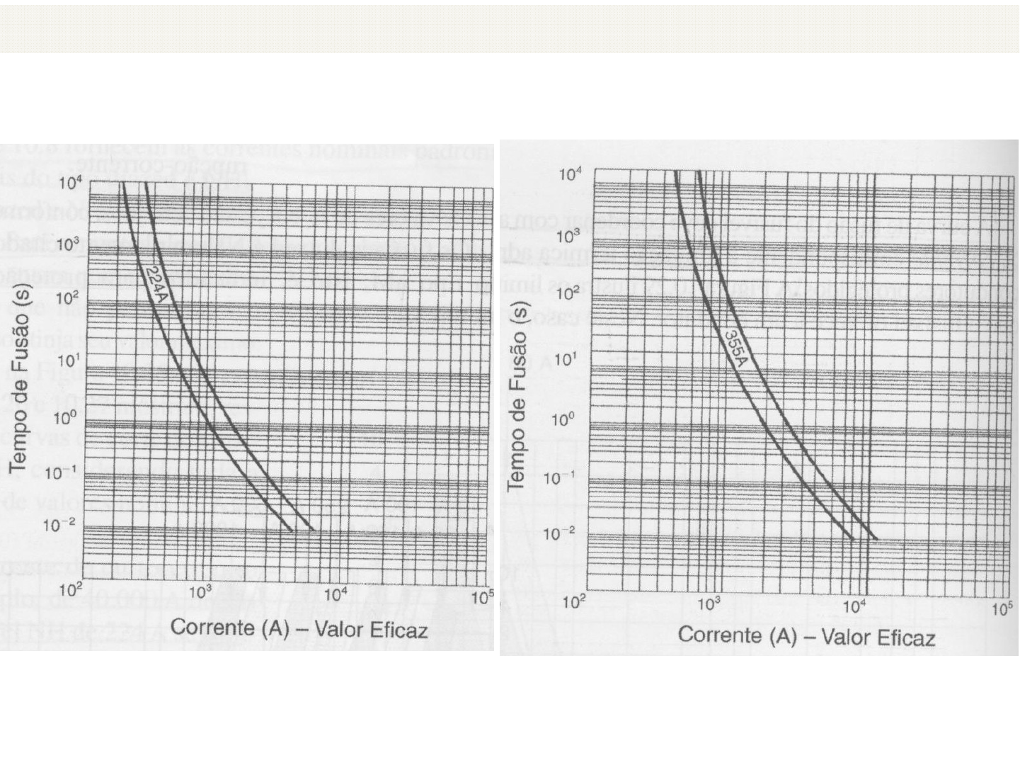 5 – Proteção e Coordenação – Dimensionamento da Proteção 37 Fusível NH – Zonas de Atuação – 224 A Fusível NH – Zonas de Atuação – 355 A 5 – Proteção e Coordenação – Dimensionamento da Proteção 38 5 – Proteção e Coordenação – Dimensionamento da Proteção 39 5 – Proteção e Coordenação – Dimensionamento da Proteção 40 Os fusíveis NH e Diazed são dotados de características de limitação de corrente. Assim, para correntes elevadas de curto‐circuito, esses fusíveis atuam num tempo extremamente rápido que não permite que a corrente de impulso atinja seu valor máximo (redução da capacidade de ruptura do disjuntor). Para que um fusível atenda a todos os requisitos de proteção contra as correntes de falta, é necessário que ele ofereça segurança a todos os elementos localizados a jusante do seu ponto de instalação. Ics 5 – Proteção e Coordenação – Dimensionamento da Proteção 41 Característica da corrente de corte dos fusíveis NH 2x104 4,5x103 1,5x104 1,4x104 Corrente Assimétrica de Impulso Icim 9x103 5 – Proteção e Coordenação – Dimensionamento da Proteção 42 Característica da corrente de corte dos fusíveis Diazed 5 – Proteção e Coordenação – Dimensionamento da Proteção 43 Critérios para seleção do fusível para proteção contra as correntes de curto‐circuito: a) Proteção de circuitos terminais de motores = nf pm pm nm cpm pm cpm nm I I K I I R I R I : Corrente nominal do fusível (A). : Corrente de rotor bloqueado ou corrente de partida (A). : Corrente nominal do motor (A). : Relação entre corrente de partida e nominal do motor. nf pm nm cpm I I I R 40 A 0,5 40 A 500 A 0, 4 500 A 0,3 pm pm pm I K I K I K Fator de multiplicação K Exemplo de aplicação 5.7 (10.6): Determinar a corrente nominal de um fusível que protege contra sobrecorrente de curto‐circuito um motor trifásico de 50 cv, 380 V, IV pólos sendo Inm=68,8, Rcpm=6,4. Considerando o fusível encontrado, qual é o tempo máximo que o fusível deve demorar para fundir quando uma corrente de 1000 A passa pelo circuito protegido ? 5 – Proteção e Coordenação – Dimensionamento da Proteção 44 Critérios para seleção do fusível para proteção contra as correntes de curto‐circuito: b) Proteção de circuitos de distribuição de motores (CCMs): Quando um agrupamento de motores (CCM) é alimentado por um circuito de distribuição, a determinação da corrente máxima do fusível de proteção deve obedecer aos seguintes critérios: • cada motor deve estar provido de proteção individual contra sobrecarga; • a proteção não deve atuar para qualquer condição de carga normal do circuito; • a corrente nominal do fusível deve ser dimensionada conforme a equação: maior potência restante nf pm nmI I K I c) Proteção de circuitos de distribuição de aparelhos (cargas gerais): nf naI I : Soma das correntes nominais dos aparelhos.naI 1 a 1,15 1,15 é mais conservativo 5 – Proteção e Coordenação – Dimensionamento da Proteção 45 Critérios para seleção do fusível para proteção contra as correntes de curto‐circuito: d) Proteção de circuitos de distribuição de cargas mistas (motores e aparelhos): É sempre desaconselhável a associação de carga motriz e aparelhos alimentados por um mesmo circuito de distribuição. Quando não for possível evitar esse tipo de alimentação, a corrente nominal do fusível pode ser determinada pela equação: maior potência restante nf pm nm naI I K I I e) Proteção de circuitos terminais de capacitores ou banco de capacitores: 1,65nf ncaI I : Corrente nominal do capacitor ou banco.ncaI 5 – Proteção e Coordenação – Dimensionamento da Proteção 46 Critérios para seleção do fusível para proteção contra as correntes de curto‐circuito: f) Comportamento do fusível perante a corrente de partida do motor: Deve‐se verificar se o fusível não atua para a corrente de partida do motor. Para isto, é necessário conhecer o tempo de duração da partida e a corrente de partida que irá atravessar o fusível, a qual é função das características construtivas do motor e do tipo de acionamento empregado (chave compensadora, estrela‐triângulo, etc.). Através dos gráficos tempo de fusão x corrente dos fusíveis NH e Diazed é possível estimar o tempo de atuação para a corrente de partida do motor. Assim tem‐se que: g) Proteção da isolação dos condutores dos circuitos terminais e de distribuição: af pmT T : Tempo de atuação do fusível (s). : Tempo de partida do maior motor (s). af pm T T 2 2 2af sc cs K ST T I : Tempo máximo em (s) que a isolação do condutor suporta para uma corrente de curto-circuito trifásica simétrica - (A). sc sc T I Nota: A integral de Joule que o fusível deixa passar não deve ser superior à integral de Joule necessária para aquecer o condutor desde sua temperatura para serviço em regime contínuo até a temperatura limite de curto‐circuito. 5 – Proteção e Coordenação – Dimensionamento da Proteção 47 Curvas tempo x corrente do fusível e condutor 5 – Proteção e Coordenação – Dimensionamento da Proteção 48 5 – Proteção e Coordenação – Dimensionamento da Proteção 49 h) Proteção dos dispositivos de comando e manobra: Devem ser protegidos contra as correntes de falta a jusante de sua instalação. Normalmente, os fabricantes indicam a corrente máxima dos fusíveis que devem ser pré‐ligados aos dispositivos a fim de eliminar as correntes de falta. Deve ser garantida a seguinte relação: • Contator: • Relé Térmico: • Chave Seccionadora: nf nfcI I : corrente nominal do fusível projetado (A). : corrente nominal máxima do fusível indicado pelo fabricante do contator (A). nf nfc I I nf nfrI I : corrente nominal do fusível projetado (A). : corrente nominal máxima do fusível indicado pelo fabricante do relé de sobrecarga/bimetálico (A). nf nfr I I nf 