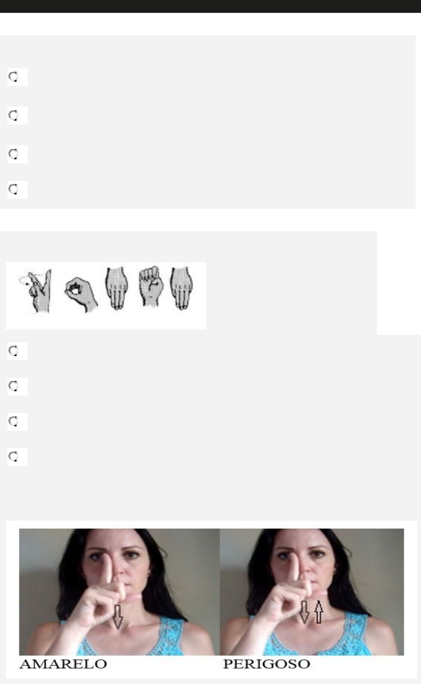 Nivelamento em Libras Básico I 1. Quais são os parâmetros identificados por Willian Stokoe? A) Configuração de mão, locação e movimento. B) Expressão facial, orientação de palma, configuração de mão, locação e movimento. C) Configuração de mão, locação e expressão não manuais. D) Orientação de palma, configuração de mão, locação e movimento. 2. O que está soletrado? A) Nomes. B) Hoje. C) Homem. D) Pônei. 3. Veja a imagem e responda: qual é o parâmetro que difere entre si? A) Movimento. B) Configuração de mão. C) Locação. D) Orientação de palma. 4. Quem foi o primeiro estudioso a pesquisar sobre a língua de sinais? A) Willian Stokoe. B) Ferreira Britto. C) Audrei Gesser. D) Ronice Quadros. 5. A expressão facial afetiva também faz parte da língua de sinais, identifique a expressão facial a seguir e assinale alternativa correta: A) Feliz. B) Desconfiado. C) Bravo. D) Triste. 6. Observe a imagem abaixo e responda a que categoria essa expressão corresponde: A) Nenhuma das alternativas. B) Afetivas e gramaticais. C) Gramaticais D) Afetivas. 7. As expressões afetivas são realizadas para qual finalidade? A) Marcar construções sintáticas. B) Diferenciação de itens lexicais. C) Evidenciar as emoções. D) Marcar grau, aspectos e advérbio. 8. A expressão facial da figura é gramatical, observe e responda a alternativa CORRETA: A) Grande B) Muito pequeno. C) Pequeno. D) Caixa. 9. Analise as expressões e assinale a alternativa que apresenta a sequência CORRETA: A) O quê? – Não. B) Por quê? – O quê? C) Não – Onde? D) O quê? – Pra quê? 10. A Libras tem possibilidades diferentes para a ordenação das palavras na frase, mas, mesmo com esta flexibilidade, a ordem básica é: A) SOB. B) VOS. C) SVO. D) OSV. 1 11 Imagine a fruta melancia, e agora, como seria o modo correto de carregar uma melancia? Assinale o classificador CORRETO: A) Figura B. B) Figura C. C) Figura D. D) Figura A. 12. No classificador de verbo CORTAR, assinale a resposta CORRETA: A) Cortar papel. B) Cortar cabelo. C) Cortar árvore. D) Cortar pão. 13. Observe a descrição de um animal. Assinale a resposta que está de acordo com a descrição: A) Cachorro. B) Leão. C) Gato. D) Coelho. 14. Observe a sinalização da figura e responda a quem ela está indicando: A) Nós. B) Ela. C) Você. D) Eu. 15. Na morfologia, o processo de formação de palavras ou sinais está dividida em duas categorias, são elas: A) Formação através da flexão de número e tempo. B) Formação de diferentes palavras comum à mesma base lexical e formação nos processos que acrescentam informação gramatical à palavra através da flexão: gênero, número, tempo, pessoa, modo e aspecto. C) Utilizando mesma base inicial e acrescentando flexão. D) Na língua de sinais, a formação de novos léxicos é diferente do processo de formação de palavras utilizadas na língua portuguesa. 16. O verbo DAR faz parte dos: A) Verbos espaciais. B) Verbos com concordância. C) Verbos classificadores. D) Verbos simples. 17. Nos sinais apresentados pela imagem, qual é o processo de formação de sinal utilizado? A) Composição. B) Flexão. C) Derivação. D) Incorporação negação. 18. Veja com atenção a frase em Libras e assinale a alternativa que corresponde à tradução: A) Não gosto de estudar. B) Eu preciso estudar. C) Eu gosto de estudar. D) Eu quero estudar. 19. Observe os sinais. Qual é o processo de formação de sinal utilizado? A) Composição. B) Derivação. C) Incorporação negação. D) Flexão. 20. Por que é importante o uso do espaço na língua de sinais? A) Porque na Libras o espaço para sinalizar é no espaço neutro. B) Porque cada sinal dever ser sinalizado em locação diferente para ser gramatical. C) Porque para sinalizar dois sinais precisamos usar dois pontos diferentes. D) Porque a realização de um sinal, em um determinado ponto no espaço, implica mudanças de significados relacionadas com o referente. 21. Observe a frase em Libras e assinale a ordem em que as palavras aparecem: A) SOV. B) SVO. C) VOS. D) OVS.