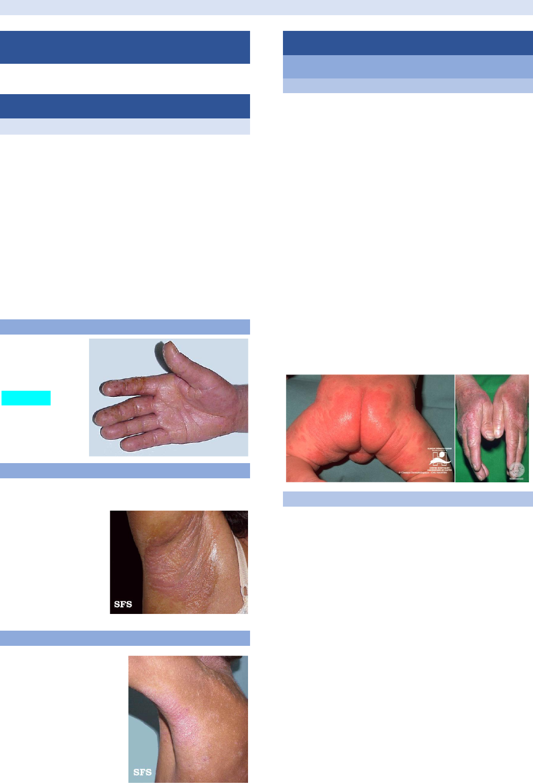 Camila Shelly de V. Ramos ECZEMAS • CARACTERIZAÇÃO ECZEMA ECZEMA = PLACA + PRURIDO -Sempre que houver prurido ↳Pensar em eczema -Além da placa (lesão elementar) podem existir qualquer tipo de lesão: ↳Vesícula, placas liquenificadas, eritema violáceo, hipocromia -Limiar diferenciados de prurido ↳Prurido leve, moderado ou grave →ECZEMA AGUDO -Eritema -Edema -Vesículas →ECZEMA SUBAGUDO Meio termo entre agudo e crônico -Vesículas + liquenificação -Predomina secreção e crostas -Eritema e edema menos intensos →ECZEMA CRÔNICO -Liquenificação -Pele ressecada -Evolução prolongada • ECZEMA DE CONTATO →TIPOS ✓ IRRITATIVO Reação por irritação, não alérgica -Irritação primária (agudo) ↳Exposição única ou repetida ao agente agressor levando ao dano tecidual por ação cáustica ↳Ex: ácido e bases fortes -Irritação de contato subaguda (agudo tardio) ↳Exposição -> dias -> irritação ↳Ex: antralina, podofilina -Irritação crônica ↳Contato contínuo com a substância -> dano cumulativo na pele ↳Ex: sabões, detergentes, fralda/urina ✓ ALÉRGICA Necessita, na maioria das vezes, de 2 contatos (prévio = para ativar linfócitos T de memória; 2° contato = reação alérgica) 1)Contato prévio 2)Ativação linfócitos T + memória (sensibilização) #via aferente -Determinadas situações podem deixar indivíduo mais susceptível a ativação de linfócitos e consequente reação alérgica ↳Estresse 3)Segundo contato #via eferente -Ativação de citocinas para desencadear inflamação 4)Reação alérgica Camila Shelly de V. Ramos -Cascata de inflamação Ex: eczema na pálpebra (alergia ao esmalte), alergia a henna →MANIFESTAÇÕES CLÍNICAS -Lesões eritematosas, eritemato-vesiculosas, secretantes, liquenificadas -Prurido constante -Topograficamente compatível ao causador do eczema ↳Mãos -> ocupacional ↳Face -> cosméticos ↳Pés -> calçados →DIAGNÓSTICO ✓ HISTÓRIA CLÍNICA -Início, localização, história anterior de contato, ocupação, hobbies ✓ TESTE DE CONTATO COMO É FEITO? -34 substâncias padrões ↳Cola -> 2 dias depois paciente volta -> análise e classificação das lesões -Orientações importantes ↳Não deve ser realizado na fase aguda ↳Não deve estar em uso de corticoide oral *Teste pode ser realizado 2 meses depois do corticoide →TRATAMENTO Afastamento da substância causadora ✓ FASE AGUDA -Permanganato de potássio (soluções aquosas) ↳Compressas e banhos -> diluição em água 1:50000 -Usar substância menos oleosas ↳Cremes *de corticoide *de antibióticos (neomicina, gentamicina, ácido fusídico) -> caso haja infecção secundária ✓ FASE CRÔNICA -Usar substância com mais óleo do que água ↳Pomadas *de corticoide -Para casos de dermatite intensa ↳Corticoide oral ↳Anti-histamínicos -Para casos de prurido muuuito intenso ↳Psicofármaco (antidepressivos, anticonvulsivantes) *inibição do prurido Camila Shelly de V. Ramos • ECZEMA ATÓPICO/CONSTITUCIONAL -Alergia ´´genética´´ ↳Advindo da própria constituição do paciente -Períodos de crises -> acalmia -> crises -> acalmia... →FISIOPATOGENIA -Alteração da imunidade da pele ↳Aumento da água transepidermica *tratamento -> hidratação -> restabelecimento da barreira cutânea -> volta da imunidade da pele ↳Imunossupressão local *Maior propensão a infecções de pele →FATORES ASSOCIADOS -Asma -Rinite alérgica -História familiar positiva →ETIOLOGIA -Etiologia multifatorial ↳Alimentos (leite, ovo, trigo, soja, amendoim, peixes) ↳Fatores ambientais (ácaros, fungos, animais, pólens) ↳Irritantes cutâneos (lã, sabão, detergentes) ↳Infecções (vírus, bactérias) ↳Fatores emocionais →MANIFESTAÇÕES CLÍNICAS -Se manifesta de maneira específica em cada idade ✓ BEBÊS/CRIANÇAS ATÉ 2 ANOS -Lesões em placas eritematosas pruriginosas -Facial ↳Bochechas ↳Polpa maciço central -Áreas extensoras (MMII, MMSS) -Coloração varia de acordo com o fototipo do paciente -Eczema periocular + prega embaixo do olho (dennie-morgan) OBS:ECZEMA ATÓPICO X INFECÇÃO SECUNDÁRIA -A infecção pode levar as lesões a atingirem regiões não comuns do eczema atópico ✓ CRIANÇAS >8-9 ANOS E ADULTOS -Lesões em placas eritematosas pruriginosas -Áreas flexurais, dobras antecubitais, poplíteas, pescoço Camila Shelly de V. Ramos →FATORES DESENCADEANTES -Clima (muito frio, muito calor) -Infecção -Alimentação (Ex: amendoim) -Genética ↳Casos de dermatite atópica ou outras doenças alérgicas na família →ALTERAÇÕES FISIOLÓGICAS →DIAGNÓSTICO ✓ CLÍNICO CRITÉRIOS MAIORES*** CRITÁRIOS MENORES** #ictiose = pele tão ressecada que parece escama de peixe #ceratose pilar = carocinhos no corpo -> áspero #dermografismo #sinal de hertogue = parte mais rarefeita da sobrancelha Camila Shelly de V. Ramos OBS:DIFERENÇAS ECZEMA ATÓPICO X ECZEMA DE CONTATO -Atópica ↳Sensibilização mais fácil -> maior facilidade de desenvolver eczema de contato →DIAGNÓSTICOS DIFERENCIAIS →TRATAMENTO -Hidratante ↳Ceramidas ↳Glicerina ↳Ureia (ação irritante) *fazer na fase em que o paciente estar melhorando -Hipoclorito diluído ↳Neutraliza o microbioma do paciente ↳Utilizar após o banho -Corticoide tópico ↳Se inflamação secundaria -> corticoide + atb -Imunomoduladores tópico -Evitar: ↳Alimentos alergênicos ↳Banhos longos -Se manifestações sistêmicas: ↳Corticoide oral *só em crises ↳Imunomodulares (talidomida ou interferon gama) -Fototerapia ↳Imunossupressão local • ECZEMA NUMULAR -Forma de moeda →CAUSA -Desconhecida -Multifatorial ↳Muito ligado a pacientes atópicos →CARACTERÍSTICAS -Ambos sexos, adultos e idosos -Pioram com ↳Frio em excesso ↳Sabão, detergente -Associação com infecções bacterianas Camila Shelly de V. Ramos -Parecida com eczema atópico ↳Mas forma lesões em forma de moeda →MANIFESTAÇÕES CLÍNICAS -Bem mais comum nos MMSS,
