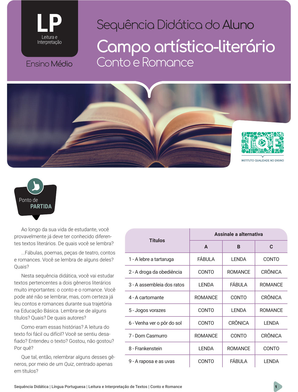 Sequência Didática | Língua Portuguesa | Leitura e Interpretação de Textos | Conto e Romance 1 Ponto de PARTIDA Ao longo da sua vida de estudante, você provavelmente já deve ter conhecido diferen- tes textos literários. De quais você se lembra? ...Fábulas, poemas, peças de teatro, contos e romances. Você se lembra de alguns deles? Quais? Nesta sequência didática, você vai estudar textos pertencentes a dois gêneros literários muito importantes: o conto e o romance. Você pode até não se lembrar, mas, com certeza já leu contos e romances durante sua trajetória na Educação Básica. Lembra-se de alguns títulos? Quais? De quais autores? Como eram essas histórias? A leitura do texto foi fácil ou difícil? Você se sentiu desa- fi ado? Entendeu o texto? Gostou, não gostou? Por quê? Que tal, então, relembrar alguns desses gê- neros, por meio de um Quiz, centrado apenas em títulos? Sequência Didática do AlunoLP Leitura e Interpretação Ensino Médio Campo artístico-literário Conto e Romance Títulos Assinale a alternativa A B C 1 - A lebre a tartaruga FÁBULA LENDA CONTO 2 - A droga da obediência CONTO ROMANCE CRÔNICA 3 - A assembleia dos ratos LENDA FÁBULA ROMANCE 4 - A cartomante ROMANCE CONTO CRÔNICA 5 - Jogos vorazes CONTO LENDA ROMANCE 6 - Venha ver o pôr do sol CONTO CRÔNICA LENDA 7 - Dom Casmurro ROMANCE CONTO CRÔNICA 8 - Frankenstein LENDA ROMANCE CONTO 9 - A raposa e as uvas CONTO FÁBULA LENDA EM.11.LP.3.6.13.A-1221 2 Atividade 1 Você vai ler um trecho de Sarapalha, conto que integra o livro Sagarana (1946), de João Guimarães Rosa. O título Sagarana é um hibridismo (união de dois radicais de línguas distintas): “saga”, de origem germânica, signifi ca “canto heroico”; e “rana”, de origem indígena, quer dizer “à maneira de” ou “espécie de”. Sagarana inicia-se com uma epígrafe, extraída de uma quadra de desafi o, que sintetiza os elementos centrais dessa obra: o bem e o mal, Minas Ge- rais, sertão, vaqueiros e bois: “Lá em cima daquela serra, passa boi, passa boiada, passa gente ruim e boa, passa a minha namorada.” Os nove contos de Sagarana são: O Burrinho Pedrês, A volta do marido pródigo, Sarapalha, O duelo, Minha gente, São Marcos, Corpo fechado, Con- versa de bois, A hora e a vez de Augusto Matraga. ? Você SABIA? O conto Sarapalha narra a história dos primos Ribeiro e Argemiro, que, mesmo contagiados pela malária, permane- cem no vau de Sarapalha, lugar abandonado pelos seus moradores, inclusive por Luísa, a bela mulher de Ribeiro. Am- bos esperam a morte, evocando suas lembranças em meio a severos ataques de febre. Argemiro, que deseja morrer de consciência tranquila, confessa a Ribeiro sua atração por Luísa. Ribeiro, enciumado e implacável, manda Argemiro embora, apesar da sua agonia. Texto 1 Primo Ribeiro se deixa cair no lajedo, todo encolhido e sacudido de tremor. Primo Argemiro fi ca bem quieto. Não adianta fazer nada. E ele tem muita coisa sua para imaginar. Depressa, enquanto Primo Ribeiro entrega o corpo ao acesso e parece ter partido para muito longe d’ali, não podendo adivinhar o que a gente está pensando. E Primo Argemiro sabe aproveitar, sabe correr ligeiro pelos bons caminhos da lembrança. Como era mesmo que ela era?! ... Morena, os olhos muito pretos... Tão bonita! ... Os cabelos muito pretos... Mas não paga a pena querer pensar onde é que ela pode estar a uma hora destas ... Quando fugiu, que baque! Que tristeza... Não esperava aquilo, não esperava... Parecia combinar bem com o marido... Primo Ribeiro naquele tempo era alegre... E ele sentira até ciúmes de Primo Ribeiro, ciúme bobo, porque Primo Ribeiro era quem tinha direito a ela e ao seu amor... Esquisita, sim que ela era... De riso alegrinho, mas de olhar duro... Que bonita! ... O boiadeiro tinha fi cado três dias na fazenda, com desculpa de esperar outra ponta de gado... Não era a primeira vez que ele se arranchava ali. Mas nunca ninguém tinha visto os dois conversando sozinhos... Ele, Primo Argemiro, não tinha feito nenhuma máidéia... — Sai, Jiló! ... Bota abaixo, diabo! ... Assim! Assim, cachorrinho bom... Bem que havia de ser razoável ter podido ao menos dizer à prima que ela era o seu amor... Porque, assim, tinha fugido sem saber, sem desconfi ar de nada... Mas ele nunca pensara em fazer um malfeito daqueles, ainda mais mo- rando na casa do marido, que era seu parente... Isso não! Queria só viver perto dela... Poder vê-Ia a todo instante... Sequência Didática | Língua Portuguesa | Leitura e Interpretação de Textos | Conto e Romance 3 E Primo Ribeiro nunca tinha posto maldade... Também, que é que havia, para ele poder maldar? ... Nada... Só, uma vez, debaixo das jabuticabeiras ... Nesse dia, quase que perdera a força de ser correto. Viu-a de vestido azul- -domar... Os braços cor de jenipapo... As mãos deviam de ser macias... Mas Deus ajudou, tirando-lhe a coragem... Também, se tivesse faltado com o respeito à mulher do Primo Ribeiro, teria sumido no mundo, na mesma da hora, com remorso... Aquilo tinha sido três meses antes de ela fugir. Mas, antes, bem em-antes disso, teve uma vez em que ela des- confi ou. Foi logo que ele chegara à fazenda, uns dias depois. Estava olhando, assim esquecido, para os olhos ...olhos grandes, escuros e meio de-quina, como os de uma suassuapara ... para a boquinha vermelha, como fl or de suinã... —“Você parece que nunca viu a gente, Primo!... Você precisa mais é de campear noiva e caçar jeito de se casar...” — dissera ela, rindo. Ele tinha fi cado meio palerma, sem ter nada para responder... Teria ela adivinhado o seu querer-bem? ... Não, falara aquilo por brincadeira, decerto. Mas, quem sabe...? Mulher é mulher... E que bom que seria, se ela tivesse fi cado sabendo! Ao menos, agora, de vez em quando se lembraria dele, dizendo: “Primo Argemiro também gostou de mim...” As palmas do coqueiro estão agora paradas de todo. As gali