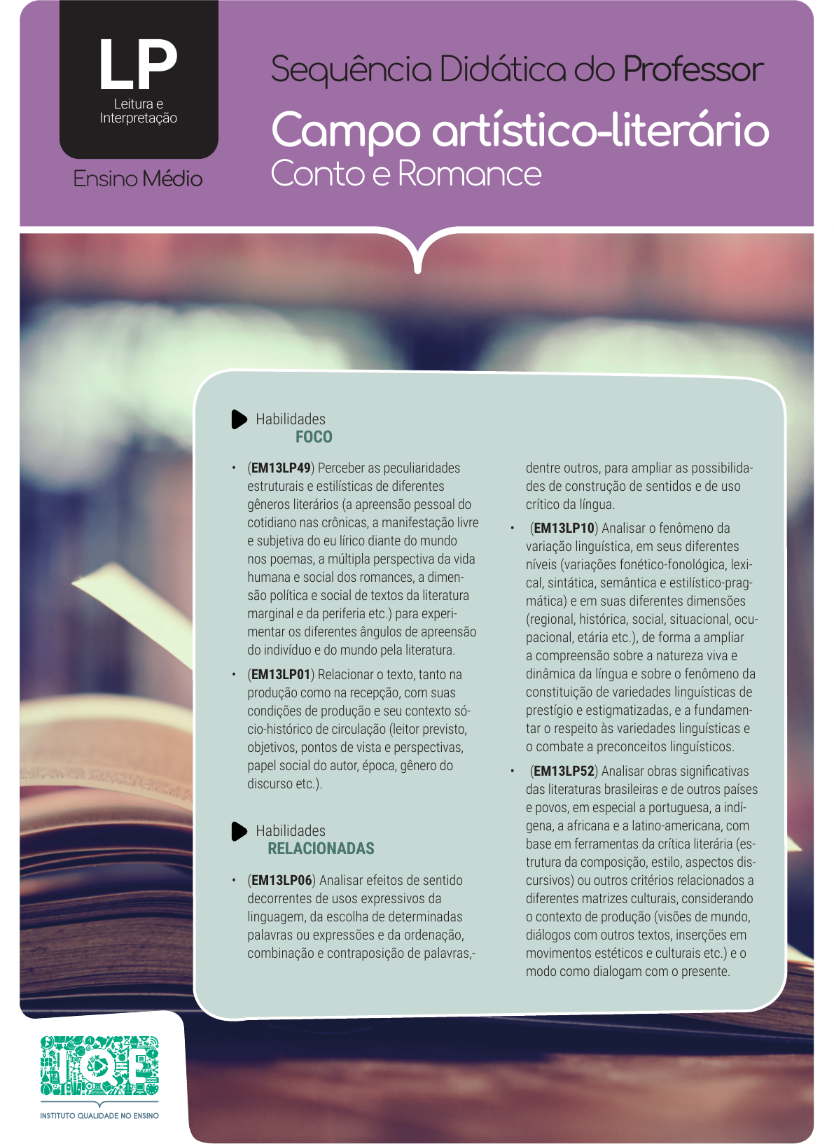LP Leitura e Interpretação Sequência Didática do Professor Ensino Médio Campo artístico-literário Conto e Romance Habilidades FOCO • (EM13LP49) Perceber as peculiaridades estruturais e estilísticas de diferentes gêneros literários (a apreensão pessoal do cotidiano nas crônicas, a manifestação livre e subjetiva do eu lírico diante do mundo nos poemas, a múltipla perspectiva da vida humana e social dos romances, a dimen- são política e social de textos da literatura marginal e da periferia etc.) para experi- mentar os diferentes ângulos de apreensão do indivíduo e do mundo pela literatura. • (EM13LP01) Relacionar o texto, tanto na produção como na recepção, com suas condições de produção e seu contexto só- cio-histórico de circulação (leitor previsto, objetivos, pontos de vista e perspectivas, papel social do autor, época, gênero do discurso etc.). Habilidades RELACIONADAS • (EM13LP06) Analisar efeitos de sentido decorrentes de usos expressivos da linguagem, da escolha de determinadas palavras ou expressões e da ordenação, combinação e contraposição de palavras,- dentre outros, para ampliar as possibilida- des de construção de sentidos e de uso crítico da língua. • (EM13LP10) Analisar o fenômeno da variação linguística, em seus diferentes níveis (variações fonético-fonológica, lexi- cal, sintática, semântica e estilístico-prag- mática) e em suas diferentes dimensões (regional, histórica, social, situacional, ocu- pacional, etária etc.), de forma a ampliar a compreensão sobre a natureza viva e dinâmica da língua e sobre o fenômeno da constituição de variedades linguísticas de prestígio e estigmatizadas, e a fundamen- tar o respeito às variedades linguísticas e o combate a preconceitos linguísticos. • (EM13LP52) Analisar obras signifi cativas das literaturas brasileiras e de outros países e povos, em especial a portuguesa, a indí- gena, a africana e a latino-americana, com base em ferramentas da crítica literária (es- trutura da composição, estilo, aspectos dis- cursivos) ou outros critérios relacionados a diferentes matrizes culturais, considerando o contexto de produção (visões de mundo, diálogos com outros textos, inserções em movimentos estéticos e culturais etc.) e o modo como dialogam com o presente. EM.11.LP.3.6.13.P-1221 Sequência Didática | Língua Portuguesa | Leitura e Interpretação de Textos | Conto e Romance 3 Ponto de PARTIDA Ao longo da sua vida de estudante, você provavelmente já deve ter conhecido diferentes textos literários. De quais você se lembra? ...Fábulas, poemas, peças de teatro, contos e romances. Você se lembra de alguns deles? Quais? Nesta sequência didática, você vai estudar textos pertencentes a dois gê- neros literários muito importantes: o conto e o romance. Você pode até não se lembrar, mas, com certeza já leu contos e romances durante sua trajetória na Educação Básica. Lembra-se de alguns títulos? Quais? De quais autores? Como eram essas histórias? A leitura do texto foi fácil ou difícil? Você se sentiu desafi ado? Entendeu o texto? Gostou, não gostou? Por quê? Que tal, então, relembrar alguns desses gêneros, por meio de um Quiz, centrado apenas em títulos? Títulos Assinale a alternativa A B C 1 - A lebre a tartaruga FÁBULA LENDA CONTO 2 - A droga da obediência CONTO ROMANCE CRÔNICA 3 - A assembleia dos ratos LENDA FÁBULA ROMANCE 4 - A cartomante ROMANCE CONTO CRÔNICA 5 - Jogos vorazes CONTO LENDA ROMANCE 6 - Venha ver o pôr do sol CONTO CRÔNICA LENDA 7 - Dom Casmurro ROMANCE CONTO CRÔNICA 8 - Frankenstein LENDA ROMANCE CONTO 9 - A raposa e as uvas CONTO FÁBULA LENDA LP Leitura e Interpretação Ensino Médio Campo artístico-literário | Conto e Romance Ponto de PARTIDA O Ponto de Partida tenciona apenas a mobilização de conhecimentos prévios sobre narrativas, as quais, em tese, já são conhecidas pelos alunos (BNCC e currículos estaduais e municipais). O Quiz traz títulos muito conhecidos, mas é importante que você esteja preparado para recapitular o enredo das histórias presentes na lista. Os títulos são bastante recorrentes em materiais didáticos e planos de aulas dos professores, também por estarem disponíveis na Internet. Na lista, não há opção apenas por cânones da literatura (nacional ou mundial), mas por uma mescla, oportunizando a discussão sobre obras que despertaram (e ainda despertam) o interesse do leitor em formação. É importante dar voz e, principalmente, oportunizar a reflexão sobre mitos e verdades em relação a alguns gêneros textuais. Em Jogos vorazes, por exemplo, di- fi cilmente o aluno classifi cará como romance, pois ainda há a crença de que romance são histórias de amor. Aqui, vale recorrer ao dicionário! Para os alunos que leram o romance (e até aos que apenas assistiram ao fi lme), é bom conversar sobre a “fórmula” de sucesso da obra, que está muito próxima à fase do Romantismo: herói (destemido, cavalheiro, forte ...), heroína (bela, aparentemente necessitada de pro- teção...); conflito que gira em torno da resolução de um problema que permitirá a aproximação do casal. Orientação ao PROFESSOR 4 O mais importante no Ponto de Partida, portanto, não é verifi car o número de acertos/erros, mas oportunizar a retomada de apren- dizagens anteriores que permitirá o passo seguinte, ou seja, leitura/análise dos gêneros conto e romance, que serão trabalhados mais detidamente. Por fi m, o Ponto de Partida permitirá a retomada dos elementos composicionais das narrativas, na especifi cidade de dois de seus gêneros textuais. Títulos Autor Assinale a alternativa A B C 1 - A lebre a tartaruga Versão de Millôr Fernandes FÁBULA LENDA CONTO 2 - A droga da obediência Pedro Bandeira CONTO ROMANCE CRÔNICA 3 - A assembleia dos ratos Versão Monteiro Lobato LENDA FÁBULA ROMANCE 4 - A cartomante Machado de Assis ROMANCE CONTO CRÔNICA 5 - Jogos voraz