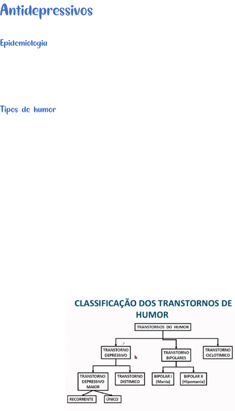o 121 milhões de pessoas sorem de depressão em todo o mundo (OMS). o Em 2030, a depressão será o mal mais prevalente do planeta, à frente do câncer e algumas doenças infecciosas. Humor: Estado emocional sustentado, somatório de emoções e sentimentos que estão presentes na consciência. o Elevado: Expansividade, fuga de ideias, diminuição do sono, autoestima elevada e ideias de grandiosidade. o Deprimido: Perda de energia, sentimento de culpa, dificuldade de concentração, perda do apetite, pensamentos de morte, alteração do sono, déficit cognitivo, disfunção sexual. • Transtornos de Humor Síndromes constituídas por grupos de sinais e sintomas que duram semanas a meses e representam uma perda do controle habitual do humor. As perturbações do humor podem ser do tipo depressão ou mania. o Mania: Aumento da atividade, humor elevado ou irritado, ideias megalomaníacas. o Depressão: Humor deprimido, pensamento negativo, ausência de prazer, energia reduzida, lentificação. o Psicológico: Estresse, negligência na infância, perdas. o Ambientais: Substâncias psicoativas, mudanças de ritmos biológicos, estilo de vida. o Biológicos: Sistema límbico (desequilíbrio das aminas biogênicas), eixo endócrino, ritmo cicardiano. o Genéticos: Hereditariedade. Caracteriza-se pelo humor deprimido e/ou perda do interesse em realizar praticamente todas as atividades, acompanhado de alguns sintomas físicos e psicológicos, por, pelo menos, duas semanas, no mínimo. Sintomas necessários para termos critérios de episódio depressivo – CID 10 A) o Humor deprimido o Perda de interesse e prazer o Redução da energia e diminuição da atividade B) o Redução da concentração o Redução da autoestima o Ideias de culpa e fracasso o Pensamentos pessimistas o Ideias auto-destrutivas o Distúrbios do sono o Apetite diminuído Episódio leve: Pelo menos 2A e 2B Episódio moderado: Pelo menos 2A e 3B Episódio severo: Todos de A e pelo menos 4B Levar em consideração a gravidade dos sintomas e o grau de déficit funcional. *Escala de HAD Depressão como uma doença subdiagnosticada e subtratada Obstáculos para seu reconhecimento: o Atribuir sintomas depressivos à doença clínica. o Negação da experiência da depressão. o Semelhança entre os sintomas depressivos e os sintomas de outras doenças. o A ideia de que “seria normal ter depressão”. o Atitudes negativas em relação ao diagnóstico de depressão. o Impropriedades de ambiente clínico para discutir assuntos pessoais ou emocionais. o Dificuldades do paciente em relatar sintomas de depressão. Tanto a liberações de determinados neurotransmissores para determinadas sensações quanto o número de receptores que essas substâncias se ligam podem provocar alterações na instalação do quadro depressivo. Regulação pré-sináptica da neurotransmissão de serotonina Neurônio pré-sináptico da transmissão serotoninérgica, que libera serotonina. Diante de um potencial de ação vai ocorrer a liberação desses neurotransmissores. A serotonina vai ser sintetizada a partir do triptofano, que é um aminoácido oriundo de algumas suplementações. O triptofano vai ser catalisado pela enzima triptofano-hidroxilase, formando 5-Hidroxitriptofano. A enzima L-aminoácido aromático descarboxilase atua sobre esse produto e, por fim, forma a serotonina. A serotonina é transportada para a vesícula através de uma proteína transportadora. Diante de um potencial de ação, ocorre a abertura dos canais de sódio e cálcio. A vesícula libera a serotonina na fenda. A serotonina pode se ligar aos receptores pós-sinápticos, aos autoreceptores (indicando um feedback negativo) ou ser recaptada pelas proteínas transportadoras, onde pode ser recolocada nas vesículas ou degrada pela MAO. Regulação pré-sináptica da neurotransmissão da Noradrenalina precursor metabólico da noradrenalina é a Tirosina, que está presente nos fluidos corporais e é captada por neurônios adrenérgicos. A tirosina hidroxilase, uma enzima, catalisa (acelera) a conversão da tirosina em DOPA. A DOPA sobre ação da dopa descarboxilase e é convertida em Dopamina. A dopamina β-hidroxilase converte a dopamina em Noradrenalina. A noradrenalina é captura e armazenada em altas concentrações em vesículas. A entrada de cálcio no neurônio faz com que a noradrenalina seja liberada da vesícula para a junção, onde irá se ligar a receptores pós-sinápticos, aos autoreceptores (sinalizando um feedback negativo) ou será recaptada pelas proteínas transportadoras, onde pode ser recolocada nas vesículas ou degrada pela MAO. Receptores de ação da NORADRENALINA e da SEROTONINA Efeitos da imipramina, iproniazida e reserpina sobre o humor. o Imipramina: Agente antipsicótico com ação antidepressiva através do bloqueio do transportador da serotonina, fazendo com que os neurotransmissores fiquem na fenda sináptica por mais tempo. o Iproniazida: Agente antituberculoso com ação antidepressiva. Inibe a enzima MAO e, consequentemente, inibe a degradação de serotonina, dopamina e noradrenalina. o Reserpina: Agente anti-hipertensivo com ação depressiva. Produz depleção de serotonina, dopamina e noradrenalina. o Boa relação médico-paciente. o Diagnóstico correto. o Uso racional e criterioso de recursos terapêuticos. Medicamentoso: o Defasagem terapêutica – 3 a 4 semanas. o Redução de 50% dos sintomas com 8 semanas. o Manutenção de 6 a 12 meses. o Monoterapia não é recomendada para o tratamento da doença bipolar. o Inibidores da MAO - IMAOs. Moclobemida, Tranilcipromina. o Antidepressivos Tricíclicos – ADT. Amitriptilina, Clomipramina, Doxepina, Imipramina, Maprotilina, Nortriptilina. o Inibidores da Recaptação de Serotonina e Noradrenaliina – IRNS Desvenlafaxina, Duloxetina, Venlafaxina. o Inibidores Seletivos da Recaptação de Serotonina – ISRS Citalopram, Escitalopram, Fluoxetina, Fluvoxamina, Paroxetina, Sertraliin