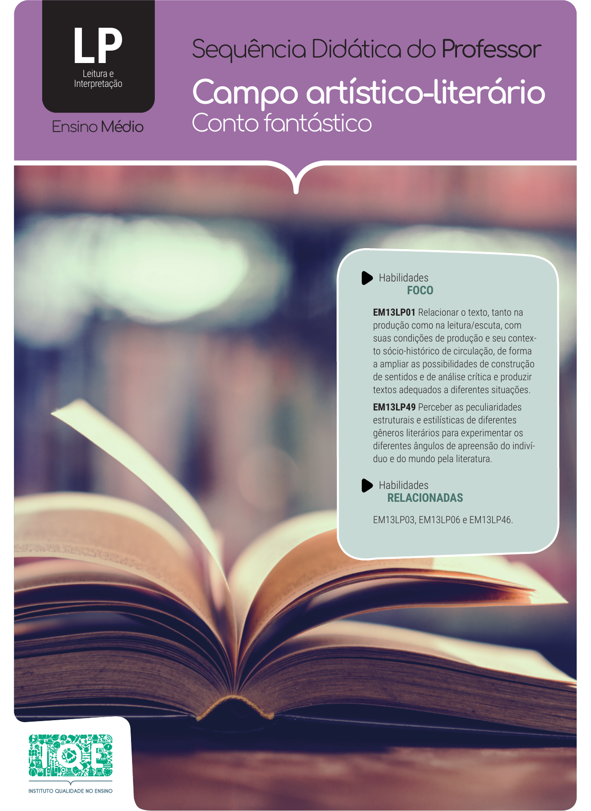 LP Leitura e Interpretação Sequência Didática do Professor Ensino Médio Habilidades FOCO EM13LP01 Relacionar o texto, tanto na produção como na leitura/escuta, com suas condições de produção e seu contex- to sócio-histórico de circulação, de forma a ampliar as possibilidades de construção de sentidos e de análise crítica e produzir textos adequados a diferentes situações. EM13LP49 Perceber as peculiaridades estruturais e estilísticas de diferentes gêneros literários para experimentar os diferentes ângulos de apreensão do indiví- duo e do mundo pela literatura. Habilidades RELACIONADAS EM13LP03, EM13LP06 e EM13LP46. Campo artístico-literário Conto fantástico EM.11.LP.3.31.8.P-2321 HABILIDADES RELACIONADAS/ BNCC: • EM13LP03 Analisar relações de intertextualidade e interdiscursivi- dade que permitam a explicitação de relações dialógicas, a identifi - cação de posicionamentos ou de perspectivas, a compreensão de paráfrases, paródias e estilizações, entre outras possibilidades. • EM13LP06 Analisar efeitos de sen- tido decorrentes de usos expres- sivos da linguagem, da escolha de determinadas palavras ou expres- sões e da ordenação, combinação e contraposição de palavras, dentre outros, para ampliar as possibilida- des de construção de sentidos e de uso crítico da língua. • EM13LP46 Compartilhar sentidos construídos na leitura/escuta de textos literários, percebendo dife- renças e eventuais tensões entre as formas pessoais e as coletivas de apreensão desses textos, para exercitar o diálogo cultural e agu- çar a perspectiva crítica. Sequência Didática | Língua Portuguesa | Leitura e Interpretação de Textos | Campo artístico-literário | Conto fantástico 3 Ponto de PARTIDA 1ª parte Certamente, ao longo da sua vida, dentro ou fora da escola, você se deparou com diversos gêneros literários, como poemas, romances, textos dramáticos e contos. Dentre esses, deve se lembrar dos contos de fada, de aventura, de sus- pense, de terror e contos fantásticos. Qual deles é seu preferido? Você tem o hábito/gosta de ler contos? Quem são os autores desse gênero que você conhece? Em que lugar podemos encontrar textos assim? Como são essas histórias? O que esse gênero tem de diferente dos outros? Em geral, que tipo de histórias são narradas nos contos? Comente Vamos fazer algo diferente! Por alguns minutos, tente se lembrar do último conto que você leu. Feito isso, preencha a fi cha a seguir em relação ao conto e, depois, compartilhe as informações com a turma. Título: Autor: • Sobre o que era a história? • Qual era o enredo? • Onde e em que tempo se passava? • Quem eram os personagens? DE OLHO NA BNCC CAMPO ARTÍSTICO-LITERÁRIO Neste campo, trata-se, principalmente, de levar os estudantes a ampliar seu repertório de leituras e selecionar obras signifi cativas para si, conseguindo apreender os níveis de leitura presentes nos textos e os discursos subjacen- tes de seus autores. [...] A prática da leitura literária, assim como de outras linguagens, deve ser capaz também de resgatar a historicidade dos textos: produção, circulação e recepção das obras literárias, em um entrecruzamen- to de diálogos (entre obras, leitores, tempos históricos) e em seus movi- mentos de manutenção da tradição e de ruptura, suas tensões entre códigos estéticos e seus modos de apreensão da realidade. Espera-se que os leitores/ fruidores possam também reconhecer na arte formas de crítica cultural e po- lítica, uma vez que toda obra expressa, inevitavelmente, uma visão de mundo e uma forma de conhecimento, por meio de sua construção estética. (BRASIL, 2017, p. 523) LP Leitura e Interpretação Ensino Médio Campo artístico-literário | Conto fantástico Orientação ao PROFESSOR 4 • E como era o narrador? • Como terminava o conto? Agora defi na com suas palavras • O que é um conto? • Para que um conto é escrito? 2ª parte Vamos discutir outra questão: o que é algo “fantástico” para você? Pense em outras palavras e expressões que podem servir de sinônimo. Cite um exemplo de alguma situação “fantástica” que você presenciou. O que aconteceu para você chamá-la de “fantástico”? No site www.sinonimos.com.br, entre as acepções para “fantástico” estão as seguintes palavras: Surpreendente, extraordinário, impressionante, incomum, espantoso, assombroso, fantasioso, irreal. Disponível em: https://www.sinonimos.com.br/fantastico/ Acesso em março de 2019. Já aconteceu alguma coisa estranha na sua vida? Algo que o surpreendeu muito e você não conseguiu explicar? • Pensando em tudo o que discutimos, defi na: o que é para você um “conto fantástico"? Ponto de PARTIDA Professor, o propósito do ponto de partida é encaminhar um debate com a turma, a fi m de levantar os conhecimentos prévios dos estudantes (de mundo, textuais, linguísticos), que envolvem o gênero tema desta sequência didática: o conto fantástico. Sendo assim, as questões propostas, a fi cha de recordação do conto e as defi nições servem para mobilizar os conheci- mentos construídos até o momento e formular hipóteses que poderão ou não serem confi rmadas ao longo dos estudos propostos nesta SD. É muito importante, nesse momen- to, ouvir os estudantes, deixá-los expressarem o que já sabem sobre o tema, formularem suas hipóteses, realizando uma “chuva de ideias". Tudo isso lhe dará subsídio para orientá-los nas demais atividades do material. Sendo assim, começa- mos a trabalhar alguns elementos da Habilidade Foco EM13LP01. Caso sinta necessidade, você pode aprofundar o conceito do “fantásti- co” ao explorar suas representações na mídia e cultura de massa, como séries, fi lmes, desenhos, HQs, apro- ximando-se do contexto dos alunos. Orientação ao PROFESSOR Sequência Didática | Língua Portuguesa | Leitura e Interpretação de Textos | Campo artístico-literário | C