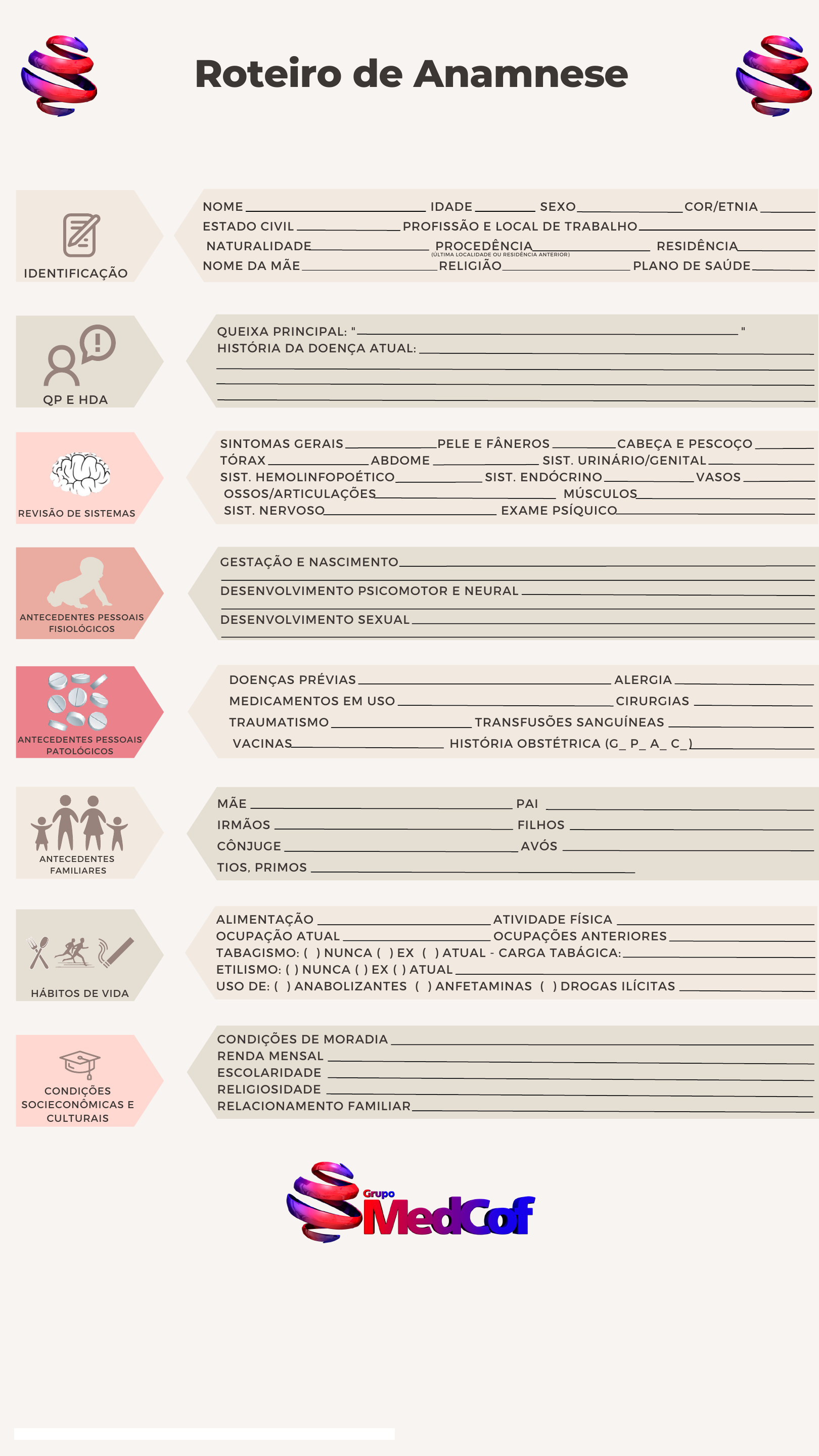 NOME IDADE SEXO COR/ETNIA ESTADO CIVIL PROFISSÃO E LOCAL DE TRABALHO NATURALIDADE PROCEDÊNCIA RESIDÊNCIA NOME DA MÃE RELIGIÃO PLANO DE SAÚDE Roteiro de Anamnese SINTOMAS GERAIS PELE E FÂNEROS CABEÇA E PESCOÇO TÓRAX ABDOME SIST. URINÁRIO/GENITAL SIST. HEMOLINFOPOÉTICO SIST. ENDÓCRINO VASOS OSSOS/ARTICULAÇÕES MÚSCULOS SIST. NERVOSO EXAME PSÍQUICO GESTAÇÃO E NASCIMENTO DESENVOLVIMENTO PSICOMOTOR E NEURAL DESENVOLVIMENTO SEXUAL DOENÇAS PRÉVIAS ALERGIA MEDICAMENTOS EM USO CIRURGIAS TRAUMATISMO TRANSFUSÕES SANGUÍNEAS VACINAS HISTÓRIA OBSTÉTRICA (G_ P_ A_ C_) CONDIÇÕES DE MORADIA RENDA MENSAL ESCOLARIDADE RELIGIOSIDADE RELACIONAMENTO FAMILIAR ALIMENTAÇÃO ATIVIDADE FÍSICA OCUPAÇÃO ATUAL OCUPAÇÕES ANTERIORES TABAGISMO: ( ) NUNCA ( ) EX ( ) ATUAL - CARGA TABÁGICA: ETILISMO: ( ) NUNCA ( ) EX ( ) ATUAL USO DE: ( ) ANABOLIZANTES ( ) ANFETAMINAS ( ) DROGAS ILÍCITAS QUEIXA PRINCIPAL: " " HISTÓRIA DA DOENÇA ATUAL: MÃE PAI IRMÃOS FILHOS CÔNJUGE AVÓS TIOS, PRIMOS (ÚLTIMA LOCALIDADE OU RESIDÊNCIA ANTERIOR) REVISÃO DE SISTEMAS IDENTIFICAÇÃO QP E HDA ANTECEDENTES PESSOAIS FISIOLÓGICOS CONDIÇÕES SOCIECONÔMICAS E CULTURAIS HÁBITOS DE VIDA ANTECEDENTES PESSOAIS PATOLÓGICOS ANTECEDENTES FAMILIARES Conteúdo licenciado para Andressa Ferreira Andrade - dedessa29ferreira@gmail.com