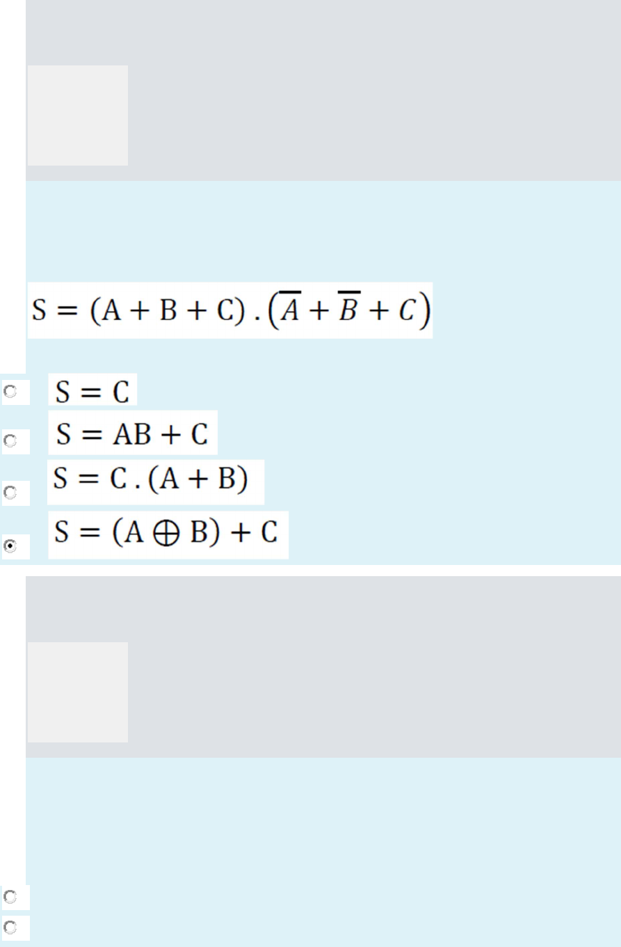 Questão 1 Completo Atingiu 2,00 de 2,00 Remover marcação Texto da questão Utilizando os conceitos da álgebra de Boole, marque a opção que representa corretamente a simplificação da expressão: Escolha uma opção: a. b. c. d. Questão 2 Completo Atingiu 2,00 de 2,00 Remover marcação Texto da questão Marque a opção que representa corretamente a conversão do número 72010 para o sistema binário. Escolha uma opção: a. 1111002 b. 10110010112 c. 1011012 d. 10110100002 Questão 3 Completo Atingiu 2,00 de 2,00 Remover marcação Texto da questão Marque a opção que representa corretamente a expressão executada pelo circuito lógico da figura a seguir: Escolha uma opção: a. b. c. d. Questão 4 Completo Atingiu 2,00 de 2,00 Remover marcação Texto da questão Marque a opção que representa corretamente a expressão capaz de gerar a tabela-verdade a seguir: Escolha uma opção: a. b. c. d. Questão 5 Completo Atingiu 2,00 de 2,00 Remover marcação Texto da questão Marque a opção que representa corretamente um circuito lógico capaz de encher ou esvaziar um tanque industrial por meio de duas eletroválvulas, sendo uma para a entrada do líquido, e outra, para o escoamento de saída. O circuito lógico, a partir da informação de um sensor de nível máximo no tanque e de um botão interruptor de duas posições, deve atuar nas eletroválvulas para encher o tanque totalmente (botão ativado) ou, ainda, esvaziá-lo totalmente (botão desativado). A figura a seguir ilustra o esquema de ligação: Convenções: Sensor A: Presença de água = nível 1 Ausência de água = nível 0 Interruptor I: Ativado = nível 1 Desativado = nível 0 Eletroválvulas EVE e EVS: Ligada = nível 1 Desligada = nível 0 Escolha uma opção: a. b. c. d. Questão 6 Completo Atingiu 2,00 de 2,00 Remover marcação Texto da questão Marque a opção que representa corretamente a função lógica executada pelo circuito a seguir: Escolha uma opção: a. b. c. d. Questão 7 Completo Atingiu 2,00 de 2,00 Remover marcação Texto da questão Utilizando mapa de Karnaugh, marque a opção que representa corretamente a simplificação da expressão: Escolha uma opção: a. b. c. d. Questão 8 Completo Atingiu 2,00 de 2,00 Remover marcação Texto da questão Marque a opção que representa corretamente a conversão do número 11010100012 para o sistema decimal. Escolha uma opção: a. 84910 b. 5610 c. 3210 d. 169610 Questão 9 Completo Atingiu 2,00 de 2,00 Remover marcação Texto da questão Marque a opção que representa corretamente os sinais aplicados às entradas da porta lógica a seguir e sua respectiva saída S: Escolha uma opção: a. b. c. d. Questão 10 Completo Atingiu 2,00 de 2,00 Remover marcação Texto da questão Marque a opção que representa corretamente a tabela-verdade da expressão: Escolha uma opção: a. b. c. d.