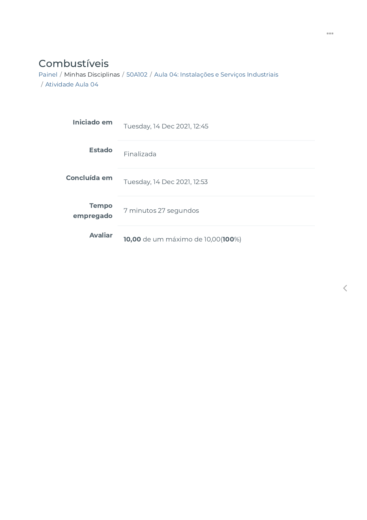 05/03/2022 17:58 Atividade Aula 04 https://ava.politecnicabr.com.br/mod/quiz/review.php?attempt=2396958 1/7 Painel / Minhas Disciplinas / 50A102 / Aula 04: Instalações e Serviços Industriais / Atividade Aula 04 Combustíveis Iniciado em Tuesday, 14 Dec 2021, 12:45 Estado Finalizada Concluída em Tuesday, 14 Dec 2021, 12:53 Tempo empregado 7 minutos 27 segundos Avaliar 10,00 de um máximo de 10,00(100%) https://ava.politecnicabr.com.br/my/ https://ava.politecnicabr.com.br/course/view.php?id=1078 https://ava.politecnicabr.com.br/course/view.php?id=1078#section-5 https://ava.politecnicabr.com.br/mod/quiz/view.php?id=37126 https://ava.politecnicabr.com.br/ 05/03/2022 17:58 Atividade Aula 04 https://ava.politecnicabr.com.br/mod/quiz/review.php?attempt=2396958 2/7 Questão 1 Correto Atingiu 2,00 de 2,00 Quanto a classi�cação do carvão por grau de incarbonização (%), marque a alternativa incorreta. Escolha uma opção: a. Turfa > 60. b. Antracite 92 - 95. c. Sub-betuminoso 75 - 80. d. Betuminoso 80 - 91. e. Linhite 60 - 75. https://ava.politecnicabr.com.br/ 05/03/2022 17:58 Atividade Aula 04 https://ava.politecnicabr.com.br/mod/quiz/review.php?attempt=2396958 3/7 Questão 2 Correto Atingiu 2,00 de 2,00 Quanto as característica térmica dos combustíveis, marque corretamente. Escolha uma opção: a. Tipo de reacção química: reacção endotérmica. b. Poder calorí�co: calor libertado na combustão completa por unidade de massa, volume ou mole de combustível (normalmente kJ/kg, kJ/m3 ou kJ/mole). c. Composição química: CnHmNoOpSq - hidrocarbonetos. d. λ - calor latente de vaporização sólida. e. Todas as alternativas anteriores erradas. https://ava.politecnicabr.com.br/ 05/03/2022 17:58 Atividade Aula 04 https://ava.politecnicabr.com.br/mod/quiz/review.php?attempt=2396958 4/7 Questão 3 Correto Atingiu 2,00 de 2,00 Marque Verdadeiro ou Falso sobre o coque de petróleo: ( ) Com o objectivo de corrigir as assimetrias criadas pela preferência do coque de petróleo em algumas indústrias portuguesas, os Ministérios da Economia e do Ambiente publicaram a Portaria 1387/2003 de 22 de Dezembro, tornando obrigatória a monitorização das emissões de gases e o cumprimento da legislação em vigor nas instalações que utilizem este combustível. ( ) Combustível sólido muito poluente e com um elevado potencial de perigosidade para a saúde humana e para o ambiente, nomeadamente pela sua composição em enxofre e metais pesados. Queima sem deixar cinzas. ( ) Produto sólido, negro e brilhante, obtido por craqueamento de resíduos pesados, essencialmente constituído por carbono (90 a 95%) Escolha uma opção: a. V, V, V. b. F, V, V. c. V, F, F. d. F, F, F. e. V, F, V. https://ava.politecnicabr.com.br/ 05/03/2022 17:58 Atividade Aula 04 https://ava.politecnicabr.com.br/mod/quiz/review.php?attempt=2396958 5/7 Questão 4 Correto Atingiu 2,00 de 2,00 Assinale a alternativa referente a Dessulfuração de Gasolina Pesada. Escolha uma opção: a. o gás sulfídrico separado é enviado para a unidade de recuperação de enxofre e os hidrocarbonetos encaminhados para a rede de fuel-gás. b. A maior parte do petróleo tratado é usado como combustível para a aviação, sob a designação de jetfuel. c. O petróleo separado na destilação atmosférica contém vários contaminantes, especialmente sulfuretos orgânicos, designados tióis ou mercaptanos, que corroem os metais e exalam um odor desagradável. d. O hidrogénio produzido, depois de puri�cado (PSA), é usado como co-reagente nos processos catalíticos hidrogenantes. Os hidrocarbonetos leves produzidos na reacção são enviados para a recuperação. e. O propósito desta operação é converter os hidrocarbonetos nafténicos e parafínicos em aromáticos (reformação catalítica), libertando hidrogénio como sub-produto de reacção. https://ava.politecnicabr.com.br/ 05/03/2022 17:58 Atividade Aula 04 https://ava.politecnicabr.com.br/mod/quiz/review.php?attempt=2396958 6/7 Questão 5 Correto Atingiu 2,00 de 2,00 Entre as principais propriedades características dos combustíveis sólidos, marque a alternativa correta. Escolha uma opção: a. Percentagem de cinzas e sua temperatura de fusão. b. Fusibilidade das cinzas. c. Percentagem de matérias voláteis e minerais. d. Dilatação por efeito de humidade. e. Todas as alternativas estão corretas. Entre em Contato https://www.politecnicabr.com.br 0800 084 2627 indisponível devido a pandemia de COVID-19, use outro canal! 0800 084 2627 comercial@politecnicabr.com.br Links Úteis Dicas da nossa Diretora Acadêmica Planner de Estudos Declaração de Matrícula Orientações do AVA Abertura de Ticket Fale com o Tutor Cronograma de Estudos Manual de Estágio Manual de Competência Siga-nos nas redes sociais https://www.politecnicabr.com.br/ mailto:comercial@politecnicabr.com.br https://soundcloud.com/user-501638417/sets/escola-politecnica-brasileira https://storage.googleapis.com/sirius-pubstore/semestre_plannerdeestudo%20poli.pdf https://storage.googleapis.com/sirius-pubstore/declaracao_matricula.pdf https://storage.googleapis.com/sirius-pubstore/orientacoes_ava.pdf https://storage.googleapis.com/sirius-pubstore/abertura_ticket.pdf https://storage.googleapis.com/sirius-pubstore/fale_com_tutor.pdf https://storage.googleapis.com/sirius-pubstore/cronograma_estudos.pdf https://storage.googleapis.com/sirius-pubstore/manual_estagio.pdf https://storage.googleapis.com/sirius-pubstore/manual_competencia.pdf https://ava.politecnicabr.com.br/ 05/03/2022 17:58 Atividade Aula 04 https://ava.politecnicabr.com.br/mod/quiz/review.php?attempt=2396958 7/7 © 2020 - Escola Politécnica Brasileira https://ava.politecnicabr.com.br/mod/quiz/0 https://www.facebook.com/politecnicabr https://www.instagram.com/politecnicabr_oficial https://ava.politecnicabr.com.br/