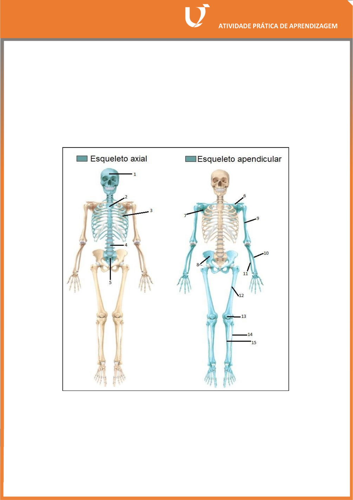 1) . Atividade Proposta: 1) O esqueleto humano adulto é formado por 206 ossos, sendo dividido em esqueleto axial e apendicular. A imagem abaixo representa em azul alguns ossos correspondentes ao esqueleto axial e apendicular, a respeito desta temática nomeie os ossos (ou grupos de ossos) identificados na imagem através de número. Esqueleto Axial Esqueleto Apendicular 1-Neurocrânio 6- Clavícula 11- Ulna 2- Osso Externo 7- Escápula 12- Fêmur 3- Costelas 8- Cintura Pélvica 13- Paleta 4- Coluna Vertebral 9- Ùmero 14- Fíbula 5- Osso Sacro 10- Rádio 15- Tíbia 2) O crânio é dividido em neurocrânio (ossos do crânio) e viscerocrânio (ossos da face), sendo a estrutura óssea mais complexa do corpo, envolvendo e protegem o encéfalo, além de fornecerem locais de fixação para alguns músculos do pescoço e da cabeça. Sobre os ossos dos crânios, observe a imagem nomeie os 8 ossos do crânio e os 14 ossos da face. 1- Frontal 8- Etmoide 2- Pariental 9- Zigomático 3- Esfenoide 10- Maxilar 4- Temporal 11- Concha Nasal Inferior 5- Occipital 12- Vômer 6- Lacrimal 13- Mandíbula 7- Nasal 1) Antônio 13 anos foi atingido na face durante uma prática de beisebol. E uma radiografia revelou múltiplas fraturas dos ossos ao redor da órbita. Nomeie os ossos que formam as margens de uma órbita. Os ossos que formam as margens da órbita ocular são: osso esfenoide, etmoide, frontal, maxilar superior, zigomático lacrimal e palatino. Superior (teto): osso frontal, asa menor do osso esfenoide Inferior (pavimento): face orbital da maxila, face orbital do osso zigomático, processo orbital do osso palatino. Medial: placa orbital do osso etmoide, processo frontal da maxila, osso lacrimal Lateral: processo frontal do osso zigomático, asa maior do osso esfenoide. e SISTEMA RESPIRATÓRIO 2 Atividade de Problematização Proposta: Segundo o Instituto Nacional de Câncer (INCA) em 2020 no Brasil a estimativa de câncer Neoplasia Maligna da Laringe foi de 6470 novos casos por 100 mil homens e 1.180 casos para cada 100 mil mulheres. J. T. S, 63 anos, sexo masculino, fumante, foi diagnóstico com câncer de laringe, sendo necessário a realização de um procedimento cirúrgico denominado de laringectomia total que consiste na remoção da laringe indicado em casos de câncer nesta estrutura, este procedimento altera a condução do ar, por esta razão posteriormente o paciente é submetido a uma traqueostomia permanente que consiste em realizar uma abertura da parede anterior da traqueia, fazendo uma comunicação da mesma com o meio externo, com o objetivo de proporcionar ao paciente a possibilidade de respirar. Sobre este caso clínico, responda os seguintes questionamentos. A) Descreva a constituição e função da laringe. A laringe é um órgão constituído por cartilagens, músculos, membranas e ligamentos que atuam em conjunto na deglutição. A laringe é um órgão em forma de cone que se localiza na região anterior do pescoço. Ela permite a passagem do ar quando respiramos. também impede que corpos estranhos adentrem as vias respiratórias inferiores, causando infecções nos pulmões. A laringe é um órgão localizado na região anterior do pescoço. Participa da fala, respiração e faz a conexão da faringe com a traqueia. A laringe também nos proporciona a fala, através de um complexo processo de movimentação das pregas vocais (também conhecidas como cordas vocais, que se localizam no interior da laringe) e vibração de estruturas. Quando o ar passa pela laringe faz vibrar essas estruturas possibilitando emitirmos sons. Tudo isso é complementado pelos movimentos das estruturas faríngeas, nasais e orais, através das quais articulamos as palavras. Referência: Dr. Arthur Vicentini da Costa Luiz Publicado em 1 de novembro de /021 https://arthurvicentini.com.br/qual-a-funcao-da-laringe-e-quais-as-doencas-relacionadas-a-ela/#:~:text=A%20laringe%20%C3%A9%20um%20%C3%B3rg%C3%A3o%20em%20forma%20de%20cone%20que,inferiores%2C%20causando%20infec%C3%A7%C3%B5es%20nos%20pulm%C3%B5es. Acesso em 05 de fevereiro de 2023. B) A traqueostomia é um procedimento caracterizado por uma abertura da parede anterior da traqueia, fazendo uma comunicação da mesma com o meio externo. Descreva a constituição da traqueia. A Traqueia é uma porção do sistema respiratório que atua como um canal para a passagem de ar. Esse órgão inicia-se logo após a laringe e segue até o local onde se ramifica em brônquios. Situada na região anterior ao esôfago, a traqueia é constituída por uma série de cartilagens em formato de “C”, as quais são importantes para evitar o seu colapso e garantir uma passagem adequada de ar até os pulmões. Referência: SANTOS, Vanessa Sardinha dos. "Traqueia"; Brasil Escola. Disponível em: https://brasilescola.uol.com.br/biologia/traqueia.htm Acesso em 05 de fevereiro de 2023. C) A imagem abaixo ilustra as estruturas anatômicas que pertencem ao sistema respiratório. Observe a imagem e nomeie as estruturas enumeradas. 1- Concha Nasal Superior 6- Traquéia 2- Concha Nasal Média 7- Brônquio 3- Concha Nasal Inferior 8- Lóbulo Superior Direito 4- Faringe 9- Lóbulo Médio Direito 5- Laringe 10- Lóbulo Inferior Direito