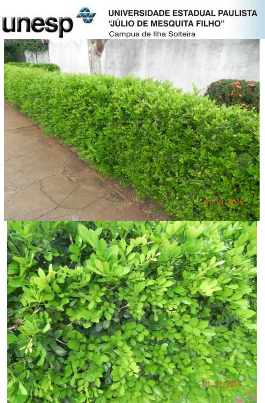Plantas de falsa-murta Plantas de falsa-murta Cochonilha em ramo de falsa-murta Larva minadora em folhas de falsa-murta Larva minadora em folhas de falsa-murta Descoloração em folhas de falsa-murta provocada pelo ácaro Tetranychus mexicanus