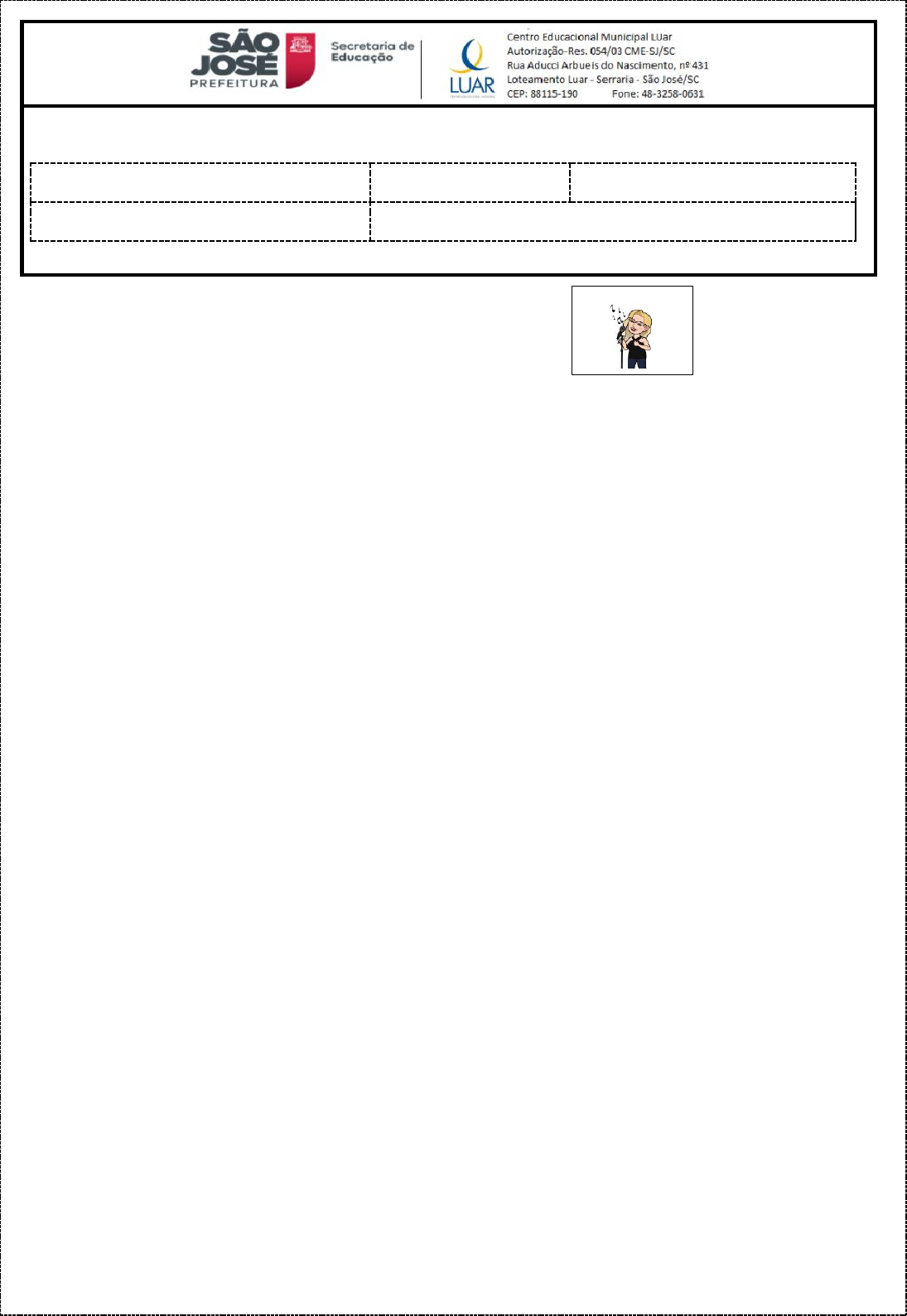 Centro Educacional Municipal Luar Ensino Fundamental I – Anos Iniciais Professor(a): __ Entrega ___ Ano /Turma:___ Disciplina: Data: ___/___/2023 Aluno(a): MEU ABRIGO (Melim) Desejo a você O que há de melhor A minha companhia Pra não se sentir só O sol, a lua e o mar Passagem pra viajar Pra gente se perder E se encontrar Vida boa, brisa e paz Nossas brincadeiras ao entardecer Rir atoa é bom demais O meu melhor lugar sempre é você Você é a razão da minha felicidade Não vá dizer que eu não sou sua cara- metade Meu amor, por favor, vem viver comigo No seu colo é o meu abrigo Quero presentear Com flores Iemanjá Pedir um paraíso Pra gente se encostar Uma viola a tocar Melodias pra gente dançar A benção das estrelas A nos iluminar Vida boa, brisa e paz Trocando olhares ao anoitecer Rir à toa é bom demais Olhar pro céu, sorrir e agradecer 1) Qual o título dessa música? R: __________________________________________________________________ 2) Você já conhecia essa música? Do que ela fala? R: ____________________________________________________________________ ____________________________________________________________________ ____________________________________________________________________ 3) Podemos encontrar muitas rimas em uma música, me ajude a descobrir o que rima com: MAR ______________________________________________________________ FELICIDADE ________________________________________________________ PRESENTEAR _______________________________________________________ ANOITECER_________________________________________________________ AMOR ______________________________________________________________ 4) Vamos achar as palavras abaixo: 5) O termo “Meu abrigo” na música tem qual significado? ( ) Proteção ( ) Fé ( ) Saudade ( ) Amor 6) Faça uma ilustração bem bonita, simbolizando a música que você aprendeu: 7
