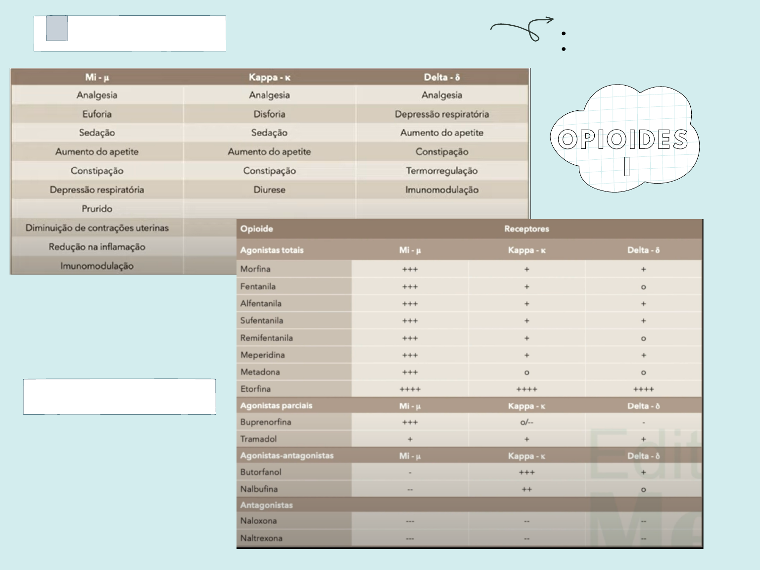 OPIOIDESOPIOIDES II OS OPIOIDES ATUAM NOS RECEPTORES OPIOIDES, CHAMADOS DE: MI, K E DELTA CÉREBRO MEDULA ESPINAL MAIORIA LOCALIZADOS NO SNC RECEPTORES E SUAS FUNÇÕES ATUAÇÃO DOS OPIOIDES NOS RECEPTORES fonte: Anestesia é o básico - Vet Anesthesia Unravelled - NAVE, Núcleo de Anestesiologia Veterinária OPIOIDESOPIOIDES III I analgesia: diminuição da liberação de neurotransmissores excitatórios (serotonina e noraepinefrina) e hiperpolarização de nós receptores (fibras C - tardia de dor) sedação: não consegue obter com todos opioides, alguns provocam euforia cardiovascular: são modestas, bradicardia, mas sem mudar o DC pulmonar: efeitos raros, atenção em neonato, rigidez torácica (reverter com o antagonista) digestório: êmese (morfina e meripidina), diminui a propussão do intestino (diminui movimento intestinal) imunosupressão: morfina, diminui a atividade linfocitária e interferon -- causa imunosupressão características para: EFEITOS GERAIS analgesia sedação cardiovascular pulmonar digestório imunosupressão OBS: MORFINA E MEPERIDINA PROMOVEM LIBERAÇÃO DE HISTAMINA (IV) TENDO HIPOTENSÃO