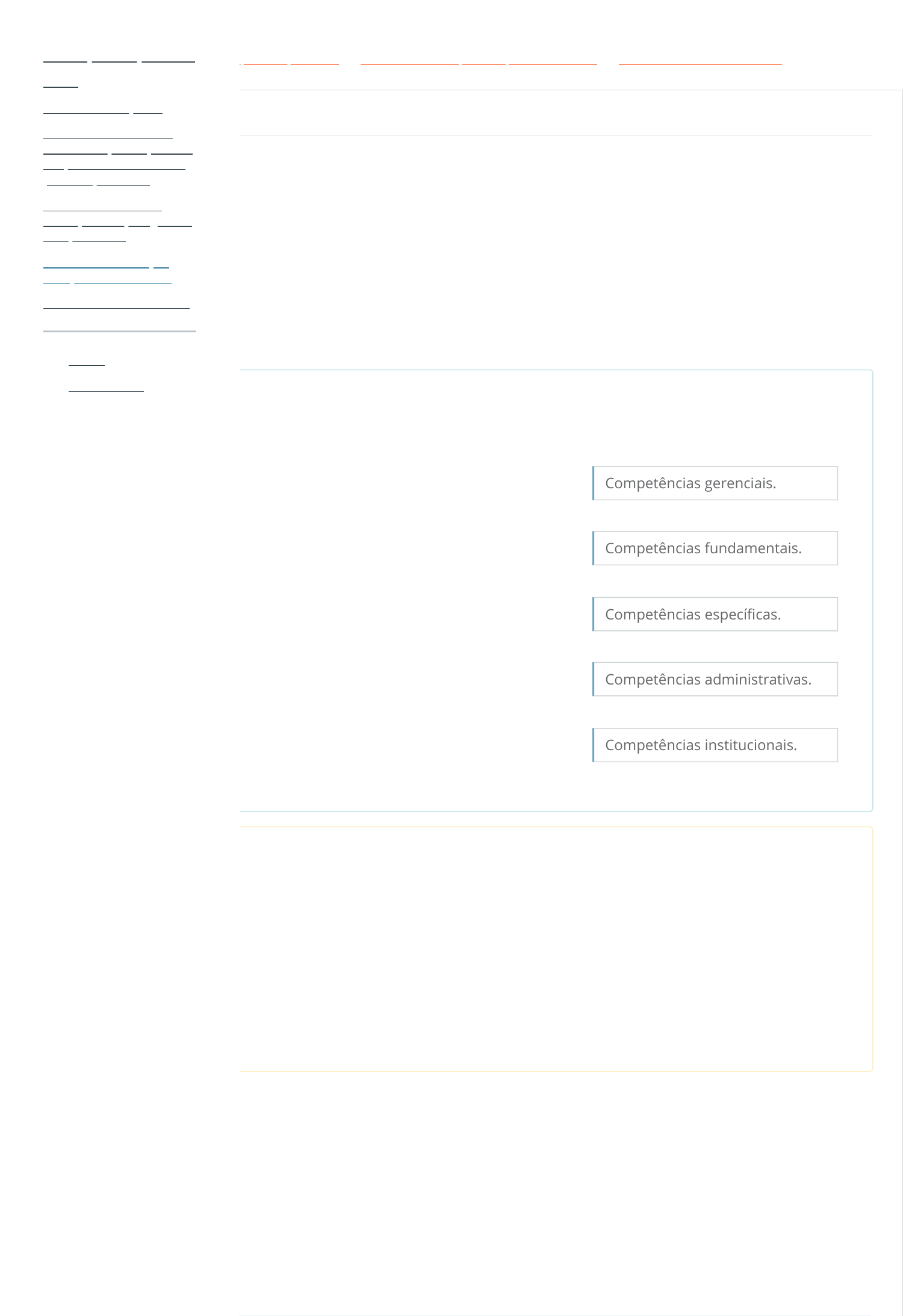 Painel / Meus cursos / Gestão por Competências / Módulo 3: Gestão por Competências na RFB / Exercício Avaliativo - Módulo 3 Questão 1 Correto Atingiu 1,00 de 1,00 Iniciado em segunda, 13 fev 2023, 14:59 Estado Finalizada Concluída em segunda, 13 fev 2023, 15:03 Tempo empregado 3 minutos 43 segundos Notas 9,00/9,00 Avaliar 32,00 de um máximo de 32,00(100%) O Mapeamento de Competências é realizado com a participação de vários servidores de diferentes níveis organizacionais. As competências são identificadas com o emprego de técnicas de mapeamento, a partir de fontes diferentes para cada tipo de competência. Considerando as fontes de consulta e os tipos de competências, relacione as informações abaixo: Competências relacionadas aos ocupantes de postos gerenciais. Competências ligadas a todos os servidores. Competências ligadas aos vários processos de trabalho da Cadeia de Valor. Competências relacionadas às atividades de apoio administrativo e assessoria. Competências derivadas do Mapa Estratégico, refletem os atributos que tornam a organização eficaz para alcançar os objetivos e geram benefícios para a sociedade. Competências gerenciais. Competências fundamentais. Competências específicas. Competências administrativas. Competências institucionais. Sua resposta está correta. A opções corretas são: a. Competências relacionadas aos ocupantes de postos gerenciais. – Competências gerenciais. b. Competências ligadas a todos os servidores. – Competências fundamentais. c. Competências ligadas aos vários processos de trabalho da Cadeia de Valor. – Competências específicas. d. Competências relacionadas às atividades de apoio administrativo e assessoria. – Competências administrativas. e. Competências derivadas do Mapa Estratégico, refletem os atributos que tornam a organização eficaz para alcançar os objetivos e geram benefícios para a sociedade. - Competências institucionais. Gestão por Competências Notas Área do Participante Módulo 1: Modelos de administração de pessoal e o panorama da Gestão por Competências Módulo 2: Conceitos, definições e tipologias de competências Módulo 3: Gestão por Competências na RFB Módulo de Encerramento Painel Meus cursos https://mooc38.escolavirtual.gov.br/my/ https://mooc38.escolavirtual.gov.br/course/view.php?id=9749 https://mooc38.escolavirtual.gov.br/course/view.php?id=9749#section-3 https://mooc38.escolavirtual.gov.br/mod/quiz/view.php?id=184351 https://mooc38.escolavirtual.gov.br/course/view.php?id=9749 https://mooc38.escolavirtual.gov.br/grade/report/index.php?id=9749 https://mooc38.escolavirtual.gov.br/course/view.php?id=9749#section-0 https://mooc38.escolavirtual.gov.br/course/view.php?id=9749#section-1 https://mooc38.escolavirtual.gov.br/course/view.php?id=9749#section-2 https://mooc38.escolavirtual.gov.br/course/view.php?id=9749#section-3 https://mooc38.escolavirtual.gov.br/course/view.php?id=9749#section-4 https://mooc38.escolavirtual.gov.br/my/ https://www.escolavirtual.gov.br/aluno/cursos/andamento Questão 2 Correto Atingiu 1,00 de 1,00 Questão 3 Correto Atingiu 1,00 de 1,00 Sobre as etapas da Gestão por Competências, analise as proposições a seguir, preenchendo as lacunas com as opções correspondentes: A Gestão por Competências na RFB é estruturada com base em três etapas, que são o ________________________, o ____________________________ e a _______________________. Na fase de Mapeamento, são identificadas as competências necessárias ao desempenho excelente dos servidores e o resultado dessa etapa é __________________________________ A sequência está correta em: Escolha uma opção: a. Mapeamento de Competências; Diagnóstico de Necessidades de capacitação; Capacitação de Desenvolvimento de Competências; e o Inventário de Competências. Parabéns, este é o item correto. b. Mapeamento; Associação de Competências; Diagnóstico de Necessidades de capacitação; e a Cadeia de Valor. c. Diagnóstico de Lacunas; Apuração dos Resultados; Planejamento da Capacitação; e Cadeia de Valor. d. Mapeamento de Competências; Diagnóstico; Planejamento da Capacitação; e Cadeia de Valor. e. Planejamento Estratégico; Mapeamento; Diagnóstico; e Análise Documental. Sua resposta está correta. A opção correta é: a) A Gestão por Competências na RFB é estruturada com base em três etapas, que são o Mapeamento de Competências, o Diagnóstico de Necessidades de capacitação e a Capacitação de Desenvolvimento de Competências. Na fase de Mapeamento, são identificadas as competências necessárias ao desempenho excelente dos servidores e o resultado desta etapa é o Inventário de Competências. Feedback: O modelo adotado pela RFB inicia-se diretamente com o Mapeamento de competências, a partir do Mapa estratégico definido para o período. As competências mapeadas compõem o Inventário de Competências. O Diagnóstico de Necessidades de Capacitação é realizado periodicamente por meio de questionários eletrônicos. Seus resultados são utilizados no planejamento das ações de Capacitação e Desenvolvimento. O Diagnóstico de Competências é realizado a partir de respostas a questionários sobre a necessidade de capacitação que os servidores apresentam nas competências avaliadas. Sobre os diversos níveis de avaliação possíveis, é correto afirmar que: I. A autoavaliação produz resultados mais confiáveis, uma vez que a própria pessoa sabe, melhor que qualquer outra, os pontos em que precisa se desenvolver. II. Quanto mais observadores forem consultados, mais próximos da realidade serão os resultados. III. A avaliação 360º, que envolve todos os níveis de avaliação possíveis (autoavaliação, avaliação pela chefia, pelos pares e pelos clientes) é impossível de ser realizada na prática, por ser complexa e apresentar resultados muito divergentes. IV. Para a realização de uma avaliação 360º, é importante que as