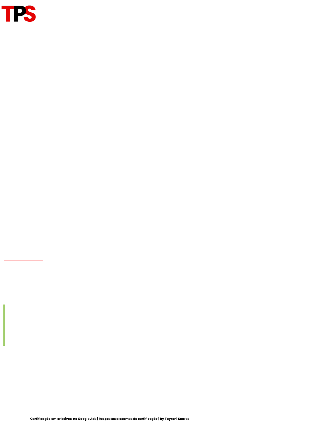 1 Pequena descrição: Neste documento você encontrará todas as questões do exame com respostas 100% corretas e verificadas. Exame de certificação de Criativos do Google Ads. Respostas do exame Certificação de Display do Google Ads Quais são os dois principais formatos que podem ser usados em uma campanha de anúncios gráficos do Google? Anúncios da rede de pesquisa Anúncios de upload Anúncios sociais Anúncios gráficos responsivos Qual das opções a seguir é um benefício do uso de anúncios gráficos responsivos? Simplicidade Automação Controle Alcance Com os anúncios de upload, os anunciantes têm acesso a mais inventários do que o oferecido pelos anúncios gráficos responsivos. Verdadeiro Falso O primeiro passo para anunciar com o Google Ads é criar campanhas baseadas nos seus objetivos comerciais. Qual tipo você escolheria para cada um dos cenários a seguir? Estes anúncios aparecem por conta própria ou em outros tipos de conteúdo de streaming de vídeo no YouTube e na Rede de Display do Google. Estes anúncios incentivam o engajamento, além de instalações e compras no app. Eles aparecem na Pesquisa Google, na Rede de Display e também são exibidos no Google Play e no YouTube. Estes anúncios promovem seus produtos fornecendo aos usuários informações detalhadas sobre o que você vende. Eles aparecem no Google Shopping e ao lado dos resultados da pesquisa. Estes anúncios são exibidos ao lado dos resultados na Pesquisa Google e em outros sites parceiros, como o YouTube, quando as pessoas pesquisam produtos ou serviços que você oferece. Vídeo (1) Rede de pesquisa (4) Universais para apps (2) Shopping (3) Como o Google Ads pode ajudar você a alcançar suas metas comerciais? Gerando reconhecimento da marca. Impulsionando as vendas na loja, on-line, pelo app e por telefone. Influenciando a consideração dos seus produtos e serviços. Todas as alternativas. Quais são os três principais componentes de automação das campanhas inteligentes da Rede de Display? Lances automáticos Conversões automáticas Criativos automáticos Segmentação automática Qual das alternativas a seguir não é um componente da proposta de valor dos anúncios gráficos do Google? Intenção Aprendizado de máquina Desempenho Rede de pesquisa Combine cada estratégia de lances automáticos com a meta da campanha mais adequada. Parcela de impressões desejada Maximizar cliques ROAS desejado CPA desejado Receita (3) Visibilidade (1) Tráfego (2) Conversões (4) Qual das opções a seguir é um dos principais benefícios dos lances automáticos do Google Ads? Lances durante o leilão Andamento do orçamento diário Lances com base na parcela de impressões Lances com base no código do usuário Quais são os três objetivos de marketing que podem ser alcançados com a segmentação nos anúncios gráficos do Google? Aumentar o reconhecimento Gerar ações Gerar popularidade Influenciar a consideração Quais são os dois tipos de remarketing que podem ser usados nos anúncios gráficos do Google? Remarketing personalizado Remarketing dinâmico Remarketing de e-mail Remarketing padrão Qual é a melhor opção de segmentação para gerar reconhecimento da marca? Afinidade Intenção personalizada No mercado Remarketing Qual é a melhor opção de segmentação para influenciar a consideração? Afinidade personalizada Intenção personalizada Informações demográficas Remarketing Qual é um dos principais benefícios dos anúncios de display responsivos? Selecionar imagens das bibliotecas incorporadas. Fazer upload do seu próprio recurso do criativo. Configurar anúncios para serem executados em espaços qualificados para banners. Fazer upload de anúncios próprios usando modelos. O que um anúncio de display responsivo usa no modelo de machine learning para determinar a melhor combinação de recursos para o espaço de anúncio? Previsões baseadas no seu histórico de performance Previsões baseadas em dados do portfólio de anúncios, agregados de vários comparativos de mercado Previsões baseadas nos dados de performance do setor Previsões baseadas em arquivos exportados do seu CRM Manuela tem uma empresa grande que vende materiais de arte em uma loja física e on-line. Ela quer aumentar o reconhecimento da marca e impulsionar as vendas. Como anúncios de display do Google podem ajudar Manuela a atingir esses objetivos? Os recursos de mensuração de performance de anúncios de display do Google selecionam as metas de marketing da empresa automaticamente, sem que ela precise intervir. Eles usam os melhores sinais de intenção para relacionar os anúncios da Manuela ao conteúdo mais relevante. Eles permitem que os clientes dela comprem materiais de arte diretamente dos anúncios. Eles permitem que os anúncios da Manuela sejam exibidos para pessoas que estejam procurando materiais de arte, acima dos resultados de pesquisa do Google. Relacione cada objetivo de negócios ao tipo de campanha do Google Ads mais adequado para alcançar o resultado pretendido. Cada tipo de campanha pode ser usado apenas uma vez. Aumentar o engajamento, as instalações e as ações no app (como se inscrever em uma newsletter). Anunciar o inventário on-line e local de uma empresa e aumentar o tráfego do site ou da loja. Aumentar a exposição e alcançar públicos-alvo com interesses específicos na Web. Campanha para apps (1) Campanha do Shopping (2) Campanha de display (3) Qual formato de anúncio de display é recomendado se você estiver preocupado com malwares e quiser uma experiência de anúncios segura em todas as plataformas? Anúncios responsivos de display Anúncios gráficos Anúncios HTML para AMP Anúncios de pesquisa Uma gerente de campanhas de pesquisa do Google quer ampliar o alcance usando os anúncios de display. Ela está tentando decidir se quer usar a segmentação otimizada padrão ou adicionar mais camadas de segmentação manualmente. Ela quer ter o mesmo nível 