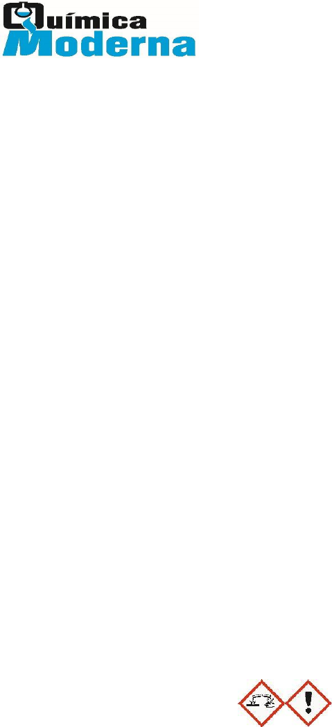 FICHA DE INFORMAÇÃO DE SEGURANÇA DE PRODUTOS QUÍMICOS – FISPQ De acordo com a NBR 14725-4:2014 Data da emissão: 01/10/12 Data da revisão 11/11/15 revisão nº 02 Fispq Nº 002 Química Moderna – Acido Clorídrico 37% PA – ACS Revisão 02 – Data da revisão:11/11/15 Página 1 de 8 1. IDENTIFICAÇÃO DO PRODUTO E DA EMPRESA 1.1 Identificadores do produto Nome do produto : ACIDO CLORIDRICO PA ACS/ISO Referência do Produto : QMA0000112090 / QMG0000412090 Marca : Química Moderna 1.2 Outros meios de identificação dados não disponíveis 1.3 Utilizações identificadas relevantes da substância ou mistura e utilizações desaconselhadas Só para utilização em laboratório. Não para utilização farmacêutica, doméstica ou outras utilizações. 1.4 Identificação do fornecedor da ficha de dados de segurança Empresa : Química Moderna Ind. e Com Ltda. Rua Titicaca, 813 06412-080 - Barueri - SP BRASIL Telefone : +55 11 2391 0950 Número de Fax : +55 11 4198 1064 Email endereço : laboratório@quimicamoderna.net.br 1.5 Número de telefone de emergência : (11) 2391 0950 2. IDENTIFICAÇÃO DE PERIGOS 2.1 Classificação GHS Corrosão cutânea (Categoria 1B) Lesões oculares graves (Categoria 1) Toxicidade para órgãos-alvo específicos - exposição única (Categoria 3), Sistema respiratório 2.2 Elementos da Etiqueta GHS, incluindo declarações de prevenção Pictograma Palavra de advertência Perigo Frases de Perigo H314 Provoca queimaduras na pele e lesões oculares graves. H335 Pode provocar irritação das vias respiratórias. Frases de Precaução Prevenção P261 Evitar respirar as poeiras/ fumos/ gases/ névoas/ vapores/ aerossóis. P264 Lavar a pele cuidadosamente após manuseamento. P271 Utilizar apenas ao ar livre ou em locais bem ventilados. P280 Usar luvas de proteção/ vestuário de proteção/ proteção ocular/ proteção facial. FICHA DE INFORMAÇÃO DE SEGURANÇA DE PRODUTOS QUÍMICOS – FISPQ De acordo com a NBR 14725-4:2014 Data da emissão: 01/10/12 Data da revisão 11/11/15 revisão nº 02 Fispq Nº 002 Química Moderna – Acido Clorídrico 37% PA – ACS Revisão 02 – Data da revisão:11/11/15 Página 2 de 8 Resposta P301 + P330 + P331 EM CASO DE INGESTÃO: enxaguar a boca. NÃO provocar o vómito. P303 + P361 + P353 SE ENTRAR EM CONTATO COM A PELE (ou o cabelo): despir/ retirar imediatamente toda a roupa contaminada. Enxaguar a pele com água/ tomar um banho. P304 + P340 EM CASO DE INALAÇÃO: retirar a vítima para uma zona ao ar livre e mantê-la em repouso numa posição que não dificulte a respiração. P305 + P351 + P338 SE ENTRAR EM CONTATO COM OS OLHOS: enxaguar cuidadosamente com água durante vários minutos. Se usar lentes de contato, retire-as, se tal lhe for possível. Continuar a enxaguar. P310 Contate imediatamente um CENTRO DE INFORMAÇÃO ANTIVENENOS ou um médico. P321 Tratamento específico (ver as instruções suplementares de primeiros socorros no presente rótulo). P363 Lavar a roupa contaminada antes de a voltar a usar. Armazenagem P403 + P233 Armazenar em local bem ventilado. Manter o recipiente bem fechado. P405 Armazenar em local fechado à chave. Destruição P501 Eliminar o conteúdo/ recipiente em instalação aprovada de destruição de resíduos. 2.3 Outros Perigos - nenhum(a) 3. COMPOSIÇÃO E INFORMAÇÕES SOBRE OS INGREDIENTES 3.1 Misturas Formula : HCl Peso Molecular: 36,46 g/mol Componente Classificação Concentração Ácido Clorídrico No. CAS 7647-01-0 Pele Corr. 1B; Olhos Dan. 1; 30 - 60 % TOX SE 3; H314, H335 Para ver o texto completo das frases de riscos e segurança mencionadas nesta seção, ver seção 16 4. MEDIDAS DE PRIMEIROS-SOCORROS 4.1 Descrição das medidas de primeiros socorros Recomendação geral Consultar um médico. Mostrar esta ficha de segurança ao médico de serviço. Se for inalado Se for respirado, levar a pessoa para o ar fresco. Se não respirar, dar respiração artificial. Consultar um médico. No caso de contato com a pele Despir imediatamente a roupa e os sapatos contaminados. Lavar com sabão e muita água. Consultar um médico. FICHA DE INFORMAÇÃO DE SEGURANÇA DE PRODUTOS QUÍMICOS – FISPQ De acordo com a NBR 14725-4:2014 Data da emissão: 01/10/12 Data da revisão 11/11/15 revisão nº 02 Fispq Nº 002 Química Moderna – Acido Clorídrico 37% PA – ACS Revisão 02 – Data da revisão:11/11/15 Página 3 de 8 No caso de contato com os olhos Lavar cuidadosamente com muita água, durante pelo menos quinze minutos, e consultar o médico. Se for engolido NÃO provocar vómitos. Nunca dar nada pela boca a uma pessoa inconsciente. Enxaguar a boca com água. Consultar um médico. 4.2 Sintomas e efeitos mais importantes, tanto agudos como retardados Sensação de queimadura, Tosse, respiração ruidosa, laringite, Respiração superficial, espasmo, inflamação e edema da laringe, espasmo, inflamação e edema dos brônquios, pneumonia, edema pulmonar, O material é extremamente destrutivo para os tecidos das membranas mucosas e para o trato respiratório superior, os olhos e a pele. 5. MEDIDAS DE COMBATE A INCÊNDIO 5.1 Meios de extinção Meios adequados de extinção Utilizar água pulverizada, espuma resistente ao álcool, produto químico seco ou dióxido de carbono. 5.2 Perigos especiais decorrentes da substância ou mistura Cloreto de hidrogénio gasoso 5.3 Recomendações para o pessoal de combate a incêndios Usar equipamento de respiração autónomo para combate a incêndios, se necessário. 5.4 Outras informações : dados não disponíveis 6. MEDIDAS DE CONTROLE PARA DERRAMAMENTO OU VAZAMENTO 6.1 Precauções individuais, equipamento de proteção e procedimentos de emergência Usar equipamento de proteção individual. Evitar a respiração do vapor/névoa/gás. Assegurar ventilação adequada. Evacuar o pessoal para áreas de segurança. 6.2 Precauções a nível ambiental Não permitir a entrada do produto no sistema de esgotos. 6.3 Métodos e materiais de c