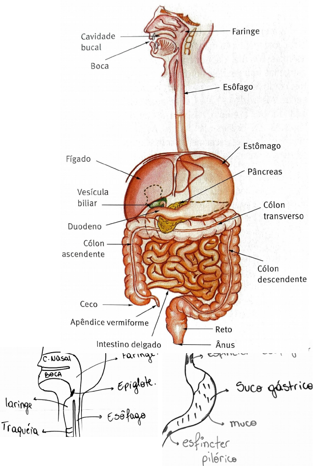 Sistema digestivo Digestão: responsável pela quebra e assimilação do alimento; transforma polissacarídeos em glicose, as proteínas em aminoácidos e os lipídios em glicerol e ácidos graxos. Processos mecânicos: quebra física; preparação e mistura dos alimentos com as enzimas, para a efetivação dos processos químicos → mastigação, deglutição e peristaltismo → regulados por ação nervosa. Deglutição: passagem do bolo alimentar da boca para o esôfago com a movimentação da epiglote, evitando a entrada no trato respiratório → chamada de movimentos peristálticos quando a pessoa está de ponta-cabeça. Processos químicos: quebra enzimática; regulados por ação nervosa e hormonal → saliva. Tubo digestório: boca → faringe → esôfago → estômago → intestino delgado → intestino grosso → reto → ânus + glândulas anexas (glândulas salivares, fígado e pâncreas). Funções da saliva: umidificação, manutenção do pH (aproximado de 7,0), potencialização do sabor e ação bactericida e enzimática (contém a amilase salivar ou ptialina, que age sobre carboidratos). Obs.: na boca o alimento é transformado em bolo alimentar. Digestão do amido: feita através de duas enzimas específicas: amilase pancreática e ptialina. Esfíncter (cárdia): músculo em anel, que abre e fecha um canal, controlando o fluxo de substâncias. Irrigação dos órgãos: esfíncteres abertos: irrigação intensa; fechados: irrigação basal. Esôfago: tubo de passagem do bolo alimentar para o estômago; desse órgão ocorrem contrações ritmadas (movimentos peristálticos), evitando o retorno. Estômago: quimificação: transformação do bolo alimentar em quimo. Suco gástrico: solução clara e ácida (pH de 1,5 a 2) que contém ácido clorídrico, que tem função antisséptica, evitando a decomposição causada por bactérias digeridas com os alimentos; ele também catalisa a conversão do pepsinogênio (inativo), produzido pelas glândulas da mucosa gástrica, em pepsina, forte protease que inicia a digestão das proteínas; ele contém uma lipase fraca e a renina, substância que coagula a proteína do leite (caseína), facilitando sua digestão. Células parietais: convertem o pepsinogênio em pepsina ativa, expondo seu centro ativo. Muco: protege as células do estômago do suco gástrico. Piloro: última parte do estômago, regula a passagem do bolo alimentar, impedindo que passe prematuramente ao intestino delgado. Quimo: pasta como a qual se apresenta o alimento após algum tempo no estômago; ela passa lentamente para o duodeno através do piloro, um esfíncter semelhante ao cárdia. Intestino delgado: dividido em três porções: duodeno (transformação de quimo em quilo pela ação da bile, do suco pancreático e do suco entérico), jejuno e íleo. Duodeno: porção inicial do intestino delgado, no qual desembocam os canais do pâncreas (pancreático) e do fígado (colédoco). Suco pancreático: rico em bicarbonato de sódio (pH próximo de 8,0), que neutraliza a acidez do quimo para um valor ótimo para a ação das enzimas pancreáticas amilase (quebra carboidratos - primeira vez foi na boca), lipase (quebra lipídios - primeira vez) e tripsina (quebra proteína - começou com a pepsina); nela também está a quimotripsina. Tripsinogênio: convertido em tripsina ativa pela ação da enteroquinase, produzida na mucosa duodenal. Suco entérico: produzido pelo intestino delgado, rico em enzimas e enterogastrona (inibidor gástrico). Jejuno e íleo: regiões de absorção de nutrientes → microvilosidades e vilosidades aumentam a superfície de contato; aminoácidos, monossacarídeos, nucleotídeos e vitaminas são absorvidos pelos vasos sanguíneos e seguem para a veia porta-hepática; ácidos graxos são absorvidos por vasos linfáticos. Bile: descarregada no duodeno, ela é produzida pelas células do fígado (hepatócitos) a partir do colesterol e armazenada na vesícula biliar; sem enzimas digestivas, ela tem forte ação emulsionante (aproxima a gordura da água → anfifílica) e funciona como um detergente, transformando lipídios em partículas menores, facilitando sua digestão pelas lipases do suco pancreático e do suco entérico (intestinal); além da ação laxativa, ela favorece a absorção das vitaminas lipossolúveis. Obs.: comer fibra → bile excretada nas fezes → aumento da produção por pouca reabsorção → uso do colesterol. Intestino grosso: absorção de água, formação de fezes, bactérias protocooperadoras (produtoras de vitamina K (sangue) e B12 (neurônios); não há digestão nesse intestino! Apêndice: serve de abrigo para bactérias que auxiliam no seu funcionamento e promovem o repovoamento em casos de infecção; nos demais animais, o apêndice digere celulose. Obs.: cólon = alça. Gastrite: inflamação da mucosa do intestino. Úlcera: ferida no estômago, que dói e agrava-se quando o suco gástrico entra em contato com o ferimento; sua principal causa é a presença da bactéria H. Refluxo: retorno involuntário e repetitivo do conteúdo do estômago para o esôfago. Azia: subida do suco gástrico quando o estômago está muito cheio por falha do esfíncter esofágico. Pedras na vesícula: pessoa passa mal quando come coisas muito gordurosas; é o depósito de substâncias (fluidos digestivos) na vesícula biliar, causando desequilíbrio neste pequeno órgão localizado no fígado.
