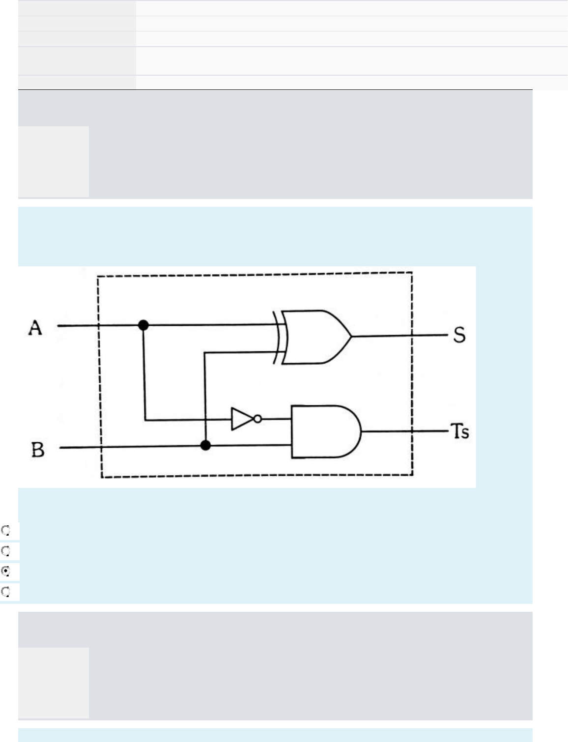 Iniciado em Wednesday, 15 Feb 2023, 16:12 Estado Finalizada Concluída em Wednesday, 15 Feb 2023, 17:08 Tempo empregado 56 minutos 19 segundos Avaliar 14,00 de um máximo de 20,00(70%) Parte superior do formulário Questão 1 Completo Atingiu 0,00 de 2,00 Marcar questão Texto da questão Analisando o circuito a seguir, determine a tabela verdade para as saídas S e TS e marque a opção que representa corretamente a função deste circuito. Escolha uma opção: a. Subtrator completo b. Somador completo c. Meio somador d. Decodificador Decimal/Binário Questão 2 Completo Atingiu 2,00 de 2,00 Marcar questão Texto da questão Marque a opção que representa corretamente o funcionamento do circuito da figura a seguir: Escolha uma opção: a. O circuito realiza a contagem crescente dos pulsos de clock, reiniciando no 16º pulso. b. O circuito realiza a contagem decrescente dos pulsos de clock, reiniciando a contagem após as saídas Q3, Q2, Q1 e Q0, atingir, respectivamente: 0, 0, 0, 0. c. A cada descida do pulso de clock a informação aplicada na entrada ES se deslocará da esquerda para a direita. d. Quando ocorre a descida do pulso de clock, a informação paralela recebida em Q3, Q2, Q1 e Q0 é convertida para uma informação série. Questão 3 Completo Atingiu 0,00 de 2,00 Marcar questão Texto da questão A figura a seguir, mostra um multiplex de 8 canais, sendo utilizado para realizar a função de um circuito combinacional. Neste circuito, a partir das entradas A, B e C, teremos na saída S o valor correspondente às informações inseridas nos canais do multiplex. Marque a opção que representa corretamente a expressão booleana executada por esse circuito: Escolha uma opção: a. b. c. d. Questão 4 Completo Atingiu 2,00 de 2,00 Marcar questão Texto da questão Marque a opção que representa corretamente a tabela-verdade do circuito a seguir, com 10 descidas de clock: Escolha uma opção: a. b. c. d. Questão 5 Completo Atingiu 2,00 de 2,00 Marcar questão Texto da questão Marque a opção que representa corretamente, um circuito capaz de realizar a soma entre 2 bits, receber um transporte de entrada (TE) e gerar um transporte de saída (TS). Escolha uma opção: a. b. c. d. Questão 6 Completo Atingiu 2,00 de 2,00 Marcar questão Texto da questão O circuito a seguir é um conversor digital / analógico. Sabendo que a tensão para nível lógico 1 aplicada às entradas é de 5V, marque a opção que representa a tensão de saída Vs quando a entrada for: 01012. Escolha uma opção: a. - 5,0 V b. - 10,0 V c. 2,0 V d. 6,0 V Questão 7 Completo Atingiu 2,00 de 2,00 Marcar questão Texto da questão Marque a opção que representa corretamente o funcionamento do circuito da figura a seguir: Escolha uma opção: a. b. c. d. Questão 8 Completo Atingiu 2,00 de 2,00 Marcar questão Texto da questão A tabela a seguir, mostra a situação de saída de um registrador de deslocamento de 6 bits, configurado para efetuar o deslocamento da esquerda para a direita. Marque a opção que representa corretamente a nova situação de saída após o pulso de clock aplicado ao sistema descer duas vezes. (Considere a entrada = 0) Escolha uma opção: a. b. c. d. Questão 9 Completo Atingiu 2,00 de 2,00 Marcar questão Texto da questão Considerando que inicialmente Q0, Q1, Q2 e Q3 foram zerados pela entrada clear, marque a opção que representa os valores de: Q0, Q1, Q2 e Q3, após a 4ª descida do pulso de clock: Escolha uma opção: a. Q0 = 0; Q1 = 0; Q2 = 0; Q3 = 1 b. Q0 = 0; Q1 = 0; Q2 = 1; Q3 = 0 c. Q0 = 0; Q1 = 1; Q2 = 0; Q3 = 0 d. Q0 = 1; Q1 = 1; Q2 = 0; Q3 = 1 Questão 10 Completo Atingiu 0,00 de 2,00 Marcar questão Texto da questão No circuito a seguir, se aplicarmos na entrada VE uma tensão de 6,4 V, teremos nas saídas A, B, C e D: Escolha uma opção: a. A = 1; B = 1; C = 1; D = 1 b. A = 0; B = 1; C = 0; D = 1 c. A = 0; B = 1; C = 1; D = 1 d. A = 0; B = 1; C = 1; D = 0 Parte inferior do formulário