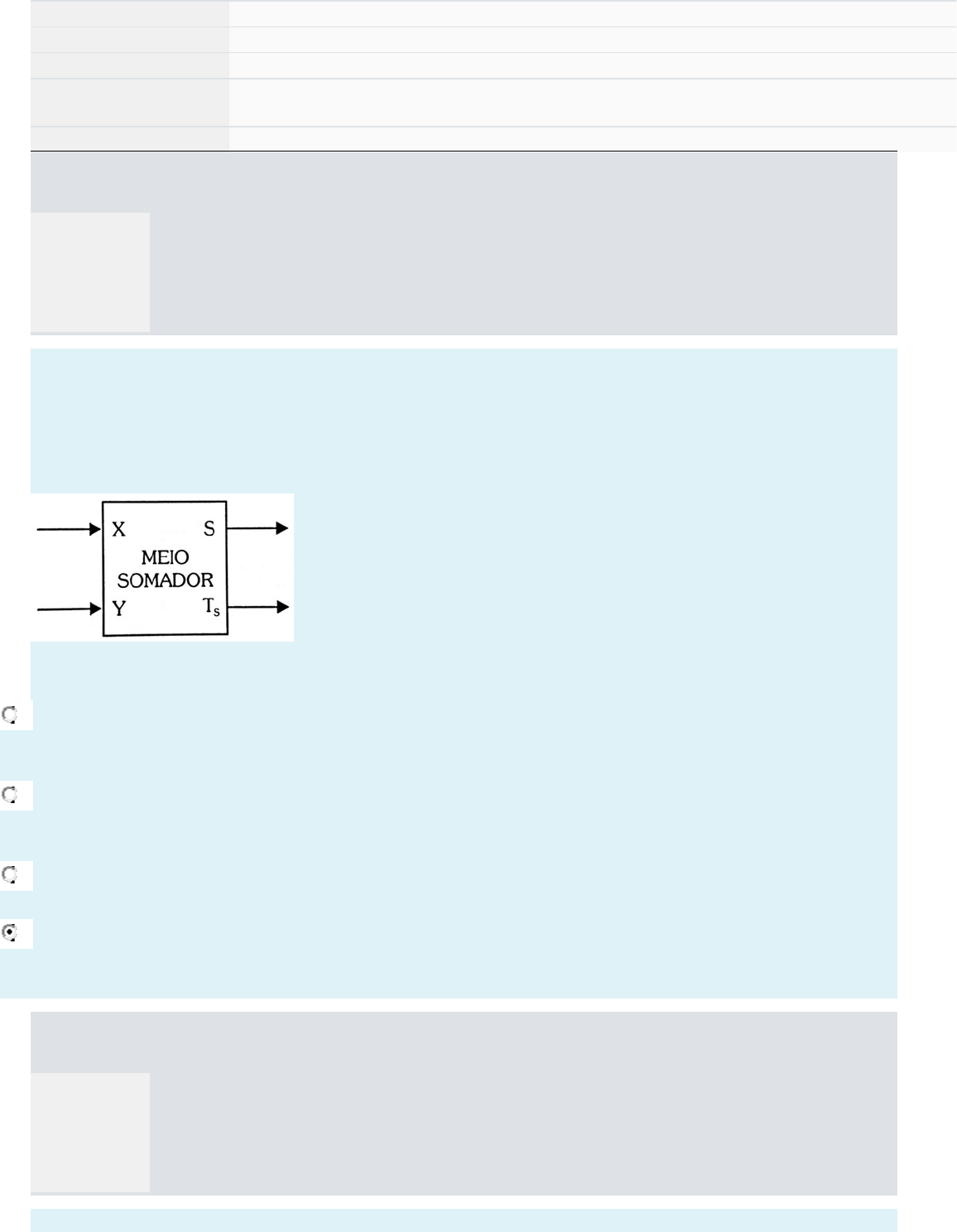 Iniciado em Thursday, 16 Feb 2023, 08:43 Estado Finalizada Concluída em Thursday, 16 Feb 2023, 10:43 Tempo empregado 2 horas Avaliar 42,00 de um máximo de 60,00(70%) Parte superior do formulário Questão 1 Completo Atingiu 3,00 de 3,00 Marcar questão Texto da questão O bloco a seguir representa um circuito aritmético cuja função é de meio somador. Para que a saída S represente a soma dos algarismos X e Y, e para que TS represente o transporte de saída da operação, marque a opção que representa corretamente as expressões lógicas executadas, por este circuito, para as saídas S e TS, respectivamente. Escolha uma opção: a. S=X⊙Y�=�⊙� e Ts = X + Y b. S = X + Y e Ts=X⊕Y��=�⊕� c. S=XY�=�� e Ts = X + Y d. S=X⊕Y�=�⊕� e Ts=XY��=�� Questão 2 Completo Atingiu 3,00 de 3,00 Marcar questão Texto da questão Considere um dispositivo que possui 3 entradas, nomeadas de A, B e C. O dispositivo possui uma saída S que é colocada em 1 quando nas entradas existirem mais valores 1 do que valores 0 e, caso contrário, é colocada em 0. Marque a alternativa que apresenta a expressão lógica para S: Escolha uma opção: a. A⋅(B+C)+B⋅C�⋅(�+�)+�⋅� b. A⋅B+C�⋅�+� c. A + B + C + D d. A⋅B¯¯¯¯+B⋅A¯¯¯¯+C�⋅�¯+�⋅�¯+� Questão 3 Completo Atingiu 3,00 de 3,00 Marcar questão Texto da questão Marque a opção que representa corretamente a tabela-verdade da expressão: Escolha uma opção: a. b. c. d. Questão 4 Completo Atingiu 3,00 de 3,00 Marcar questão Texto da questão O circuito a seguir é um conversor digital / analógico. Sabendo que a tensão para nível lógico 1 aplicada às entradas é de 5V, marque a opção que representa a tensão de saída Vs quando a entrada for: 01102. Escolha uma opção: a. 15,0 v b. -12,0 v c. -6,0 v d. -30,0 v Questão 5 Completo Atingiu 0,00 de 3,00 Marcar questão Texto da questão Marque a opção que representa corretamente a tabela-verdade do circuito a seguir, com 10 descidas de clock: Escolha uma opção: a. b. c. d. Questão 6 Completo Atingiu 0,00 de 3,00 Marcar questão Texto da questão Marque a opção que representa corretamente a expressão de um circuito combinacional capaz de funcionar como uma chave seletora digital com duas entradas e uma saída. Este circuito, em função do nível lógico aplicado a uma entrada de seleção, deve comutar na saída os sinais aplicados às entradas digitais, conforme diagrama a seguir: Convenções: Variável de seleção A: A = 0 → I0 é comutado à saída S. A = 1 → I1 é comutado à saída S. Escolha uma opção: a. S=A⊕I0+A⊙I1�=�⊕�0+�⊙�1 b. S=A(I0 ⊕I1)�=�(�0 ⊕�1) c. S=A¯¯¯¯I0+AI1�=�¯�0+��1 d. S=A(I0+I1)�=�(�0+�1) Questão 7 Completo Atingiu 0,00 de 3,00 Marcar questão Texto da questão Marque a opção que representa corretamente a expressão capaz de gerar a tabela-verdade a seguir: Escolha uma opção: a. S=A B̄ C+Ā B C+Ā B C̄ b. S=Ā .(B̄ C+B̄ )+A C̄ c. S=Ā B̄ C̄+A B̄ C̄+Ā B C d. S=Ā B+C̄ Questão 8 Completo Atingiu 3,00 de 3,00 Marcar questão Texto da questão Marque a opção que representa corretamente a conversão do número 11100100102 para o sistema decimal. Escolha uma opção: a. 91410 b. 42810 c. 3210 d. 86910 Questão 9 Completo Atingiu 3,00 de 3,00 Marcar questão Texto da questão Com relação à funcionalidade do circuito com um flip-flop JK abaixo, podemos afirmar que: Escolha uma opção: a. A saída C tem o seu valor invertido a cada transição de subida da entrada B, independentemente do nível lógico na entrada A. b. Após a transição de subida da entrada B, a saída C passa a ter nível lógico presente na entrada A no instante da transição. c. A saída C tem o seu valor invertido a cada transição de subida da entrada B, desde que a entrada A esteja em nível lógico alto. Caso contrário, a saída permanece inalterada. d. A saída C será igual à entrada A, desde que a entrada B esteja em nível lógico alto. Caso contrário, a saída permanece inalterada. Questão 10 Completo Atingiu 3,00 de 3,00 Marcar questão Texto da questão Marque a opção que representa corretamente o tipo de porta lógica o qual o circuito representado na figura pode ser simplificado. Escolha uma opção: a. Porta NÃO E b. Porta NÃO OU c. Porta OU EXCLUSIVO d. Porta E Questão 11 Completo Atingiu 3,00 de 3,00 Marcar questão Texto da questão 1) Um multiplexador digital proporciona uma maneira de selecionar uma das entradas para ser ligada a uma única saída. Sobre a implementação de tais dispositivos, considere as seguintes afirmativas: 1- Um multiplexador com 16 entradas necessita de 16 bits de seleção. 2- Um multiplexador pode ser implementado em dois estágios: o primeiro consiste em portas inversores e portas AND entre os bits de seleção e o segundo em uma porta OR entre as saídas do primeiro estágio. 3- Um multiplexador pode ser implementado utilizando-se um conjunto de flip-flops conectados entre se através de portas AND, utilizando como sincronismo os bits de seleção. 4- Um multiplexador digital pode ser utilizado para gerar uma função lógica arbitrária das variáveis selecionadoras. Assinale a alternativa correta: Escolha uma opção: a. Somente as afirmativas 2 e 3 são verdadeiras. b. Todas as afirmativas são verdadeiras. c. Somente as afirmativas 2 e 4 são verdadeiras. d. Somente as afirmativas 1 e 4 são verdadeiras. Questão 12 Completo Atingiu 3,00 de 3,00 Marcar questão Texto da questão Marque a opção que representa corretamente a função lógica executada pelo circuito a seguir: Escolha uma opção: a. S=(A+B+C) .[( A.B)+C] b. S=A.B+C+A⊕B⊕C c. S=A.B.C+(A+B).C d. S=A.B+Ā.B̄.C Questão 13 Completo Atingiu 3,00 de 3,00 Marcar questão Texto da questão O circuito da figura a seguir é um multiplex que utilizada como gerador de produtos canônicos uma matriz de duplo encadeamento. S