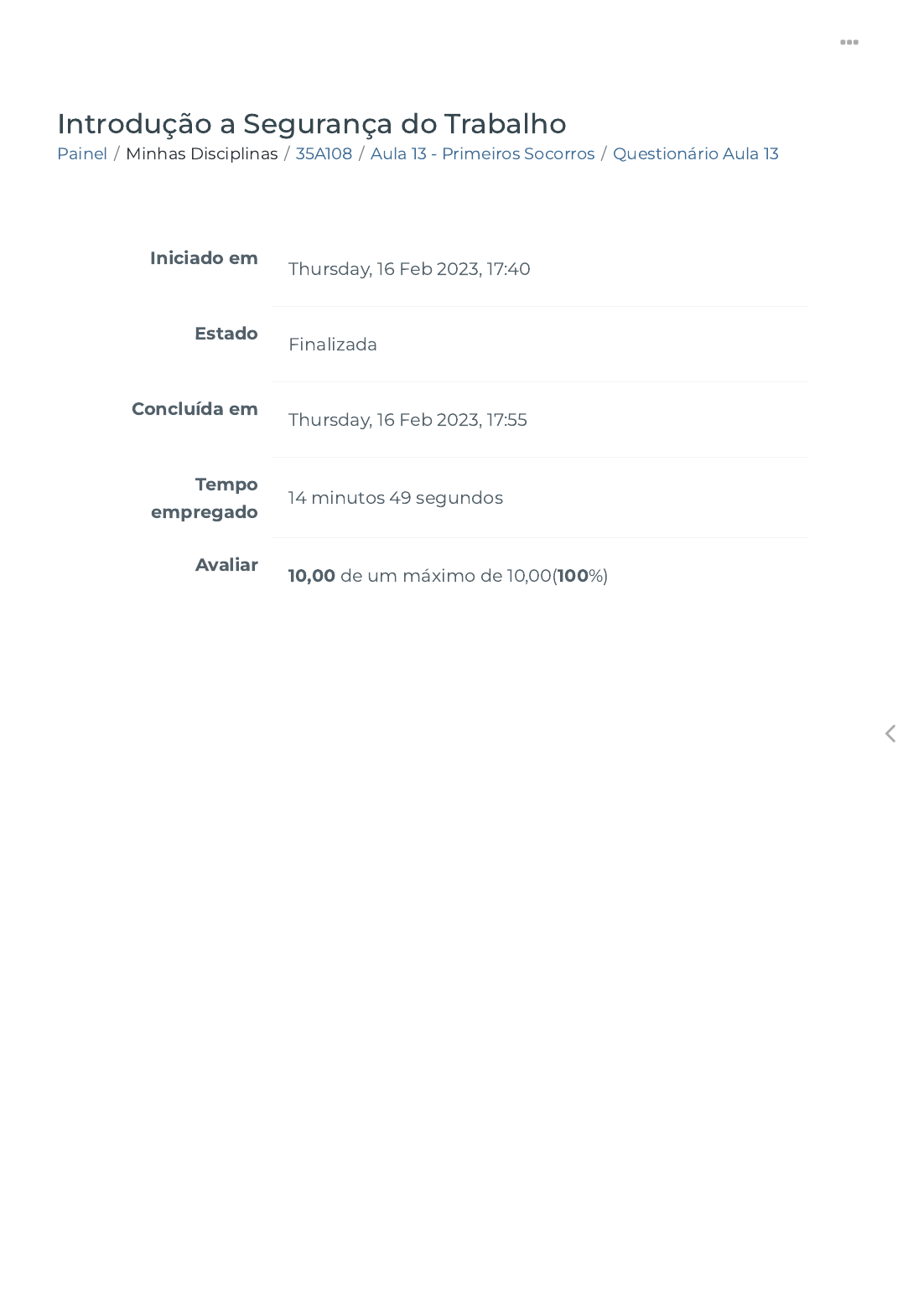 16/02/2023, 17:06 Questionário Aula 13 https://ava.politecnicabr.com.br/mod/quiz/review.php?attempt=4393074 1/8 Painel / Minhas Disciplinas / 35A108 / Aula 13 - Primeiros Socorros / Questionário Aula 13 Introdução a Segurança do Trabalho Iniciado em Thursday, 16 Feb 2023, 17:40 Estado Finalizada Concluída em Thursday, 16 Feb 2023, 17:55 Tempo empregado 14 minutos 49 segundos Avaliar 10,00 de um máximo de 10,00(100%) https://ava.politecnicabr.com.br/my/ https://ava.politecnicabr.com.br/course/view.php?id=1030 https://ava.politecnicabr.com.br/course/view.php?id=1030#section-17 https://ava.politecnicabr.com.br/mod/quiz/view.php?id=25414 https://ava.politecnicabr.com.br/ 16/02/2023, 17:06 Questionário Aula 13 https://ava.politecnicabr.com.br/mod/quiz/review.php?attempt=4393074 2/8 Questão 1 Correto Atingiu 1,50 de 1,50 A conduta para o atendimento em casos de convulsão é parecida com a de vítimas de epilepsia, por isso devemos, EXCETO: Escolha uma opção: a. Protegê-la para que não se machuque e aguardar até o �nal da crise. b. Procurar lateralizar a vítima e conversar com ela para acalmá- la. c. Não tentar impedir a contração dos membros, para não aumentar o desconforto físico da vítima. d. Despir a vítima. https://ava.politecnicabr.com.br/ 16/02/2023, 17:06 Questionário Aula 13 https://ava.politecnicabr.com.br/mod/quiz/review.php?attempt=4393074 3/8 Questão 2 Correto Atingiu 1,50 de 1,50 Objetos aquecidos, chamas, vapores quentes, entre outros, são agentes causadores de queimaduras, as quais, segundo sua gravidade, podem ser de primeiro, segundo ou terceiro graus. Assinale a alternativa que apresenta uma alternativa correta com relação às queimaduras: Escolha uma opção: a. Queimadura de segundo grau é aquela em que os tecidos queimam em profundidade, podendo alcançar até os ossos. b. Queimadura de terceiro grau é aquela que atinge a terceira camada da pele (hipoderme), destruindo de forma acentuada os tecidos e podendo atingir até o osso, c. Queimadura de terceiro grau é aquela que apresenta somente vermelhidão super�cial. d. Queimadura de primeiro grau é aquela em que os tecidos queimam em profundidade, podendo alcançar até os ossos. https://ava.politecnicabr.com.br/ 16/02/2023, 17:06 Questionário Aula 13 https://ava.politecnicabr.com.br/mod/quiz/review.php?attempt=4393074 4/8 Questão 3 Correto Atingiu 1,00 de 1,00 Considere os seguintes sintomas: I. Pupila dilatada e sem reação. II. Pulsação forte e lenta. III. Suor excessivo. São sintomas de vítimas de hemorragia interna: Escolha uma opção: a. Somente I, III. b. Somente I, II. c. Somente II, III. d. Todas as a�rmações. https://ava.politecnicabr.com.br/ 16/02/2023, 17:06 Questionário Aula 13 https://ava.politecnicabr.com.br/mod/quiz/review.php?attempt=4393074 5/8 Questão 4 Correto Atingiu 1,50 de 1,50 Diante de vítimas com queimaduras procede-se da seguinte forma, EXCETO: Escolha uma opção: a. Utilizar artifícios caseiros e outros de origem popular para tratamento de queimaduras, como creme dental, borra de café, manteiga, vaselina etc. b. Dar atenção preferencial a vítimas com queimaduras na face ou com mais de 20% da superfície total queimada, pois há risco iminente de parada respiratória, podendo progredir para cardiorrespiratória, portanto deve haver remoção rápida para o hospital. c. Não abraçar ou deixar correr uma vítima em chamas. d. Não retirar as peles e os tecidos colados ou pendurados ao corpo da vítima para melhor cicatrização. https://ava.politecnicabr.com.br/ 16/02/2023, 17:06 Questionário Aula 13 https://ava.politecnicabr.com.br/mod/quiz/review.php?attempt=4393074 6/8 Questão 5 Correto Atingiu 1,50 de 1,50 Qual é a principal via de penetração no organismo no caso de intoxicação pro�ssional de uma substância? Escolha uma opção: Questão 6 Correto Atingiu 1,50 de 1,50 As lesões por queimaduras podem ser de: Escolha uma opção: a. Digestiva b. Respiratória c. Cutânea d. Parenteral a. 1° e 2° graus. b. 1°, 2° e 3° graus. c. 2° e 3° graus. d. 1°, 2°, 3° e 4° graus. https://ava.politecnicabr.com.br/ 16/02/2023, 17:06 Questionário Aula 13 https://ava.politecnicabr.com.br/mod/quiz/review.php?attempt=4393074 7/8 Questão 7 Correto Atingiu 1,50 de 1,50 Nos casos de as�xia, principalmente em meio líquido (afogamento), a falta do O2 provoca a liberação de adrenalina na corrente sanguínea, causando um sensível aumento da frequência cardíaca. A adrenalina provoca ainda uma constrição dos vasos sanguíneos, que podem se tornar frios e de cor azulada, especialmente nas extremidades. Que nome se dá a essa constrição? Escolha uma opção: a. Arritmia b. Adrenalina c. Esclerose d. Cianose e. Epiderme Entre em Contato https://www.politecnicabr.com.br 0800 084 2627 0800 084 2627 Links Úteis Dicas da nossa Diretora Acadêmica Planner de Estudos Declaração de Matrícula Orientações do AVA Abertura de Ticket Fale com o Tutor Cronograma de Estudos Manual de Estágio Manual de Competência https://www.politecnicabr.com.br/ https://soundcloud.com/user-501638417/sets/escola-politecnica-brasileira https://storage.googleapis.com/sirius-pubstore/semestre_plannerdeestudo%20poli.pdf https://storage.googleapis.com/sirius-pubstore/declaracao_matricula.pdf https://storage.googleapis.com/sirius-pubstore/orientacoes_ava.pdf https://storage.googleapis.com/sirius-pubstore/abertura_ticket.pdf https://storage.googleapis.com/sirius-pubstore/fale_com_tutor.pdf https://storage.googleapis.com/sirius-pubstore/cronograma_estudos.pdf https://storage.googleapis.com/sirius-pubstore/manual_estagio.pdf https://storage.googleapis.com/sirius-pubstore/manual_competencia.pdf https://ava.politecnicabr.com.br/ 16/02/2023, 17:06 Questionário Aula 13 https://ava.politecnicabr.com.br/mod/quiz/review.php?attempt=4393074 8/8 © 2022 - Escola Politécnica Brasileira Siga-nos nas redes sociais https://ava.politecnicabr.com.br/mod/quiz/0 https://www.faceboo