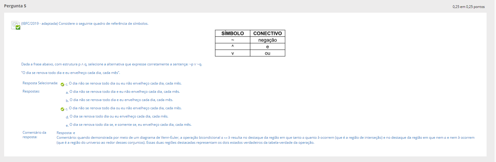 Considere seguinte quadro de referência de SÍMBOLO CONECTIVO negação. Dada a frase abaixo, com estrutura selecione a alternativa que expresse corretamente a sentença: "O dia se renova todo dia e eu envelheço cada dia, cada mês". a. o dia não se renova todo dia e eu não envelheço cada dia, cada mês. b. dia não se renova todo dia e eu envelheço cada dia, cada mês. c. dia não se renova todo dia ou eu não envelheço cada dia, cada mês. d. dia se renova todo dia ou eu envelheço cada dia, cada mês. e. dia se renova todo dia se, e somente se, eu envelheço cada dia, cada mês.
