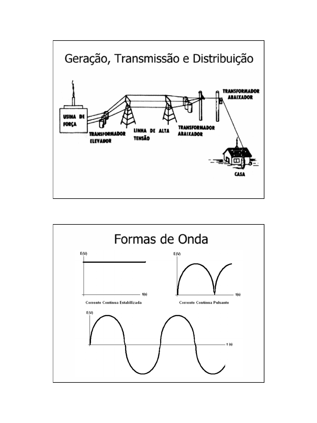 1 Geração, Transmissão e Distribuição Formas de Onda 2 Formas de Onda Periódicas Gerador Elementar 3 Gerador Elementar Gerador Elementar 4 Gerador Elementar Gerador Elementar 5 Tensão Alternada Frequência: � = � � [ Hz ou Ciclos/s ] Exercícios 1) Calcular quanto tempo dura um semiciclo na frequência 50Hz. 2) Quantos ciclos ocorrem em um segundo na frequência 60Hz. 3) Quanto tempo uma corrente alternada de 60hz gasta para varrer o trecho compreendido entre 0 e 30°. 4) Quantos ciclos ocorrem em uma hora na frequência de 60Hz. 6 Tensão Alternada Valor Máximo ou Valor de Pico Tensão Alternada 7 Valor de Pico a Pico Tensão Alternada Valor Instantâneo Tensão Alternada 8 Valor Instantâneo Tensão Alternada e = B ℓ V sen α sen α = 1 ---- Emáx = B ℓ V e = Emáx sen α Como: α = ω t e ω = 2π f e = Emáx sen 2π f t Valor Médio Tensão Alternada “é a média dos valores instantâneos de um semiciclo” Considerando uma forma de onda senoidal: Eméd = � Emáx � ou Eméd = � EP � ��é� = 1 � � � � �� � � 9 Valor Eficaz ou RMS (Root Means Square) = (valor quadrático médio) Tensão Alternada “é a altura de um retângulo de base e área igual a um semiciclo” Considerando uma forma de onda senoidal: EEficaz = Emáx � ou Erms = EP � ���� = 1 � � ��(�) ��� � � Fator de Forma de Onda k Tensão Alternada k = ���� ��é� = �� � � �� � = �� � � � �� = � � � k =1,11 10 Exercícios 5) Para uma tensão alternada senoidal, 150V de valor eficaz. Determinar: a) O valor de Pico, b) O valor de Pico a Pico; c) O valor Médio; d) O fator de forma de onda; e) O valor instantâneo para α = 45º 6) Uma tensão alternada possui valor médio igual a 25V e valor eficaz igual a 32V. Qual seu fator de forma de onda? Exercícios 7) Para uma tensão alternada senoidal, 63V de valor médio e frequência 60Hz. Determinar: a) O valor de Máximo, b) O valor de Pico a Pico; c) O valor Eficaz; d) O valor instantâneo para t = 10ms 8) Qual o valor máximo de uma tensão senoidal que assume em t=14ms o valor -35V, sendo sua frequência 60Hz? 11 Exercícios 9) Considerando a forma de onda da corrente, mostrada no gráfico. Determinar: a) O período e a frequência; b) O valor de Pico; c) O valor de Pico a Pico; d) O valor Eficaz; e) O valor Médio; f) A expressão matemática; Exercícios 10) Calcular em que instantes de tempo (t1 e t2) a corrente alternada de 60Hz, cujo valor máximo é 7A, atinge o valor de 5,5A. 12 Exercícios 11) O valor de pico de uma tensão senoidal é 5V e a sua frequência é 1kHz. Determinar: a) O valor de Eficaz; b) O período; c) A expressão matemática. 12) Supondo que a tensão do exercício 11 é aplicada a um resistor de 10Ω. Qual a potência dissipada? Exercícios 13) Qual o valor médio de um semiciclo da seguinte forma de onda? 13 Fasores Representação: Senoidal x Fasorial Fasores O raio da circunferência é igual ao valor máximo 14 Exercícios 14) Representar na forma fasorial a 30º adiantada, uma tensão alternada senoidal cujo valor medido é 100V. Fasores Ey = E sen α Ex = E cos α 15 Defasamento Elétrico Defasamento Elétrico 16 Defasamento Elétrico Exercícios 15) Dada a representação senoidal, faça a representação fasorial. 17 Exercícios 16) Dada a representação fasorial, faça a representação senoidal. Representação Senoidal b = Vm sen α 18 Representação Senoidal Ângulo de fase inicial “ “ Representação Senoidal 19 Representação Senoidal Representação Senoidal 20 Representação Senoidal Exercícios 18) Dadas as tensões são: V1=15 sen (ωt + � � ) e V2=10 sen (ωt - � � ). Pede-se: a) Obter: V1+V2; b) Obter: V1 - V2. 17) As expressões matemáticas de duas tensões são: V1=10 sen ωt e V2=10 sen (ωt+ � � ). Pede-se: a) Representar as tensões no diagrama fasorial; b) Desenhar as duas formas de onda; c) Obter a soma V1+V2. 21 Exercícios 20) Dada a forma de onda. Pede-se a sua expressão em função do tempo. 19) As expressões de duas tensões são: V1=20 sen (ωt+ � � ) e V2=40 sen (ωt+ � � ). Pede-se: a) V3=V1+V2; b) Desenhar as formas de onda. Exercícios b) 21) Dadas as formas de onda. Pede-se as suas expressões em função do tempo. a) 22 Soma de Grandezas na Forma Fasorial Regra do Paralelogramo: ET = �1 � + �2 � + 2 �1 �2 cos� tanα = �� ���� ����� ���� Exercícios 22) Determinar a resultante entre duas tensões. a) b) 23 Tensão x Corrente Tensão e corrente estão em fase. Circuito Puramente Resistivo “Tensão e corrente estão em fase” 24 Indutância - “L” “Capacidade de uma bobina criar um fluxo com determinada corrente que a percorre” Unidade: Henry [H] A Indutância depende: • Nº de espiras (+esp.= +L); • Núcleo; • Formato da bobina. Ideal Real Circuito Puramente Indutivo “A Corrente está atrasada de 90º em relação a Tensão”. 25 Circuito Puramente Indutivo Reatância Indutiva – “ XL ” “Oposição oferecida pela bobina à circulação de corrente alternada”. Potência – “ P ” P=E I cosφ como: φ =90º P=E I cos90 P=0 Exercícios 23) Calcular a corrente do circuito: 24) Calcular a indutância da bobina do circuito: 26 Exercícios 25) Calcular a corrente absorvida por um indutor de 300mH, ligado a uma fonte de 250V 60Hz: 26) Calcular a indutância da bobina que absorve uma corrente de 2,5A, quando ligada a uma fonte de 20V 60Hz: 27) Você dispõe de uma fonte de 10V, cuja frequência pode ser variada. Nessa fonte é ligada uma bobina de 500mH. Calcule os valores de corrente na bobina, quando a frequência for: a) 250Hz; b) 60Hz; c) 20Hz e d) 0Hz (tensão continua). Capacitância – “ C “ “Capacidade de armazenar cargas elétricas” Unidade: Farad [F] A Capacitância depende: • Distância entre as placa; (+dist.= +C) • Área da placa; • Material dielétrico. Ideal Real 