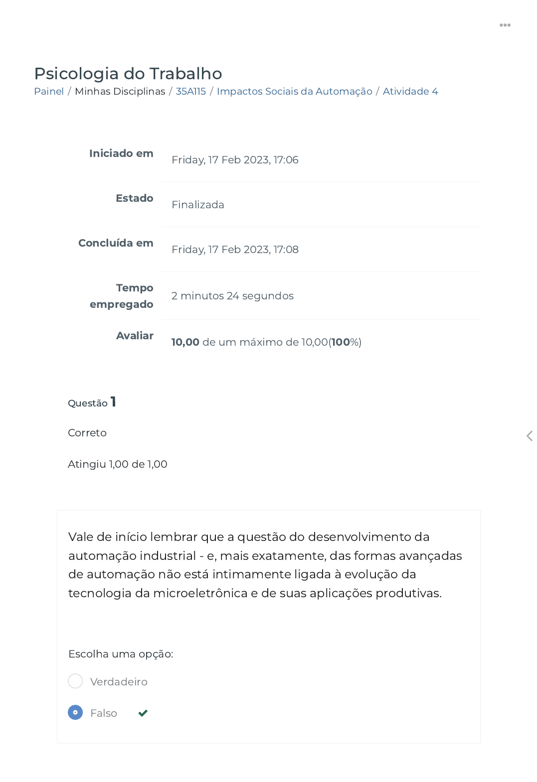 17/02/2023, 16:08 Atividade 4 https://ava.politecnicabr.com.br/mod/quiz/review.php?attempt=4398588 1/7 Painel / Minhas Disciplinas / 35A115 / Impactos Sociais da Automação / Atividade 4 Psicologia do Trabalho Iniciado em Friday, 17 Feb 2023, 17:06 Estado Finalizada Concluída em Friday, 17 Feb 2023, 17:08 Tempo empregado 2 minutos 24 segundos Avaliar 10,00 de um máximo de 10,00(100%) Questão 1 Correto Atingiu 1,00 de 1,00 Vale de início lembrar que a questão do desenvolvimento da automação industrial - e, mais exatamente, das formas avançadas de automação não está intimamente ligada à evolução da tecnologia da microeletrônica e de suas aplicações produtivas. Escolha uma opção: Verdadeiro Falso https://ava.politecnicabr.com.br/my/ https://ava.politecnicabr.com.br/course/view.php?id=1037 https://ava.politecnicabr.com.br/course/view.php?id=1037#section-5 https://ava.politecnicabr.com.br/mod/quiz/view.php?id=25554 https://ava.politecnicabr.com.br/ 17/02/2023, 16:08 Atividade 4 https://ava.politecnicabr.com.br/mod/quiz/review.php?attempt=4398588 2/7 Questão 2 Correto Atingiu 1,50 de 1,50 O tema automação/emprego remete a um velho debate: os efeitos do progresso técnico sobre o nível de emprego; a criação e destruição de empregos em decorrência da utilização (e do aperfeiçoamento) de máquinas na produção. Escolha uma opção: Questão 3 Correto Atingiu 1,00 de 1,00 A palavra Automação, vem do latim Automatus, que signi�ca mover-se por si, é um sistema automático de controle pelo qual os mecanismos veri�cam seu próprio funcionamento, efetuando medições e introduzindo correções, sem a necessidade da interferência do homem. Escolha uma opção: Verdadeiro Falso Verdadeiro Falso https://ava.politecnicabr.com.br/ 17/02/2023, 16:08 Atividade 4 https://ava.politecnicabr.com.br/mod/quiz/review.php?attempt=4398588 3/7 Questão 4 Correto Atingiu 1,00 de 1,00 O advento da microeletrônica oferece uma nova dimensão às mudanças tecnológicas e à automação. Existem, no mínimo, cinco fatores que fazem da microeletrônica a tecnologia-chave da nossa época. Escolha uma opção: Questão 5 Correto Atingiu 1,50 de 1,50 Em síntese, vemos que, dada a diversidade e a complexidade dos fatores envolvidos, se torna extremamente difícil avaliar e prognosticar o impacto real da automação sobre o nível geral do emprego. Escolha uma opção: Verdadeiro Falso Verdadeiro Falso https://ava.politecnicabr.com.br/ 17/02/2023, 16:08 Atividade 4 https://ava.politecnicabr.com.br/mod/quiz/review.php?attempt=4398588 4/7 Questão 6 Correto Atingiu 1,00 de 1,00 "O resultado comum de todos os estudos cientí�cos é o seguinte: é impossível formular prognósticos macroeconômicos quantitativos conclusivos em relação à in�uência da microeletrônica sobre a oferta de oportunidades de trabalho disponíveis" - (Sleigh et alii, 1983, p.92). Escolha uma opção: Verdadeiro Falso https://ava.politecnicabr.com.br/ 17/02/2023, 16:08 Atividade 4 https://ava.politecnicabr.com.br/mod/quiz/review.php?attempt=4398588 5/7 Questão 7 Correto Atingiu 1,50 de 1,50 Segundo a tese "otimista" que encontramos nas chamadas teorias da compensação do emprego, os efeitos positivos do incremento da produtividade sobre a economia devem, a médio e a longo prazo, mais do que compensar a supressão imediata de postos de trabalho no interior da unidade ou mesmo do ramo de produção atingido pela automação. Escolha uma opção: Verdadeiro Falso https://ava.politecnicabr.com.br/ 17/02/2023, 16:08 Atividade 4 https://ava.politecnicabr.com.br/mod/quiz/review.php?attempt=4398588 6/7 Questão 8 Correto Atingiu 1,50 de 1,50 Automação é a utilização de técnicas computadorizadas ou mecânicas para diminuição do uso de mão de obra em qualquer processo, incentivando o uso de robôs nas linhas de produção, a automação visa diminuir os custos e aumentar a velocidade da produção. Escolha uma opção: Verdadeiro Falso Entre em Contato https://www.politecnicabr.com.br 0800 084 2627 0800 084 2627 Links Úteis Dicas da nossa Diretora Acadêmica Planner de Estudos Declaração de Matrícula Orientações do AVA Abertura de Ticket Fale com o Tutor Cronograma de Estudos Manual de Estágio Manual de Competência Siga-nos nas redes sociais https://www.politecnicabr.com.br/ https://soundcloud.com/user-501638417/sets/escola-politecnica-brasileira https://storage.googleapis.com/sirius-pubstore/semestre_plannerdeestudo%20poli.pdf https://storage.googleapis.com/sirius-pubstore/declaracao_matricula.pdf https://storage.googleapis.com/sirius-pubstore/orientacoes_ava.pdf https://storage.googleapis.com/sirius-pubstore/abertura_ticket.pdf https://storage.googleapis.com/sirius-pubstore/fale_com_tutor.pdf https://storage.googleapis.com/sirius-pubstore/cronograma_estudos.pdf https://storage.googleapis.com/sirius-pubstore/manual_estagio.pdf https://storage.googleapis.com/sirius-pubstore/manual_competencia.pdf https://ava.politecnicabr.com.br/ 17/02/2023, 16:08 Atividade 4 https://ava.politecnicabr.com.br/mod/quiz/review.php?attempt=4398588 7/7 © 2022 - Escola Politécnica Brasileira https://ava.politecnicabr.com.br/mod/quiz/0 https://www.facebook.com/politecnicabr https://www.instagram.com/politecnicabr_oficial https://ava.politecnicabr.com.br/
