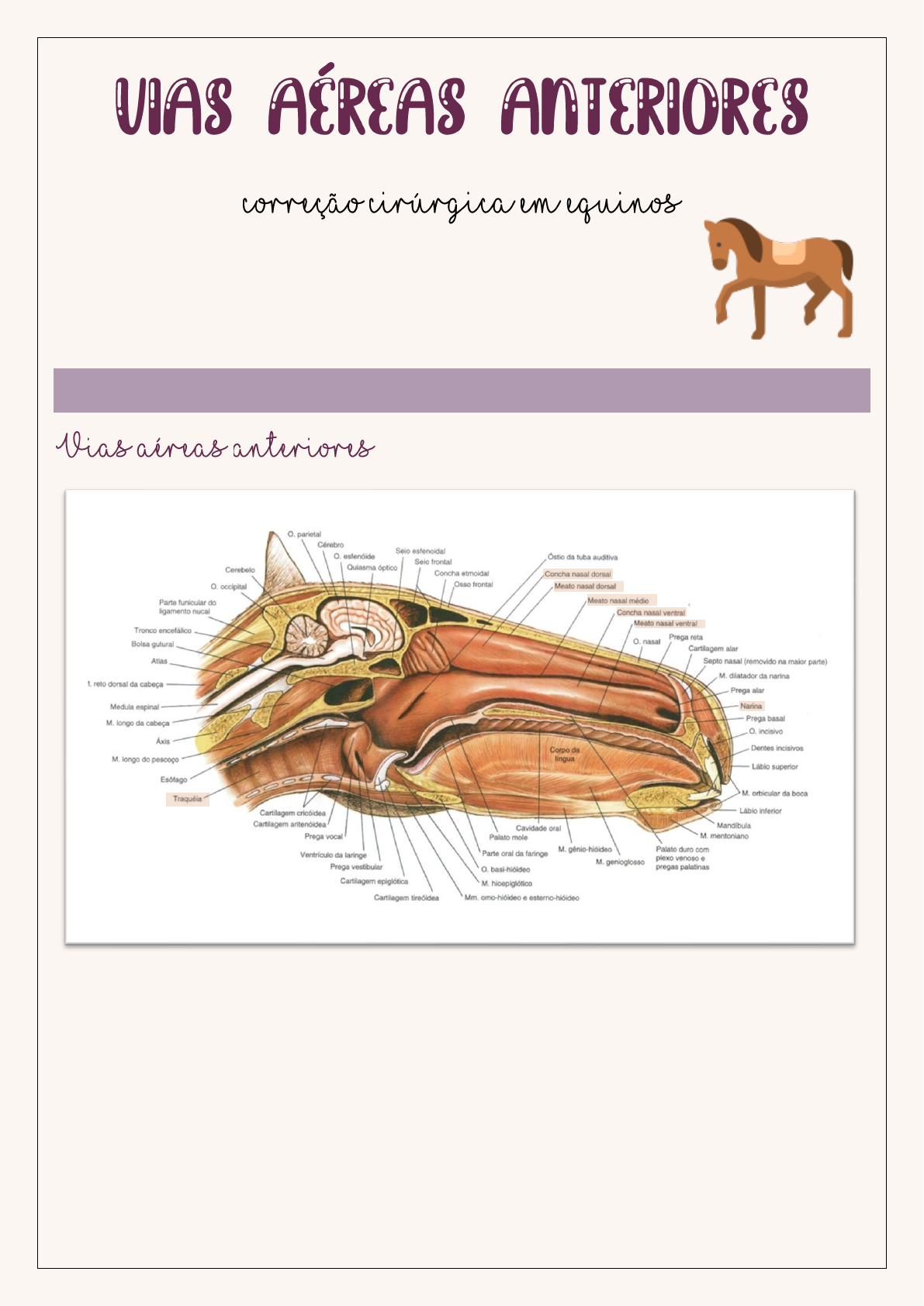 @veterinariando_ Anatomia 1. Narinas 2. Meatos (espaços entre as conchas nasais) → Conchas nasais → Seios nasais (espaços dentro das conchas) 3. Faringe 4. Laringe 5. Traqueia Bolsa gutural – equilíbrio da pressão (relação entre boca e ouvido) → realiza equilíbrio entre a pressão interna e do ambiente, fica localizada da região da faringe Principais afecções → É caracterizada como um processo inflamatório infeccioso com acúmulo de exsudato nos seios paranasais, essa condição pode ocasionar deformidade dos ossos da face e das conchas nasais, ocorrendo obstrução • Infecções de trato respiratório inferior, podendo ser secundária a lesões dentárias, fraturas ósseas e traumas diretos • Secreção nasal unilateral crônica e recidivante • Febre • Perda de apetite • Perda de peso • Secreção mucopurulenta, mucoide ou purulenta • Percussão (identificação do local da secreção) → som maciço • Sempre avaliar a cavidade oral do animal • Verificar assimetria facial (comunicação do seio com a cavidade nasal pode estar obstruída) • Histórico + exame físico • Raio-X (aumento de densidade em seios paranasais e raiz dentária) • Endoscopia (não é capaz de avaliar o seio, apenas a origem da secreção) ANTIBIÓTICO Cultura e antibiograma → seleção do antibiótico Geralmente o antibiótico de escolha é Amicacina DRENAGEM Trepanação → furo no seio paranasal para saída do conteúdo obstrutivo LAVAGEM Aconselhável a colocação de sonda após a trepanação para realizar a lavagem do seio com água bidestilada ou soro + associação com mucolítico se o conteúdo estiver muito denso Ao final da lavagem pode ser colocado antisséptico para evitar a contaminação secundária EXTRAÇÃO Retirar a causa base Retirada dos fragmentos dentários via oral Abertura do seio e colocação do dente para a cavidade oral → É caracterizada como neoformação bem encapsulada, benigna de caráter progressivo e destrutivo, com origem na mucosa etmoide • Hemorragia na submucosa, descolando a mucosa e formando uma cápsula repleta de sangue que ocorre no osso etmoidal • Secreção nasal mucopurulenta unilateral • Presença de filetes de sangue • Dificuldade respiratória com evolução crônica • Epistaxe unilateral discreta e espontânea • Redução do fluxo de ar (perceptível ao exame físico, colocando a mão na narina do animal) • Odor fétido da secreção • Histórico + exame físico • Raio-X (mensuração do tamanho da massa) • Endoscopia (exame padrão ouro) → massa esverdeada na região etmoidal obstruindo a passagem CONSERVATIVO Infusão de formalina em massa pequenas e médias Prós → procedimento pouco invasivo e com bons resultados Contras → o extravasamento de formal na cavidade nasal leva a uma irritação da mucosa e não um procedimento eficaz para massas grandes, pois a infusão em massas grandes pode levar a uma obstrução total devido ao crescimento da massa com a adição do conteúdo CIRÚRGICO Trepanação Rebater osso frontal (incisão de pele e periósteo) + incisão óssea em 3 lados + realização de pequenos furos no osso para facilitar a quebra (fratura óssea controlada) e auxiliar na cicatrização devido ao maior aporte sanguíneo ▪ COMPLICAÇÕES → hemorragia em transoperatório levando a um prognóstico reservado, assim como um risco de recorrência (importante tratar a causa base) ▪ Controlar a hemorragia por meio da compressão com gaze Traqueostomia em equinos • Indicada em caso de obstrução severa de vias aéreas anteriores • Pode ser feita de forma preventiva em casos de possíveis obstruções • Pode ser feita em casos de flebite e acidentes ofídicos onde pode ocorrer fechamento de glote e impossibilidade de passagem de ar • Traqueostomia temporária → mais utilizada, feita somente com sedação e anestesia local e geralmente com o cavalo em pé • Traqueostomia permanente → feita com anestesia geral 1. Incisão na linha média ventral → junção dos terços proximal e médio da traqueia 2. Incisão para afastar os músculos esternotireóideo que estão pareados 3. Realizar incisão circular em 2 anéis fibrocartilaginosos, mantendo a cartilagem integra 4. Incisão do tubo no lúmen traqueal 1. O animal deve estar sedado e em decúbito dorsal 2. Incisão na linha média ventral 3. São retirados 4 anéis traqueais 4. Há a inserção do tubo no lúmen 5. A sutura da mucosa é feita no bordo da pele o LIMA, J.M et al. Traqueostomia permanente em equino: relato de caso. Periódicos Brasileiros em Medicina Veterinária e Zootecnia. o KÖNIG, Horst Erich; LIEBICH, Hans-Georg. Anatomia dos Animais Domésticos-: Texto e Atlas Colorido. Artmed Editora, 2021.