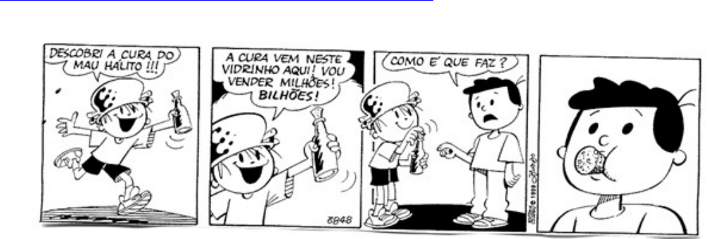 INTERPRETAÇÃO DE TEXTO - GÊNERO: TIRINHA (6º) Leia o texto e depois responda as questões abaixo: 1) Qual o gênero e a tipologia do texto? a)Tirinha e narrativo. b) Tirinha e descritivo. c) Fábula e narrativo. d) Conto e descritivo. 2) O humor do texto acontece porque a) Maluquinho descobriu um novo remédio. b) a doença do mau hálito é muito incômoda. c) o remédio é a rolha do vidro e não o seu conteúdo. d) o remédio pode ser vendido para milhões de pessoas. 3) Os três sinais de exclamação que aparecem no primeiro quadrinho foram usados para ressaltar a) a descoberta de algo sem importância. b) a euforia do personagem com a descoberta. c) seu desejo de vender o remédio para o amigo. d) seu entusiasmo ao explicar como se tomava o remédio. 4) A expressão do rosto do amigo de Maluquinho no último quadrinho revela: a) surpresa. b) desânimo. c) raiva. d) decepção. Leia o texto e responda as próximas questões: 5) Qual o gênero e a tipologia do texto? a) História em quadrinhos e narrativo b) Tirinha e descritivo. c) Fábula e narrativo. d) Conto e descritivo. 6) O texto ao lado é um exemplo de a) linguagem mista. b) linguagem não verbal, apenas. c) linguagem verbal, apenas. 7) A frase “É duro envelhecer”indica que Garfield não estava conseguindo a) chutar. b) enxergar. c) empurrar. d) levantar. 8) Na história, Garfield traz a ideia de que os a) óculos são importantes para se proteger do sol. b) óculos são usados para parecer mais velho. c) óculos são indicados para a idade avançada. d)óculos são acessórios usados por pessoas intelectuais. 9) No quinto quadrinho, o que a onomatopéia “boot” quer dizer? a) Uma batida. b) Um soco. c) Um pontapé. d) Um suspiro. Gabarito 1 - a 2 -c 3 - b 4 - a 5 - a 6 - a 7 - b 8 - c 9 - c