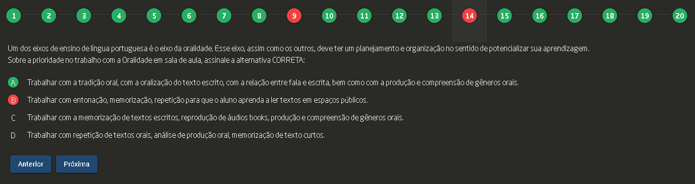 Um dos eixos de ensino de língua portuguesa é eixo da oralidade. Esse eixo, assim como outros, deve ter um planejamento e organização no sentido de potencializar sua aprendizagem. Sobre a prioridade no trabalho com a Oralidade em sala de aula, assinale a alternativa CORRETA: A Trabalhar com a tradição oral, com a oralização do texto escrito, com a relação entre fala e escrita, bem como com a produção e compreensão de gêneros orais. B Trabalhar com entonação, memorização, repetição para que aluno aprenda a em espaços públicos. C Trabalhar com a memorização de textos escritos, reprodução de áudios produção e compreensão de gêneros orais. D Trabalhar com repetição de textos orais, análise de oral, memorização de texto curtos.