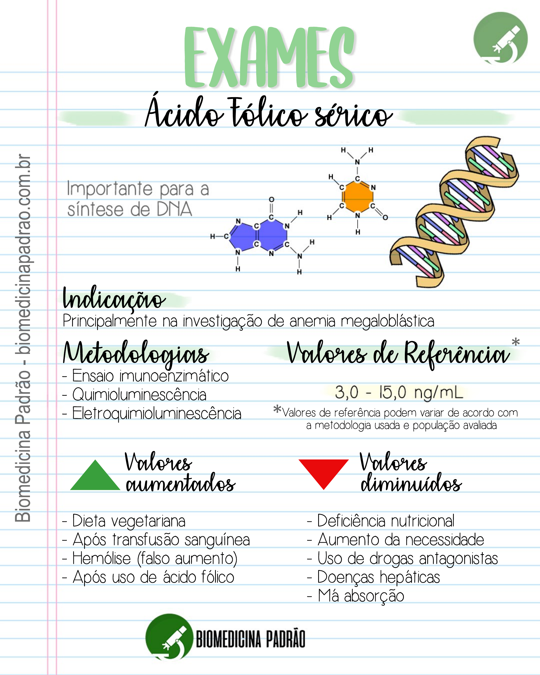 Bi om ed ici na P ad rã o - bi om ed ici na pa dr ao .co m. br exames Ácido Fólico sérico Principalmente na investigação de anemia megaloblástica - Dieta vegetariana - Após transfusão sanguínea - Hemólise (falso aumento) - Após uso de ácido fólico - Ensaio imunoenzimático - Quimioluminescência - Eletroquimioluminescência - Deficiência nutricional - Aumento da necessidade - Uso de drogas antagonistas - Doenças hepáticas - Má absorção Valores de referência podem variar de acordo com a metodologia usada e população avaliada Valores aumentados Valores diminuídos * * Indicação Metodologias Valores de Referência