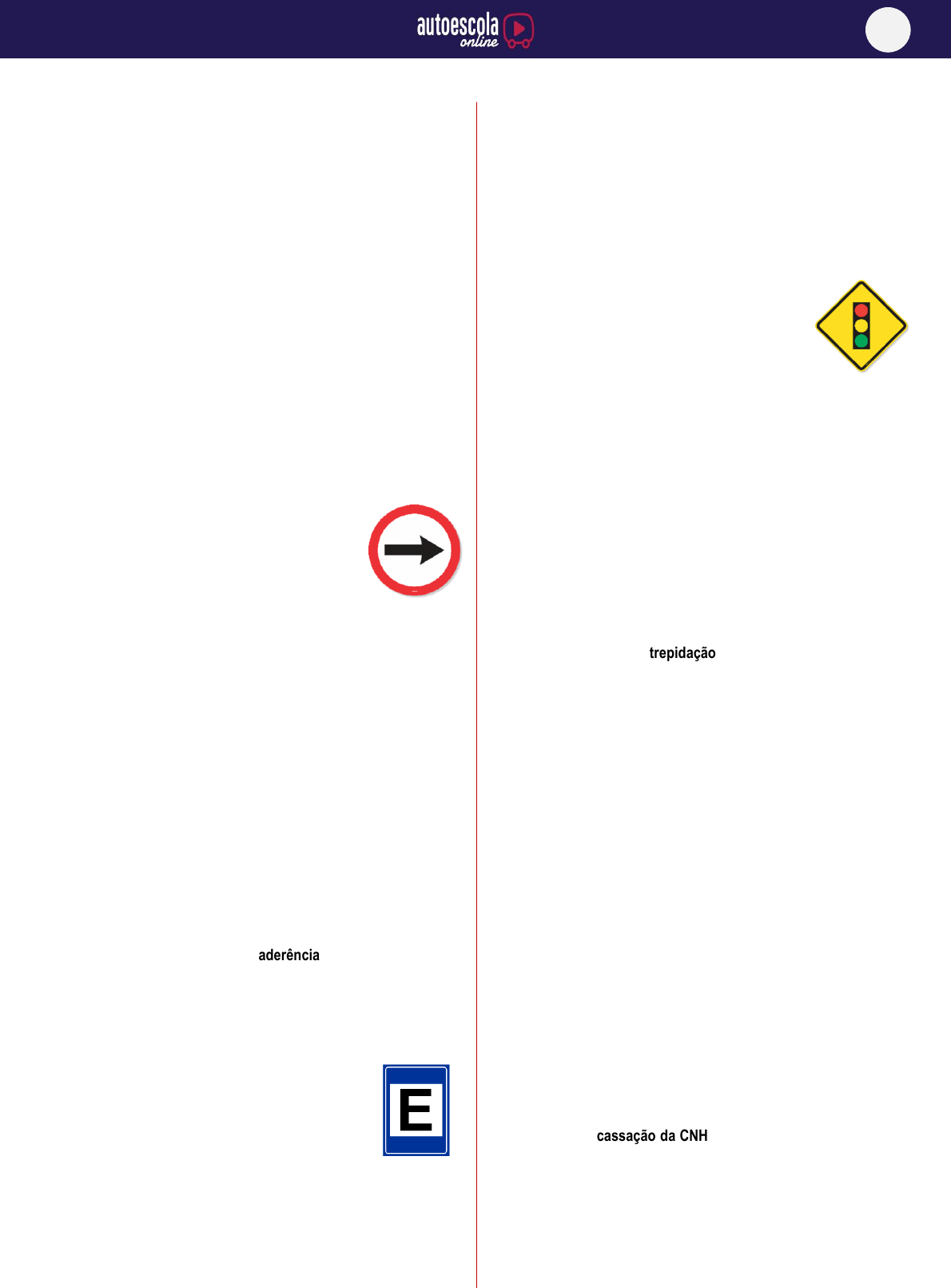 29 PROVA GERAL 01) A via caraterizada por acessos especiais com trânsito livre, sem interseções em nível, sem acessibilidade direta aos lotes lindeiros e sem travessia de pedestres em nível, cuja velocidade máxima permitida é de 80 km/h, é chamada de: A) Arterial. B) Coletora. C) Estrada. D) Trânsito rápido. 02) Alguns dispositivos existentes em seu veículo têm a finalidade de diminuir a poluição lançada ao ambiente. Isso é feito através da redução do consumo de combustível e melhor controle na emissão de gases poluentes. Qual dispositivo não agrega às funções acima mencionadas? A) A injeção eletrônica. B) O carburador. C) O catalisador. D) A sonda lambda. 03) O que regulamenta a placa R-24a? A) Virar à direita. B) Siga em frente. C) Passagem obrigatória. D) Sentido de circulação da via/pista. 04) Estacionar o veículo em locais e horários de estacionamento e parada proibidos pela sinalização (placa: proibido parar e estacionar) é infração: A) Média. B) Gravíssima. C) Grave. D) Leve. 05) Localize a metade inferior do osso esterno, subindo dois dedos a partir do início da costela. Esse é um dos procedimentos para executar a massagem cardíaca que deve ser repetida a cerca de ___ por minuto: A) 12 a 15 vezes. B) 30 a 60 vezes. C) 100 vezes. D) 60 a 120 vezes. 06) Não é causa da diminuição da aderência do veículo: A) Óleo na pista. B) Excesso de velocidade. C) Pista escorregadia. D) Pneus em bom estado de conservação. 07) A placa SAU-01 indica: A) Posto de socorro médico junto ou próximo à via. B) Escola próxima à via. C) Área de estacionamento. D) Hotel. 08) RENAVAM é o: A) Registro Nacional de Veículos Motorizados. B) Registro Nacional de Veículos Automotores. C) Registro Nacional de Veículos Automotivos e Motorizados. D) Registro Nacional de Condutores Motorizados. 09) Chove forte e o limpador de para brisa de seu veículo não está sendo suficiente para manter a visibilidade. Nessa situação você: A) Abre as janelas e prossegue o trajeto. B) Acelera mais para dissipar os pingos de chuva. C) Para o veículo em local seguro e aguarda. D) Liga os faróis altos. 10) A placa A-14 adverte que, à frente, você vai encontrar: A) Um semáforo. B) Um canteiro de obras. C) Um cruzamento. D) Uma parada obrigatória. 11) No interior de túneis extensos é aconselhável instalar exaustores, porque nesse ambiente acumula-se: A) Partículas de fumaça, somente. B) Gases tóxicos, somente. C) Partículas de vapor d'água, somente. D) Gases e partículas de fumaça. 12) Quanto tempo de habilitação na categoria “B” um condutor precisa ter para habilitar-se na categoria “E”? A) Não é permitido mudar da categoria “B” diretamente para a “E”. B) 1 ano. C) 2 anos. D) Não existe interstício. 13) O aparecimento de trepidação sentida no volante de direção sempre que o veículo alcançar uma determinada faixa de velocidade é sinal da necessidade do trabalho de manutenção indicada com: A) Balanceamento das rodas. B) Troca do fluído de freios. C) Lubrificação da caixa de direção. D) Verificação dos valores de cambagem. 14) Terá preferência o veículo que se aproximar pela via à sua direita quando: A) Estiver transportando passageiros, apenas. B) O cruzamento for sinalizado com semáforo ou placa "PARE". C) Estiver transitando em maior velocidade que a sua. D) O cruzamento não for sinalizado. 15) O condutor de veículo que deixar de dar preferência de passagem a pedestre portador de doença física, crianças e idosos que estejam concluindo a travessia, mesmo que ocorra sinal verde para o veículo, comete infração: A) Gravíssima. B) Grave. C) Média. D) Leve. 16) No caso de cassação da CNH, poderá o condutor se reabilitar. Qual o procedimento necessário? A) Refazer os exames de sanidade física e mental. B) Refazer somente o exame de direção depois de 1 a 12 meses. C) Decorridos 6 meses, todos os exames deverão ser feitos. D) Após dois anos, deverá o condutor submeter-se a todos os exames que são exigidos para habilitação. 1D, 2B, 3D, 4C, 5C, 6D, 7C, 8B, 9C, 10A, 11D, 12A, 13A, 14D, 15A, 16D, 17C, 18A, 19A, 20B, 21C, 22A, 23D, 24B, 25C, 26C, 27A, 28B, 29D, 30B 29 17) Dispositivo destinado ao controle de ruído do motor é equipamento obrigatório para veículos: A) Reboques ou semirreboques. B) De propulsão humana e de tração animal. C) Automotores (motores a combustão). D) Elétricos. 18) Em uma curva, a diminuição brusca da velocidade provoca transferência de massa fazendo com que o eixo dianteiro fique mais: A) Pesado que o eixo traseiro, tendendo a "desgarrar a traseira". B) Leve que o eixo traseiro, tendendo a "desgarrar a dianteira". C) Pesado que o eixo traseiro, tendendo a "desgarrar a dianteira". D) Leve que o eixo traseiro tendendo a "desgarrar a traseira". 19) A seta direcional da cor branca, inscrita no pavimento significa: A) Retorne à esquerda. B) Siga em frente. C) Vire à esquerda. D) Siga em frente ou vire à esquerda. 20) Dirigindo um veículo, ao se aproximar de um cruzamento com sinal luminoso, você observa que a luz amarela está acessa. Neste caso, você deve: A) Diminuir a velocidade do veículo e passar. B) Diminuir a velocidade e parar o veículo. C) Observar o tráfego dos veículos e passar. D) Frear bruscamente o veículo. 21) A injeção eletrônica é uma das inovações da década de 90 e veio para substituir o “velho” carburador. Sobre ela, marque a incorreta: A) Sua manutenção deve ser feita a cada 20.000 km. B) Os bicos injetores são os elementos que mais precisam de reparos. C) Por ser um componente eletrônico, dispensa manutenção periódica. D) Agrega mais eficiência ao sistema de alimentação. 22) Manter a cabeça mais baixa que o corpo é socorro prestado à vítima: A) Em estado de choque. B) Com ferimentos na cabeça. C) Com as pupilas dilatadas. D) Com temperatura baixa. 23) Em uma situação de emergência, poucos condutores conseguem c