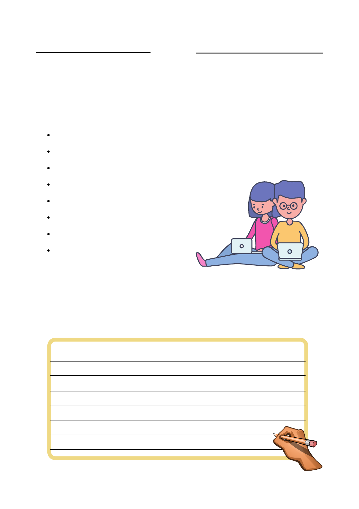 Describing a classmate 1- Interview a classmate you don´t know well. You can use the questions below as a guide. What´s your name? How old are you? Where are you from? What can you do? What do you like? Do you have brothers or sisters? What do you like? What´s your favourite singer/ band? 2- Write a paragrah about your classmate. Use all the information you gathered in activity 1. Name: Class: He/ She... The clock is the chest of drawers . The books are the bookshelf. The teddies are the box. The backpack is the floor. The lamps are the desk. The pillows are the beds. The pictures are the wall. The castle is the bookshelf Prepositions of place: in/ on/under Look at the picture of the bedroom and complete the sentences with the correct prepositions: in/ on/ under The clock is the chest of drawers . The books are the bookshelf. The teddies are the box. The backpack is the floor. The lamps are the desk. The pillows are the beds. The pictures are the wall. The castle is the bookshelf Prepositions of place: in/ on/under Look at the picture of the bedroom and complete the sentences with the correct prepositions: in/ on/ under My Holiday Memories I went to... I played... I ate... I learned... On the last day I... Write about your last summer holidays. Remember to use Simple Past to write your sentences. Name: Survey for students Your opinion counts. So please take your time and tell us what you think. A. Three activities I enjoyed: B. Two people I want to acknowledge (teachers, assistants, secretaries): C. One thing I found difficult or I want to change: D. Next year I would like... Steps Description Excellent Very good Good Developing Preparing a topic for the project I chose an interesting topic thinking about my audience Making Notes I took down notes about the topic chosen. Planning your project I organized the information in a way that made sense and was easy to understand, Rehearsing and Checking I practised my presentation in front of a mirror or with a friend. Finalizing and presenting I presented my project in front of the class. I watched other presentations and chose my favorite. Project Self- Evaluation Checklist Complete the self evaluation. Tick the boxes that best match how you feel about your project. Take down notes about your strengths and weaknesses. I'm proud of Next time I want to improve Did you...? You Teacher Classmate go to the movies go shopping play tennis watch TV go to a party get up late meet friends listen to music eat fast food Questionnaire Last weekend Look at the questionnaire. Put a check next to the things you did last weekend. Ask your teacher and classmate the questions. Put a check next to the things he/ she did. Tell the rest of the class about you and your classmate. 1. 2. 3. 1- Halloween is celebrated on October 30th. True False 2- The word "Halloween" comes from All Hallows' Eve and means "hallowed evening." True False 3- Jack-o-lanterns are hollowed out potatoes. True False 4- Jack-o-lanterns were used to scare away bad spirits. True False 5- In Halloween, we tell scary stories about ghosts, monsters and creepy creatures. True False 6- Children dressed in costumes go from house to house in their neighbourhood asking for money. True False 7- Apple bobbing is a traditional game. Apples are put in a big bowl with water. The players must take an apple out without using their hands. True False 5- In the past, to avoid being recognized by ghosts people would wear scary masks when they left their homes after dark, so the ghosts would mistake them for other ghosts True False Halloween traditions quiz Are the sentences T (true) or F (false)? Name: Class: Brazil The US China Australia South Africa Where are you from? Drag and drop the flags next to the correct countries. Colombia Spain Jamaica Mexico The UK Find someone who... Walk around the classroom and ask your classmates questions to find someone who fits each statement below. You can only find one person for each category. You cannot use the same person twice. Can play an instrument Speaks three languages Loves computer games Can cook pasta Writes stories Is good at maths Knows how to swim Can draw Can knit Takes dancing lessons Is good at sports Loves soap operas Anna can ride her bike Emma can´t ride her bike 1- I ______________ ride a bike. 2- I_______________ swim. 3- I________________ play football 4- I_________________ rollerskate. 5- I ________________ do gymnastics. 6- I ________________ dance. 7-I ________________ play basketball. Can / Can´t What can you do? Complete the sentences with can or can´t. Name: Class: Topic Reviewed Topic reviewed Topic reviewed Topic reviewed Topic reviewed Topic reviewed Self Evaluation Worksheet Complete this worksheet after the first week back to school. Name: Class: 1)Tick the boxes that are true for you. 1)Complete the table. What I remembered the most One thing I need to improve To improve I can One thing I'd like to learn this year I can do this very well I can do this well I can do this with some help I need more practice Hair Eyes Anna brown green Amy black black Billy blond blue Have you got...? Read and answer the questions. 2- Have you got green eyes, Billy? 3- Have you got blue eyes, Amy? 4- Have you got black hair, Anna? 1- Have you got blonde hair, Anna? My name is Three positive aspects of my personality are A song that makes me happy My dream job is I could never live without Something that makes me angry is A teacher I'll always remember A happy school memory I'm worried about The three most important people in my life are: All about me! Numbers 1-10 Write and say the numbers Welcome Spring! Complete with the missing letters. F _ O W_ R B I _ _ C H _ _ K S _ _B_ T T_ _ F _ _L A _ _ _ U G R A _ _ _ O W B _ _ R _ _ _ I T O P Q R S T U V W X Y N Z Thanksgiving: I am thankful for... For each letter of the alphabet write one thing you're thankful for B C D E F G H I J K L A M Guess what I'm doing drinking soda eating spaghetti walking on ice takin