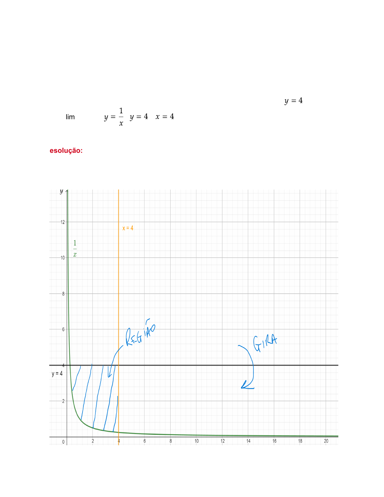 Tiago Lima - Instagram: @professor_disciplinas_exatas / WhatsAPP: (71) 9927-17449 Visite meu perfil no site Passei Direto e confira mais questões: https://www.passeidireto.com/perfil/tiago-pimenta/ ● Determinar o volume do sólido gerado pela rotação, em torno da reta , da região y = 4 limitada por , e .y = 1 x y = 4 x = 4 Resolução: Abaixo, temos uma representação da região e como esta deve girar para encontrarmos o volume que desejamos; y Usando o método dos discos, o volume de região da região é dado por; V = 𝜋 f x dx b a ∫ [ ( )]2 Antes de aplicar a fórmula, é preciso fazer uma translação no eixo de forma que o eixo y sobre o qual queremos rotacionar coincida com a origem. Para isso, vamos subtrair 4 unidades das curvas em suas coodenadas , encontrando assim, uma curva corespondente y em um eixo ;y' y' = - 4 e y' = 4 - 4 = 0 1 x (1) Com isso, a representação da região que desejamos rotacionar fica; Temos, agora, um novo eixo, em que , coicidindo com a origem, e curva y' = 0 y = 1 x coincide com a curva . se , temos;y' = - 4 1 x y' = 0 0 = - 4 - 4 = 0 = 4 1 = 4x 4x = 1 x = 1 x → 1 x → 1 x → → → 1 4 y' x 0 y' = - 4 1 x Como a área é delimitada pelas e , temos que o limite de integração vai de a y' = 0 x = 4 1 4 . Substituindo essas informações na equação 1, temos que o volume desejado é dado pela 4 integral; V = 𝜋 - 4 dx 4 ∫ 1 4 1 x 2 Rearrumando os termos, temos; V = 𝜋 + 2 ⋅ -4 ⋅ + -4 dx = 𝜋 - 4 ⋅ + 16 dx 4 ∫ 1 4 1 x 2 ( ) 1 x ( )2 4 ∫ 1 4 1 x 2 2 2 x V = 𝜋 - + 16 dx = 𝜋 x - + 16 dx 4 ∫ 1 4 1 x2 8 x 4 ∫ 1 4 -2 8 x Primeiro, vamos resolver a integral em sua forma indefinida; I = 𝜋 x - + 16 dx = 𝜋 x dx - 𝜋 dx + 𝜋 16dx∫ -2 8 x ∫ -2 ∫8 x ∫ = 𝜋 - 8𝜋 dx + 16𝜋x = 𝜋 - 8𝜋ln|x| + 16𝜋x + c x -2 + 1 -2+1( ) ∫1 x x -1 -1 I = 𝜋 - - 8ln|x| + 16x + c 1 x Agora, voltando para a integral definida que resultata no volume desejado, fica; V = 𝜋 - 4 dx = 𝜋 - - 8ln|x| + 16x 4 ∫ 1 4 1 x 2 1 x 4 1 4 Resolvendo; V = 𝜋 - - 8ln|4| + 16 ⋅ 4 - 𝜋 - - 8ln| | + 16 ⋅ 1 4 1 1 4 1 4 1 4 V = 𝜋 - - 8ln|4| + 64 - 𝜋 - ⋅ - 8ln| | + 1 4 1 1 4 1 1 4 16 4 V = 𝜋 - 8ln|4| + 8𝜋ln = + 8𝜋ln - 8𝜋ln|4| -1 + 255 4 1 4 127𝜋 4 1 4 V = + 8𝜋ln = + 8𝜋ln = + 8𝜋ln 16 = + 8𝜋ln 2 255𝜋 4 1 4 ⋅ 4 255𝜋 4 1 16 255𝜋 4 -1 255𝜋 4 ( )3 -1 V = + 8𝜋ln 2 = + 8𝜋ln 2 = - 3 ⋅ 8𝜋ln 2 255𝜋 4 ( )3 -1 255𝜋 4 ( )-3 255𝜋 4 V = 𝜋 - 32ln 2 u. v. 255 4 V = 𝜋 - - 8ln|4| + 64 - 𝜋 -4 - 8ln| | + 4 1 + 4 ⋅ 32 4 1 4 (Resposta)