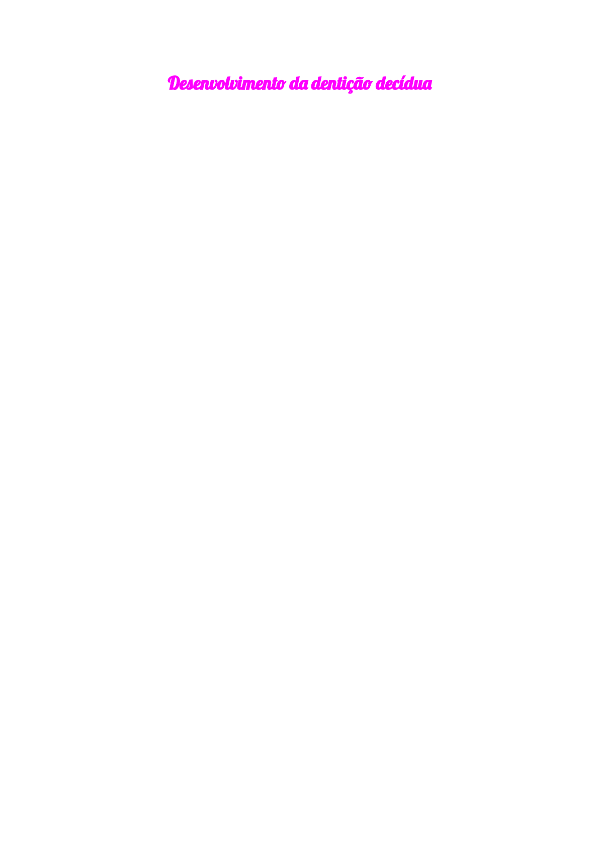 Desenvolviment� d� dentiçã� decídu� PERÍODO PRÉ DENTAL ● Entre o nascimento do bebê e o surgimento dos primeiros dentes; ● Ausência de elementos dentários e presença dos roletes gengivais ● Radiografias - elementos dentários em vários estágios de formação; ● Mandíbula - retruída e distalizada, movimento de sucção na amamentação . PERÍODO DOS ROLETES GENGIVAIS ● Processos alveolares recobertos por um espessamento da mucosa gengival firmemente aderida; ● Maxila - ferradura e Mandíbula - de U. ● Contactam-se na região posterior e há presença do "espaço mesial anterior" - Processo alveolar desenvolvem verticalmente e o espaço intermaxilar desaparece DENTIÇÃO DECÍDUA ● Inicia-se aos 6 meses, com erupção do ICD. Completa aos 24-30 meses com erupção dos 2º MD. Seu término é até os 6 anos com erupção do 1º MIP. BIOGÊNESE - FASE 1 ● Erupção dos incisivos; ● Sobremordida profunda; ● Não há sentido de oclusão. Incisivos centrais inferiores: 6 meses. incisivos laterais inferiores: 7 meses. Incisivos centrais superiores: 7 meses e ½. Incisivos laterais superiores: 9 meses. BIOGÊNESE - FASE 2 ● Erupção dos 1° molares ● 1° sentido de dimensão vertical ● Modificação do overbite ● Definição da ATM ● 1°sentido da oclusão 1° Molar superior: 14 meses 1° Molar inferior: 12 meses BIOGÊNESE - FASE 3 ● Erupção dos caninos ● Estabelece a guia canina ● Manutenção dos espaços primatas Caninos inferiores - 16 meses Caninos superiores - 18 meses BIOGÊNESE - FASE 4 ● Erupção dos 2° molares; ● Relação distal determina a posição dos primeiros molares permanentes 2° Molar superior: 24 meses 2° Molar inferior: 20 meses CARACTERÍSTICAS ● 20 dentes; ● Menores que os permanentes; ● Coroas branco leitosa, branca ou branco azulada; ● Menor nível de mineralização - camada de esmalte mais fina, logo, coloração mais esbranquiçada; ● Menor resistência; ● Arco dentário ovóide, arredondada, semi circular ou trapezoidal. ● A diferença da tonalidade de cor entres as duas dentições deve-se ao fato de que o dente permanente tem uma espessura maior de dentina, o que faz com que ele seja mais amarelado do que os dentes de leite. CARACTERÍSTICA PULPAR ● A câmara pulpar é maior em relação aos permanentes; ● Os cornos pulpares mesiais são mais proeminentes nos decíduos; ● Raízes mais longas; INCLINAÇÃO ● Presença de paralelismo entre as raízes; ● Ausência de curva de Spee e curva de Wilson; ● Ausência de inclinação axial; ATM ● A ATM localiza-se próxima ao plano oclusal dos dentes inferiores e paralela a este RELAÇÃO MOLAR OU PLANO TERMINAL . ESPAÇO PRIMATA ● São espaços existentes na maxila entre o incisivo lateral e canino e na mandíbula entre canino e primeiro molar. CURVA DE SPEE E DE WILSON ● Implantado verticalmente na base óssea apical ● Face oclusal e incisal no mesmo plano ● Não tem a presença das curvas de wilson e spee ARCOS TIPO BAUME ● Arco do tipo I: diastemas generalizados (mais favorável) ● Arco do tipo II: nenhum espaçamento interdentário (não favorável) ENVELHECIMENTO E ESFOLIAÇÃO ● Redução do overbite e overjet ● Desgastes ● Rizólise - reabsorção progressiva e intermitente SINTOMAS ASSOCIADOS AO PROCESSO ERUPTIVO ● Manifestações sistêmicas ● “Febre” ● Diarreia ● Falta de apetite ● Irritação ● Distúrbios no sono HÁBITOS DELETÉRIOS ● Mamadeira, sucção digital e chupetas, onicofagia (roer unhas) e respiração bucal; ● Provocam alterações no padrão de crescimento; ● Relacionado com a duração, frequência e intensidade ● O único hábito bucal que quando cessado até os 4 anos se auto corrige é o hábito de sucção de dedo e chupetas VARIAÇÕES CRONOLÓGICAS Fatores gerais ● Fator genético ● Sexo - meninas é mais precoce que meninos ● Ambiente - zona urbana MAIOR zona rural MENOR ● Disostose cleidocraniana ● Síndrome de Down ● Displasia do ectoderma hereditário Fatores locais ● Anquilose dentoalveolar ● Dentes inclusos ● Falta de espaço ● Dentes supranumerário POR Ana Luisa Nascimento Silva