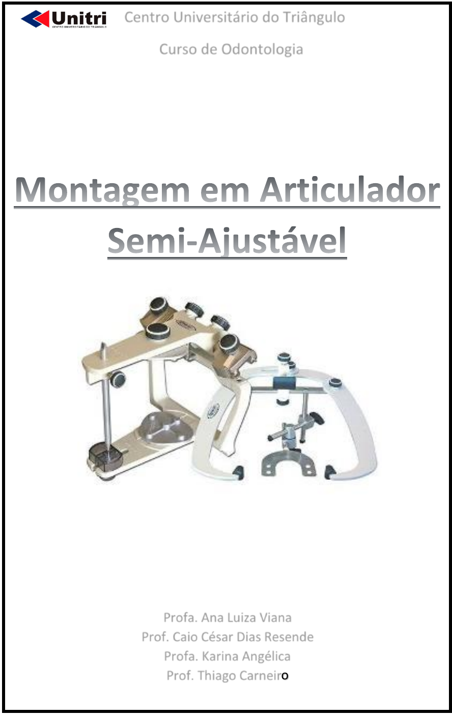 Centro Universitário do Triângulo Curso de Odontologia Profa. Ana Luiza Viana Prof. Caio César Dias Resende Profa. Karina Angélica Prof. Thiago Carneiro Roteiro para Aula Prática de Articuladores O articulador é um instrumento mecânico que representa a articulação temporomandibular, a maxila, a mandíbula, além de registrar alguns movimentos mandibulares. Os articuladores são classificados de acordo com os movimentos por ele realizados, e, pode seu usado como um meio auxiliar de diagnóstico, planejamento ou para o tratamento reabilitador propriamente dito (CARDOSO, 2003) 1 - Definição: É um aparelho que nos permite transportar para o laboratório, os modelos dos nossos pacientes articulados e na mesma posição espacial em que encontram na pessoa, em relação à ATM, para que possamos realizar os nossos trabalhos sem a presença do paciente. Esse transporte pode se dar com vários níveis de precisão, em relação às guias, ângulos, distâncias, etc., conforme os recursos que os diversos tipos de articuladores nos fornecem. Em outras palavras, articulador é um aparelho mecânico com a função de nos fornecer a reprodução dos movimentos mandibulares, a posição dos dentes em relação ao crânio, e consequentemente em relação à ATM, suas angulações e trajetos para que, ao montarmos os nossos modelos nos seus ramos, possamos reproduzir em laboratório, todos aqueles movimentos que aconteceriam na boca sem a presença física do paciente. 2 – Funções: - Montar modelos de estudos; - Fazer enceramentos diagnósticos; - Para demonstrar ao paciente o tratamento planejado; - Fazer análise oclusal e/ou ajuste oclusal; - Encerar troquéis dos trabalhos protéticos; - Remontar trabalhos protéticos para ajuste; - Montar próteses totais; - E para tudo aquilo em que necessitamos de um modelo articulado, para uma fase em laboratório e que não desejamos o paciente, ou que iria demandar muito tempo, o articulador nos serve. 3- Classificação: Podemos classificar os articuladores em quatro categorias segundo Weinberg: - Oclusores são as charneiras, nas quais fixamos os modelos para apenas abrir e fechar, e ainda em um eixo irreal. São também chamados articuladores em Bisagra, pois usam somente este eixo. Não nos dão outros atributos. Às vezes servem para esculpir restaurações unitárias, mas que deverão passar por um ajuste na boca após a escultura e mesmo assim, em pacientes que não tenham problemas oclusais. Ex.: oclusores de Kile e de Irish. - Articuladores fixos ou arbitrários - nestes, alguns ângulos vêm fixos, como os da guia condilar e do ângulo de Bennett, que nos dão movimento de lateralidade e de protrusiva mas não os podemos regular. Fixa também é a distância intercondilar. Também não possuem arco facial. Geralmente, o ramo superior vem preso ao inferior, não nos permitindo separá-los para trabalhar em separado. São muito usados para montagens de próteses totais, porque são leves e de fácil manuseio. Ex.: Articulador de Monson, New simplex, DCL. - Semi ajustáveis ou parcialmente ajustáveis - são os que iremos usar para as nossas práticas de escultura e de Oclusão - Permitem que se ajuste os ângulos de Bennett, o ângulo da guia condilar e ainda que se transporte os modelos para o articulador, em posição tal que é similar à posição que ocupam no paciente em relação ao seu crânio, através do arco facial. No rol dos semi- ajustáveis, podemos encontrar também articuladores com guias curvas, que imitam mais um pouco as curvas das cavidades articulares, porém, apenas em parte. Ressalto neste momento, que a maioria dos articuladores semi-ajustáveis de comum uso nosso, possuem guias retas, e isso é um fator que nos acarreta aumento no tempo de ajuste adicional na boca do paciente de nossas esculturas. Mas existem outros que têm mais recursos. Ex.: Bio-art, Wip-Mix, 8500 (Wip Mix 2000 tem guias curvilíneas). O Denan Mark II tem guias retas, mas possui ajuste para o deslocamento lateral imediato, o que já é uma vantagem. 4- AJUSTE DE ARTICULADOR SEMI AJUSTÁVEL: o Inclinação condilar: 30˚ o Distância intercondilar: 1, 2 ou 3 - distância de um côndilo até o outro o Ângulo de Bennett: 15˚ - ângulo que nos ajuda a fazer a lateralidade. O caminho que o côndilo faz a translação, faz um ângulo que é o ângulo de Bennett. INCLINAÇÃO CONDILAR: Ângulo no qual os côndilos descem ao longo da eminência articular no plano sagital Quanto MAIOR a angulação MAIS alta as cúspides posteriores DISTÂNCIA INTERCONDILAR: distância entre os côndilos: 1 (pequeno), 2 (médio), 3 (grande). O articulador vai nos dar essas três opções. ÂNGULO DE BENNETT: o ângulo de Bennett faz uma parede medial, uma inclinação de 15 graus. Já deixamos isso pré- determinado. MOVIMENTO DE BENNETT: MOVIMENTO DE TRANSLAÇÃO LATERAL MANDIBULAR Quanto MAIOR o movimento de translação lateral MAIS baixas as cúspides posteriores. O nosso organismo se projeta pensando em modificações. 5- MOLDAGEM COM ALGINATO • Moldeiras Verner Superior e Inferior; • Cuba de borracha; • Espátula para alginato (Plástico); • Espátula para gesso (Metal); • Alginato; • Gesso pedra tipo II; • Cera Utilidade; • Lecron; • Faca para gesso. O ato da obtenção do molde é uma etapa clínica simples, porém necessita de alguns cuidados para que se possa realizá-la com sucesso. 1) Selecionar as moldeiras de forma que não devem entrar muito justas, pois pode traumatizar a mucosa de revestimento ou não deixar espaço para o material de moldagem e nem muito folgadas, além do risco de promover bolhas, o excesso de material de moldagem (alginato) possui maior risco de distorção, devido à alta sensibilidade de perda de água para o meio. Indica- se iniciar a seleção com as moldeiras S-2 e I-2, a depender da prova opta-se por outra de maior ou menor tamanho. 2) Individualização das moldeiras com cera utilidade. Recortar tiras fin
