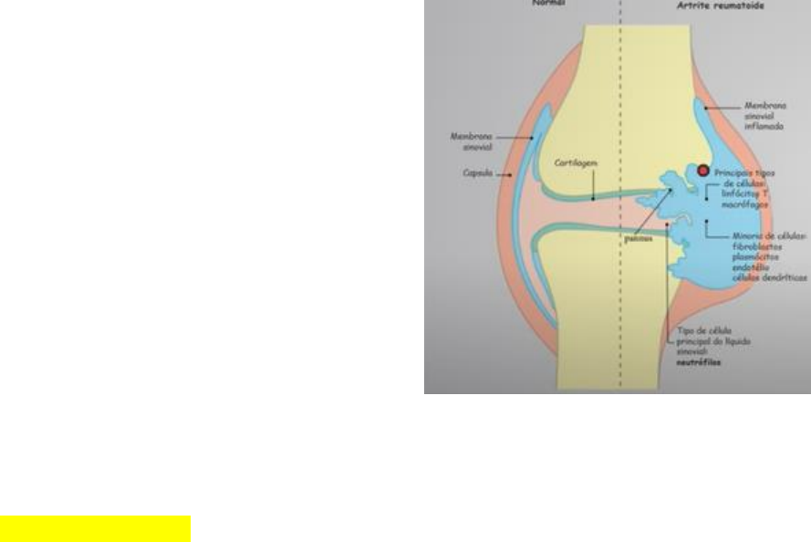 ARTRITE REUMATÓIDE É uma doença inflamatória crônica autoimune, por mais de 6 semanas com episódios de artrite e tem produção de autoanticorpos; Etiologia Boa parte da etiologia é desconhecida, mas tem alta predisposição genética (HLA DR4), o cigarro é um gatilho imunológico, exposição a luz solar para pacientes com lúpus, predominante no sexo feminino (hormonal?). Há uma resposta autoimune sistêmica decorrente da produção de 1 ou mais antígenos Há relação com a Chikungunya, Parvovírus B19, EBV, M. Tuberculosis, E. coli e Proteus mirabilis. Há fatores protetores como uso de aco, gravidez e a pré menopausa é um fator de piora da doença. Epidemiologia Doença de mulheres jovens por volta dos 30 a 50 anos, principalmente em mulheres mas pode afetar os homens também Fisiopatologia Na fisiopatologia, há um desequilíbrio entre citocinas pró inflamatórias e anti inflamatórias, levando a uma autoimunidade gerando infamação crônica e destruição articular e erosão; 1. Um estímulo antigênico leva a um recrutamento celular de células de defesa que se aderem ao endotélio, no espaço intrarticular. 2. Ao chegar na articulação, desencadeiam resposta tipo TH1 mediada por células levando produção de TNF alfa e IL-1 gerando inflamação; 3. Célula apresentadora de antígeno se ativa e faz a diferenciação do linfócito T (a partir do CD80 do macrófago e CD28 do linfócito T) AO acontecer isso, há proliferação e diferenciação em duas linhagens: TH1 e TH17; 4. TH1 vai fazer uma resposta adquirida que vai levar a produção de autoanticorpos (fator reumatoide e anti ccp) 5. TH17 vai fazer a produção de interleucinas, perpetuando a ativação de macrófagos, fazendo com que produzam inúmeros mediadores inflamatórios: IL-1, IL-6 e TNF alfa. 6. TNF alfa estimula proliferação e diferenciação das células responsáveis pela formação e degradação da matriz óssea Membrana sinovial que começa a ser atacada, e fica inflamada, e começa a ficar proliferada destrutiva e isso é chamado de pannus; Observações: - CD28 e 80 é um ponto de bloqueio - TNF alfa – principal ponto de bloqueio para tratar o paciente, que é o único produzido pelas duas células TH1 e TH17 . - Quem tem ANTI – CCP é um paciente de alto risco para desenvolver a patologia (TH1), ele é mais específico do que o fator reumatoide; Quadro clínico O paciente inicia com queixas inespecíficas como: fadiga, febre baixa, mialgia que precedem dos sintomas articulares. Manifestações articulares Dor e edema articular (artrite): Frequentemente é poliarticular acometendo pequenas e médias articulações (mãos e pés), geralmente são simétricas e aditivas associadas a rigidez matinal; Pode apresentar: alargamento dos punhos, nódulos, aumento das metacarpofalangianas, desvio ulnar dos dedos, deformidade em pescoço de cisne, dedo em abotoadura A dor piora ao repouso e melhora com a movimentação da articulação Manifestações extrarticulares Comprometimento cutâneo com presença de nódulos, olho seco com ou sem ceratoconjutivite, derrame pericárdico, miocardite, nódulos pulmonares... História clínica O paciente tem períodos de melhora e piora, exacerbações. É uma patologia de característica agressiva com deformidade e perda funcional. Diagnóstico O paciente deve ter 4 dos critérios abaixo para definir como doença, porém só é possível identificar em fases mais avançados da doença Mais de 6 pontos dessa tabela Exames complementares Os principais: fator reumatoide, anti CCP, radiografia simples; Achados radiológicos Podem estar presente em apenas fases avançadas: aumento de partes moles periarticulares, osteopenia periarticular, redução dos espaços articulares, erosões marginais, subluxações, anquilose óssea, distribuição simétrica; Tratamento Os objetivos do tratamento são: controle da dor, redução da inflamação e proteção e preservação das estruturas articulares; Anti - inflamatórios não hormonais É utilizado em fases ativas da doença por tempo longo, assim se atentando aos efeitos colaterais. Ter atenção nos pacientes que já tem algum dano renal, dispepsia ou ulcera e alto risco cardiovascular. Corticosteroides Usar em menor tempo possível, em baixas ou moderadas dose. Utilizar doses altas somente em manifestações sistêmicas graves. Se for usar por tempo prolongado fazer profilaxia de osteoporose. Agentes modificadores do curso da doença Alteram o curso clínico da doença, reduzindo dano radiográfico e estrutural preservando a integridade e a função articular. - Metotrexato Ação de antiproliferação de linfócitos e efeito anti inflamatório; Poupa uso de corticoesteroides nesses pacientes; - Leflunomida Bloqueia a síntese do DNA, mas por um mecanismo diferente do metotrexato. Age na síntese das pirimidinas, com ação antiproliferação de células T e mononucleares. Melhora a atividade da doença, a qualidade de vida e reduz a progressão radiológica da doença. - Sulfassalazina Ações moduladoras sobre os linfócitos B e T e várias outras células inflamatórias. - Antimaláricos Hidroxicloroquina é a droga de escolha Obrigatoriamente os pacientes devem realizar acompanhamento com oftalmologista e campimetria visual, pois possui impregnação no fundo ocular Agentes biológicos Medicamentos desenvolvidos e direcionados contra moléculas de superfície celular ou citocinas secretadas no espaço extracelular. Consistem em anticorpos monoclonais e antagonistas de receptores; Opções anti – TNF: infliximabe, etarnecept, adalimumabe, golimumabe, certolizumabe Esses medicamentos podem deixar o paciente susceptivel a infecções como TB, exacerbar IC... E tem rituximabe que é anti CD20 Em todas as fases da doença o paciente deve fazer atividade física, controlar o peso, dieta, analgesia... Como é feita a escolha dos medicamentos? Paciente diagnosticado -> metotrexato Se não responder bem a uma droga mo