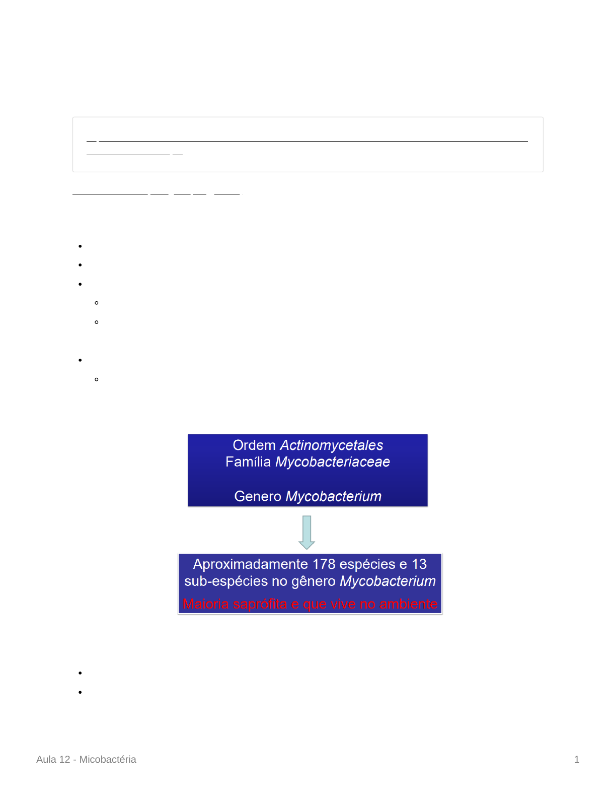 Aula 12 - Micobactéria 1 Aula 12 - Micobactéria https://s3-us-west-2.amazonaws.com/secure.notion-static.com/e465195f-dc1b-46b4-9f68-8eb93b3b2ac7/Mico bacterium_-_Estudo.pdf 2021_47_2_3520_portugues.pdf (gn1.link) INTRODUÇÃO Ordem → Actinomycetalis Família → Mycobacteriaceae Gênero → Mycobacterium Aproximadamento 172 espécies e 13 dub-espécies A maioria são espécies saprófitas (decompositoras) e vivem no ambiente Observações Muitas das bactérias desta ordem produzem substâncias bioativas, como antifúngicos, antibacterianos e substâncias anti-tumorais MYCOBACTERIUM Nome proposto por Lehmann e Neumann em 1896 “Mico”bactérias (sufixo “mico” = fungo) https://www.notion.so/signed/https%3A%2F%2Fs3-us-west-2.amazonaws.com%2Fsecure.notion-static.com%2Fe465195f-dc1b-46b4-9f68-8eb93b3b2ac7%2FMicobacterium_-_Estudo.pdf?table=block&id=f04e0e03-0abc-4423-9be3-2af04f58ecd5&spaceId=89a86349-7b9d-411b-bb2f-6ca6fc30362c&userId=b050fdb7-8018-4888-9ef0-f18a1d8fba84&cache=v2 https://cdn.publisher.gn1.link/jornaldepneumologia.com.br/pdf/2021_47_2_3520_portugues.pdf Aula 12 - Micobactéria 2 Em referência à película formada pelo M. tuberculosis na superfície de meios líquidos que era similar a produzida por alguns fungos As micobactérias são bastonetes muito finos, que vão se multiplicando e adquirindo o aspecto filamentoso como o dos fungos IMPORTÂNCIA EM SAÚDE Agente etiológica da tuberculose humana e bovina Tuberculose está relacionada com o aumento de infecções por HIV Agente etiológico de hanseníase Alta prevalência no Brasil Agentes de doenças disseminadas em imunossuprimidos CLASSIFICAÇÃO Família → Mycobacteriaceae Gênero → Mycobacterium A classificação das Micobactérias não tuberculosas é dinâmica, visto que mescla critérios tradicionais com critérios moleculares Classificação de Runyon Estes critérios levam em consideração: Capacidade de causar doença Sempre patogênicos Geralmente patogênicos Não patogênicos Velocidade de crescimento Crescimento lento Crescimento rápido Coloração - Produção de pigmento carotenóide Fotocromogêneas: produzem pigmento apenas na presença de luz Escotocromogêneas: produzem pigmento apenas no escuro Não cromogêneas: não produzem pigmentos em nenhuma situação Aula 12 - Micobactéria 3 ⇒ Complexo Mycobacterium tuberculosis, Mycobacterium leprae, Mycobacterium bovis não são agrupáveis na classificação de Runyon As diferentes espécies de micobactérias possuem sensibilidades diferentes aos antimicrobianos Mycobacterium leprae Causador da hanseníase Complexo Mycobacterium tuberculosis Aula 12 - Micobactéria 4 Mycobacterium tuberculosis Mycobacterium bovis Apesar a M. bovis cause tuberculose em bovinos, ela também é capaz de causar a tuberculose em humanos com a mesma clínica que o M. tuberculosis Infecção menos frequente, devido ao controle da tuberculose bovina A vacina BCG é feita a partir de uma linhagem do M. bovis Este complexo possui representantes com 99,9% de identidade genética Micobactérias não tuberculosas (MNT) Causam infecções linfáticas, pulmonares, esqueléticas, cutâneas e disseminadas Complexo Mycobacterium avium - Infecções oportunistas em pacientes com AIDS Mycobacterium avium avium Mycobacterium hominissuis Mycobacterium paratuberculosis Mycobacterium intracellulare CARACTERÍSTICAS GERAIS Bacilos imóveis Parece celular rica em lipídios Parede complexa, rica em ácido micólico e de natureza hidrofóbica Álcool-ácido resistentes Resistentes a fármacos Não esporuladas Sem cápsula Intracelular Podem infectar e proliferar no interior de macrófagos Aula 12 - Micobactéria 5 Aeróbias estritas M. tuberculosis tem preferência pelo ápice pulmonar - maior [O2] Geralmente são mesófilas Temperatura ótima é variável, mas a maioria é mesófila Tempo de crescimento variável, mas a maioria é lento Lento - Tempo de geração de 18-28h Formação de colônias em até 1 mês Devido a parede celular Parede celular Fina camada de peptideoglicano Possuem ácido N-glicolilmurâmico em vez de ácido N-acetilmurâmico Arabinogalactano Polissacarídeo Grande quantidade e tipos de lipídeos complexos 60% do peso da parede do M. tuberculosis são devido a lipídeos Grande concentração de ácido micólico ⇒ Fator de virulência (envolvido na patogênese de doenças) Lipídeos superficiais LipoArabinomanana (LAM) Presença de porinas Não possui membrana externa Aula 12 - Micobactéria 6 Propriedades intrínsecas Resistentes as colorações usuais Resistentes a corantes, antibióticos, ácidos, álcalis e desinfetantes Bacilos álcool-ácidos resistentes (BAAR) Coloração de Ziehl-Neelsen Aula 12 - Micobactéria 7 COLORAÇÃO DE ZIEHL-NEESEN - BAAR Utiliza-se 2 corantes: fuxina e azul de metileno. O resultado de uma lâmina corada com esta coloração é um fundo azul com bactérias coradas em vermelho Para realizar esta técnica de coloração, adiciona-se a amostra a ser avaliada e a fuxina a uma lâmina, aquecendo- a em seguida. Com este aumento da temperatura, a camada de lipídeos presente na parede celular da bactéria se liquefaz e o corante é capaz de entrar na célula bacteriana. Após isso, quando a lâmina resfria, os lipídeos presentes na parede celular das bactérias se solidificam novamente, de modo que todas as bactérias presentes no material ficam coradas (mesmo as que não sejam micobactérias). Para se diferenciar as micobactérias na amostra, adiciona-se uma mistura de álcool + ácido acético ao esfregaço. As bactérias que não são álcool-ácido resistentes são descoradas e as BAAR permanecem com o corante associado a elas. Em seguida, utiliza-se o azul de metileno para corar as bactérias que foram descoradas Aula 12 - Micobactéria 8 MYCOBACTERIUM TUBERCULOSIS O M. tuberculosis foi uma das bactérias estudadas por Robert Koch, sendo devido a isso denominado de “Bacilo de Koch” Uma micobactéria pigmentada ou de cresc