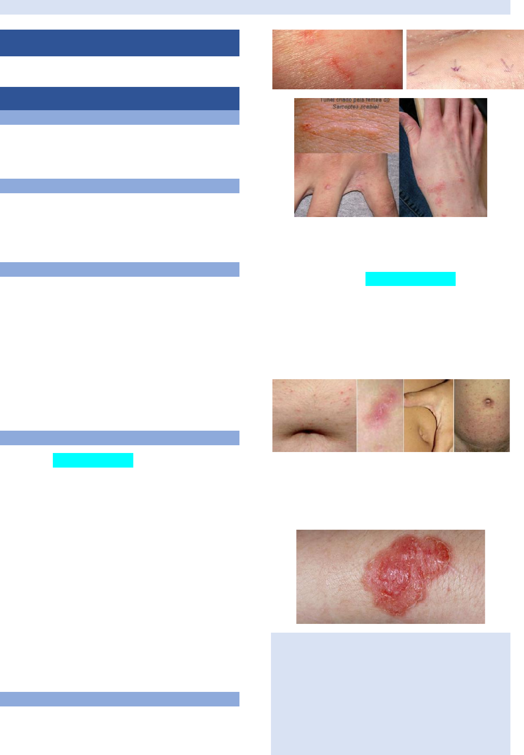 Camila Shelly de V. Ramos ECTOPARASITOSES • ESCABIOSE (SARNA) →AGENTE ETIOLÓGICO -Sarcoptes scabiei var. hominis ↳Variante que só afeta humanos →TRANSMISSÃO -Contato direto e fômites ↳Fômites -> roupa, sapato -> mais difícil transmissão →EPIDEMIOLOGIA -Mais comum em: ↳Crianças ↳Adultos jovens -Não tem predileção por sexo, raça -Presença de outras pessoas com os mesmos sintomas em casa/trabalho/ambientes frequentados →CICLO BIOLÓGICO -Duração? Média de 15 dias -Só se completa no homem -Fêmea infecta ↳Porta de entrada -> penetração na camada córnea -> cava túnel -Ciclo noturno ↳Coça mais a noite ↳Fêmea ´´anda´´ por debaixo da camada córnea - > trajeto -Fômites duram pouco tempo infectando ↳Só lavar roupas já é suficiente →MANIFESTAÇÕES CLÍNICAS -Túnel característico ↳Túnel escabiótico -Prurido ↳Mais intenso a noite -Lesão elementar = pálpula (escoriada) ↳Placa elevada + pápulas eritematosas escoriadas ↳Localização clássica: *Espaço interdigital das mãos, punhos, axilas, cintura, face, nádegas, mamas, pênis e pés -Lesões secundárias: ↳Escoriações ↳Piodermites (impetigo) OBS:ESCABIOSE X CRIANÇA -Escabiose na criança costuma ser no padrão da dermatite atópica ↳Pode ter lesões em face e couro cabeludo #padrão atípico *não localização clássica do adulto Camila Shelly de V. Ramos OBS:ESCABIOSE X IDOSO -Idoso -> imunidade menor -> padrão atípico da escabiose ↳Prurido ↳Lesões em dorso *escoriações #mediante desse quadro -> tto empírico →DIAGNÓSTICO Clínico -Contaminação familiares -Horário do prurido ✓ EXAMES -Para quem? Caso atípico RASPADO DA LESÃO PARA VISUALIZAÇÃO DO ÁCARO -Exame negativo não invalida diagnóstico ↳Conduta? Prova terapêutica →VARIANTES ✓ SARNA DE GENTE LIMPA: FORMA FRUSTA -Forma localizada de sarna ↳Caracteriza imunidade celular excelente do paciente -Acomete principalmente: ↳Profissionais de saúde *doença ocupacional ✓ SARNA NORUEGUESA OU CROSTOSA -Acomete mais: ↳Imunodeprimidos -Manifestações clínicas A forma de apresentação depende da imunidade do paciente ↳Eritrodermia like ↳Crostas ↳Hiperceratose -Altamente infecciosa ✓ ESCABIOSE NODULAR -Acomete mais: ↳Adultos (escrotal e peniana) ↳Crianças (inguinal e axilar) -Reação de hipersensibilidade ↳Resposta inflamatória do organismo a escabiose -> formação do nódulo -Clínica ↳Nódulos com muito prurido *refratário ao tratamento convencional -Tratamento ↳Corticoide no nódulo *tópico ou infiltrado Camila Shelly de V. Ramos →TRATAMENTO -Para lesão localizada: ↳Permetrina 5% (loção) *em quem? A partir de 2 meses de idade *pode ser usado em gestantes *1 aplicação única (do pescoço para baixo, deixar 8 horas) -> repetir com 1 semana (atingir ovos) *se passar demais -> irritativo -> dermatite de contato ↳Pasta d´água de enxofre (enxofre precipitado) *pode ser feito em menores de 2 meses de idade e em grávidas *mesma forma de aplicação da permetrina -Para lesões disseminadas, formas extensas: ↳Ivermectina (oral) *1 comprimido para cada 30kg *para quem? A partir de 2 anos *repetir em 1 semana #pode usar loção e tomar comprimido • DERMATITE VESICANTE POR PAEDERUS (POTÓ) →AGENTE ETIOLÓGICO -Paederus brasilienses ↳Mais ativo a noite →EPIDEMIOLOGIA -Paciente que visitou locais com vegetação rasteira, margens de rios... →PATOGENIA -Urina (ácido) ↳Pederina -> prurido, ardor, eritema, vesículas, pústulas e crostas ↳Caustica -> queimadura →MANIFESTAÇÕES CLÍNICAS -Aspecto bizarro da lesão ↳Associada a prurido, ardor, eritema, vesículas, pústulas e crostas -Quando surge? ↳Pouco tempo depois da exposição ao ácido *8-12h após exposição -Regressão em 7 a 12 dias →DIAGNÓSTICO Clínico e epidemiológico →TRATAMENTO -Sintomático (para queimadura) ↳Não pegar sol ↳Hidratação →DIAGNÓSTICO DIFERENCIAL -Herpes simples -Herpes zoster -Dermatite de contato aguda -Fitodermatose -Queimaduras • IXODÍASE (MICUINS) →AGENTE ETIOLÓGICO -Ixodides ou carrapatos -Carrapato estrela ↳Gênero ixodes ↳Se alimenta de sangue e linfa →CICLO EVOLUTIVO -Ovos -> aumenta população Camila Shelly de V. Ramos →MANIFESTAÇÕES CLÍNICAS -Pápulas encimadas por crostículas ↳Carrapato preso (visualizado por lupa) *parece picada de inseto -> lupa visualiza carrapato ↳Prurido intenso →TRATAMENTO Retirada do carrapato -Permetrina (loção) ↳Dose única *soltura do carrapato • PEDICULOSE (PIOLHO) →AGENTE ETIOLÓGICO →TRANSMISSÃO -Contato interpessoal →HISTÓRIA CLÁSSICA/CLÍNICA -Prurido em couro cabeludo ↳Encontro de lêndeas ou parasitas →TRATAMENTO -Xampu de permetrina ↳Deixar de 5-10 min e enxaguar *repetir após 1 semana *não precisa de touca ↳Mata parasita (piolho) -Vinagre (ácido acético) + água filtrada + pente fino ↳Para retirada de lêndeas →OUTRAS APRESENTAÇÕES ✓ PEDICULOSE DE CORPO -Prurido variável e urticas -Áreas de escoriação, eczema e hiperpigmentação ↳Manchas escuras no local de prurido ↳Local? Região interescapular, ombro, face posterior de axilas e virilhas, nádegas, occipital -Acomete mais: ↳Presos, moradores de rua -Tratamento ↳Higiene (lavagem de roupa) ✓ PEDICULOSE PUBIANA (FTIRÍASE) -Agente etiológico ↳Corpo achatado -Atinge: ↳Pelos pubiano, perianais (axilares, tronco, coxas e sobrancelhas) -Macula cerulae ↳Ponto azulado -> visualização do parasita -Considerada uma IST Camila Shelly de V. Ramos -Tratamento Remoção do parasita ↳Permetrina • TUNGÍASE (BICHO DE PÉ) →AGENTE ETIOLÓGICO -Tunga penetrans →TRANSMISSÃO -Pisar em locais arenosos ↳Chiqueiros, currais, praias →CICLO BIOLÓGICO -Fêmea infecta →CLÍNICA -Pápula amarelada com ponto escuro central →TRATAMENTO -Enucleação da pulga ↳Agulha estéril e iodo -Para infestações intensas ↳Ivermectina oral • CIMIDÍASE →AGENTE ETIOLÓGICO -Cimex s